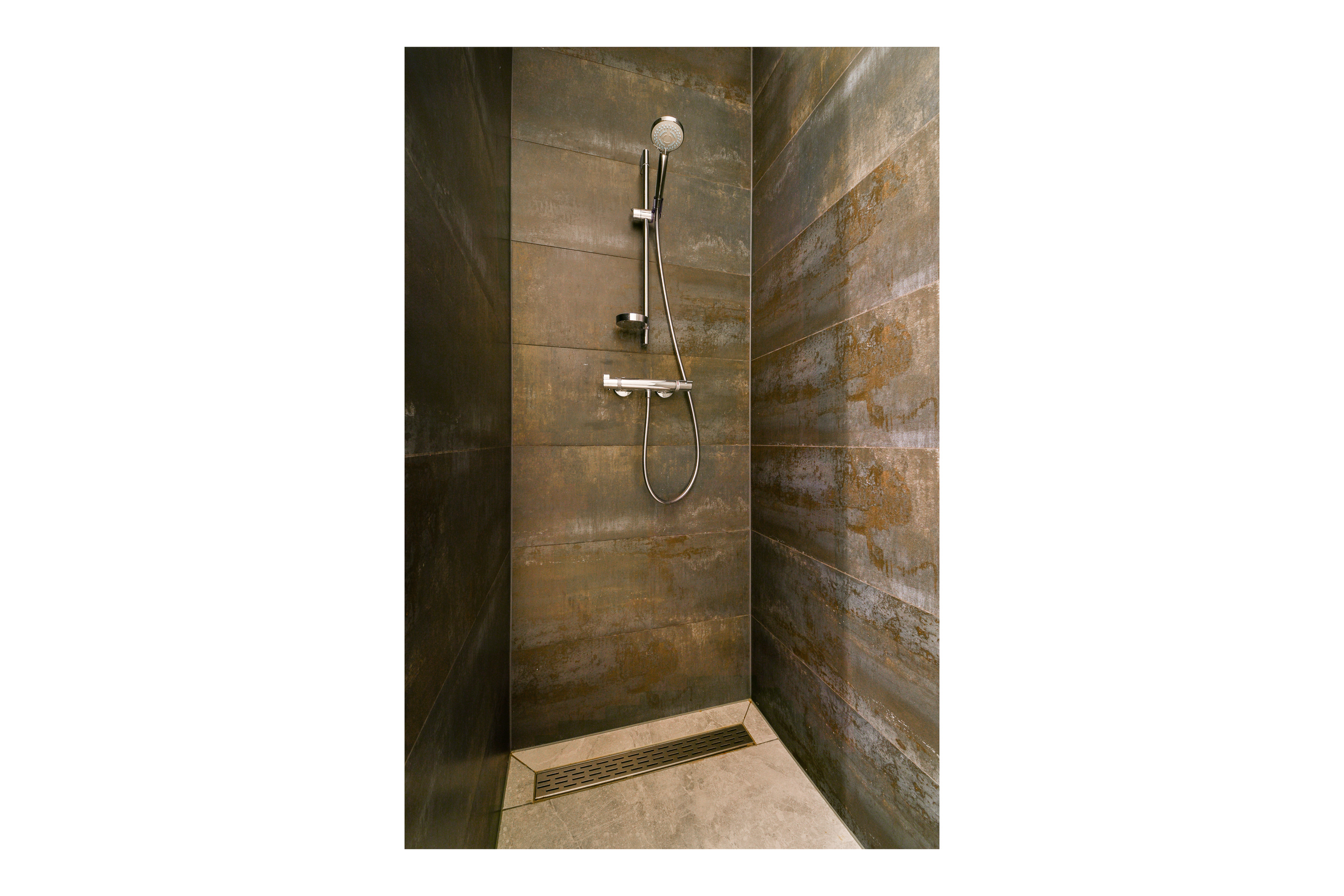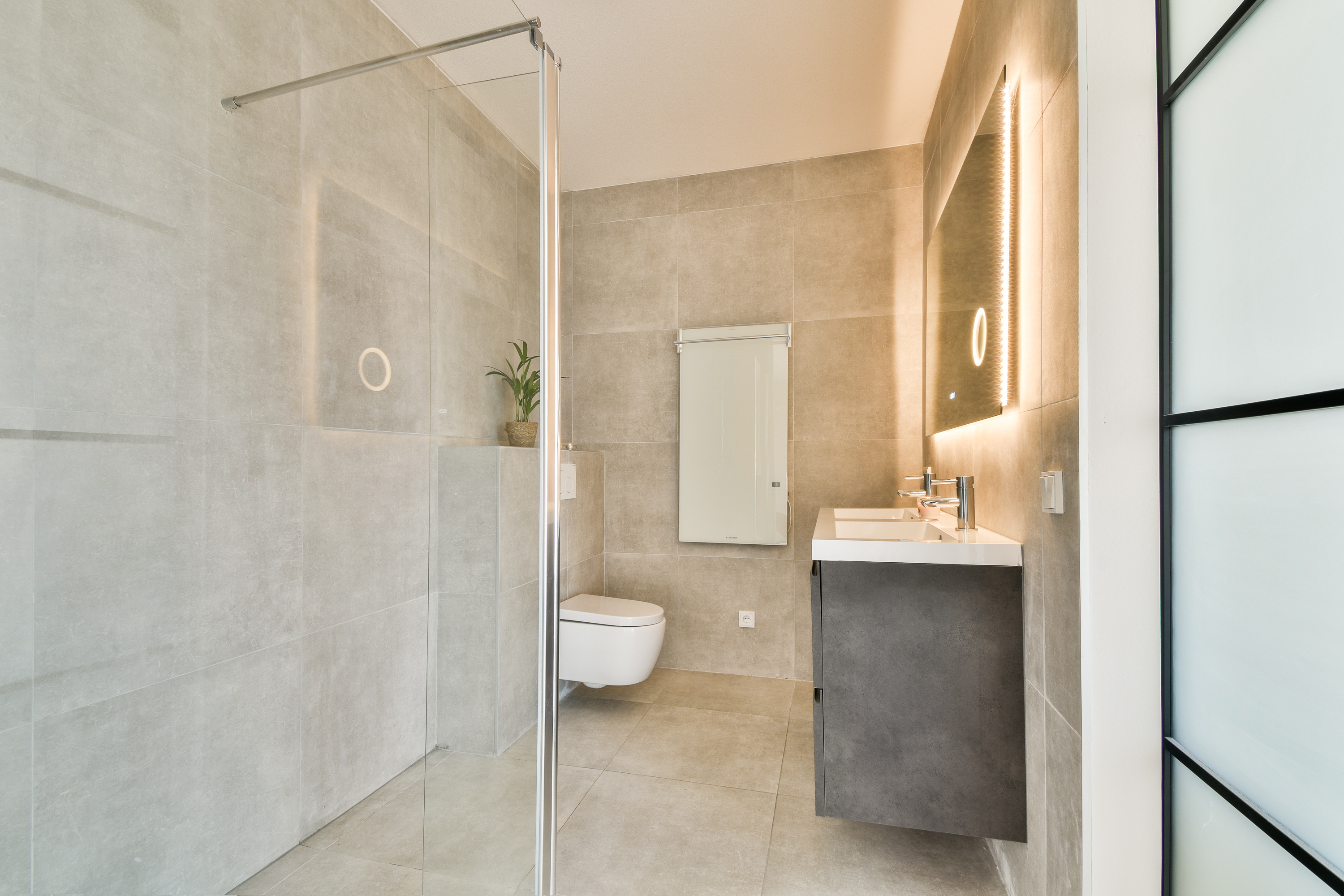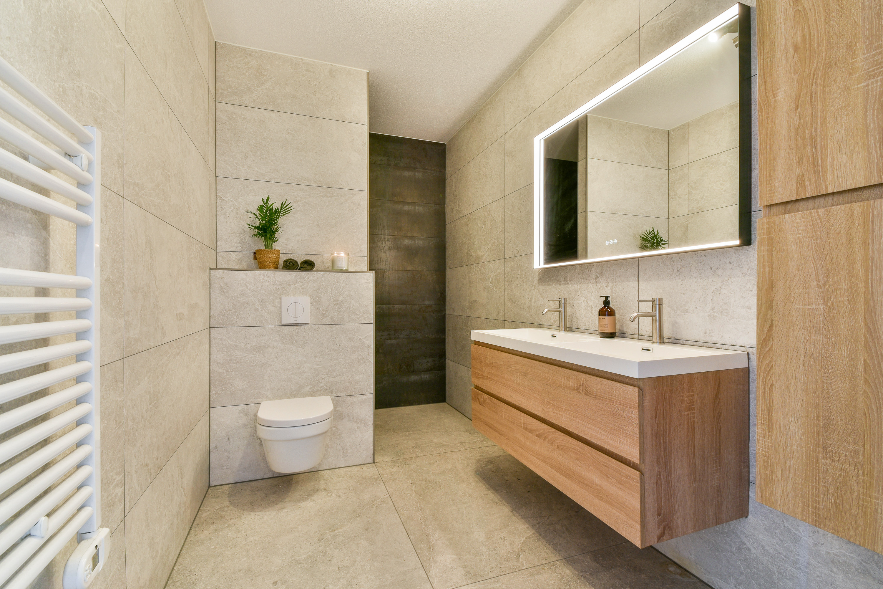 Bathroom: Fully tiled with double sink, walk-in shower, wall-mounted toilet, and towel radiator.