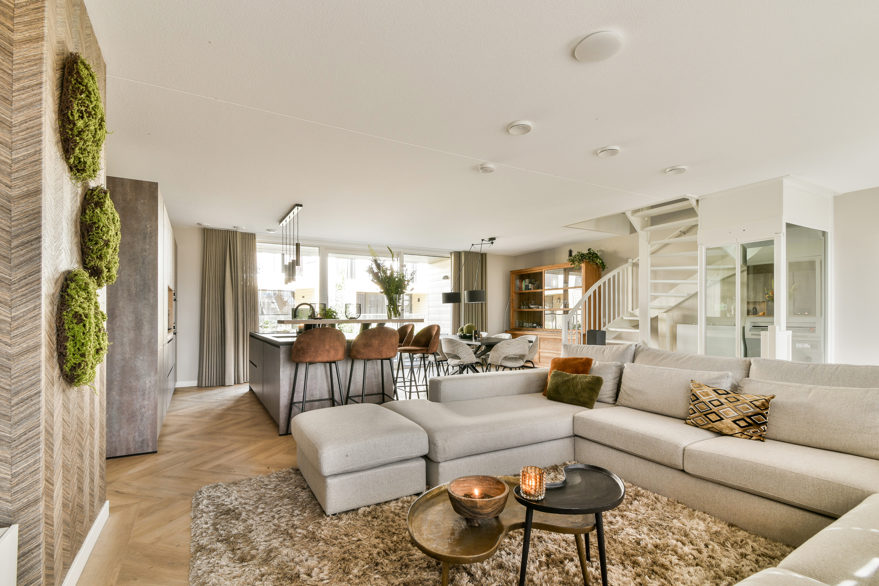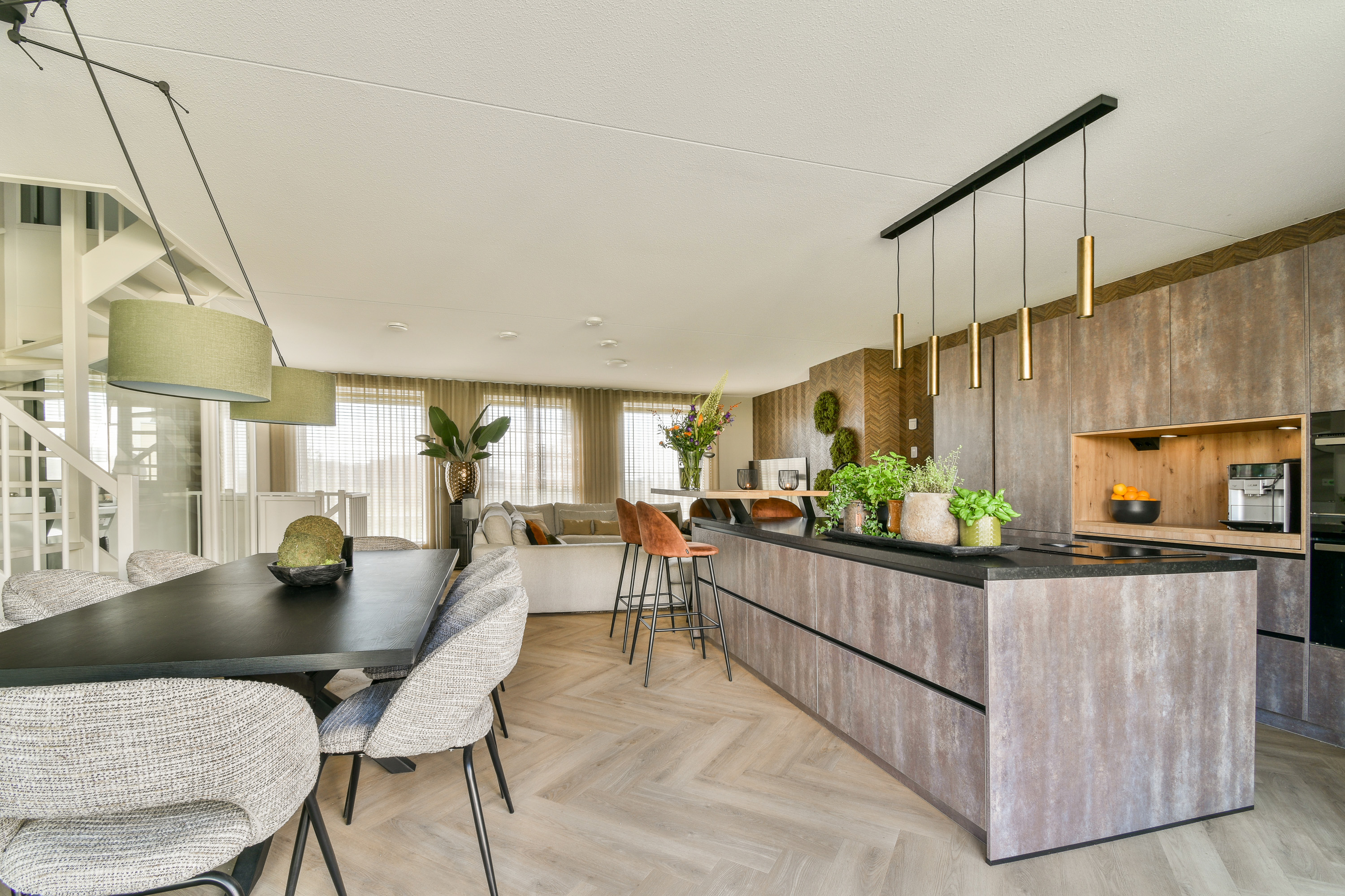First floor: stylish and spacious living room, luxury open kitchen with cooking island, and adjacent terrace.