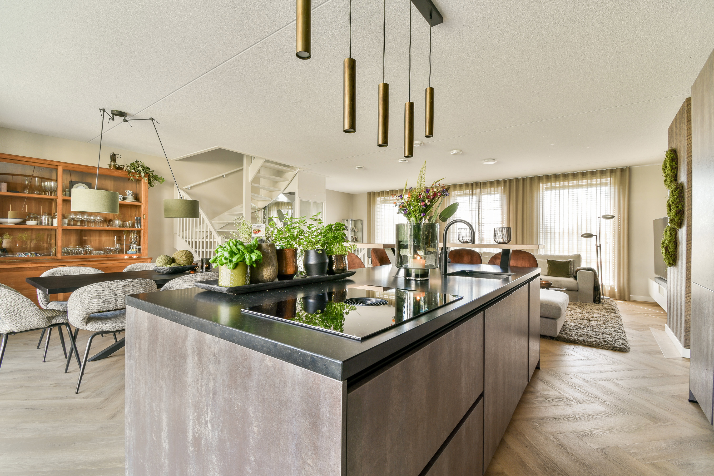 Luxury open-plan kitchen with island, featuring high-end appliances including Bora induction hob with integrated extraction, large fridge/freezer, oven, microwave, dishwasher, Quooker tap, and granite worktop with bar seating.