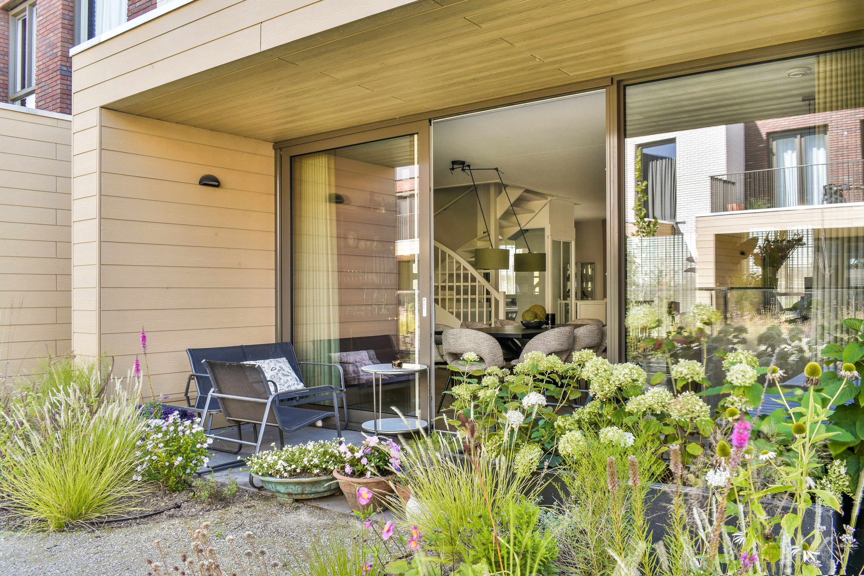 Accessible via sliding doors, overlooking a well-maintained communal garden.