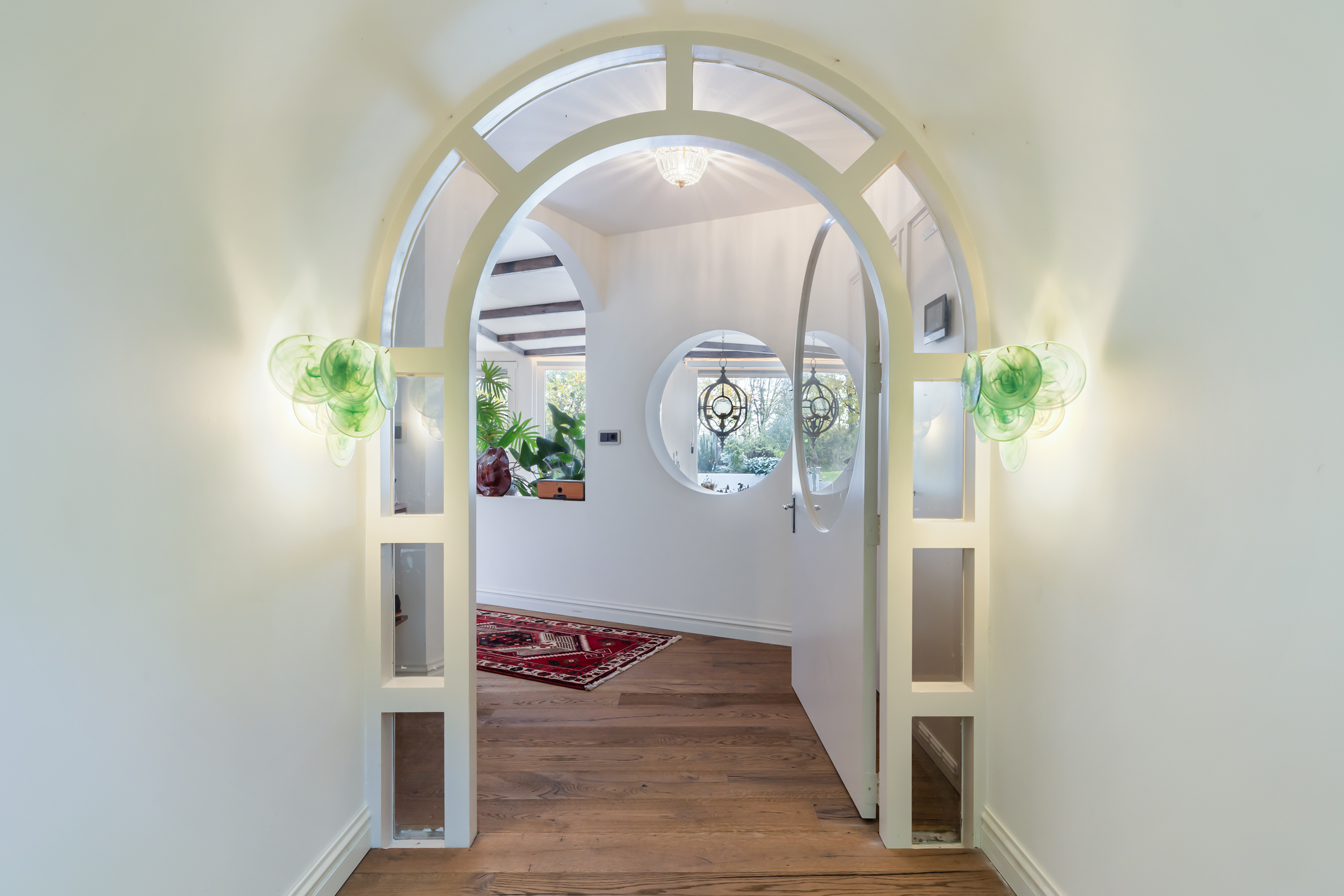 The main residence, measuring approximately 175 m², features a distinctive half-round front door with stained glass and an inviting entrance hallway.