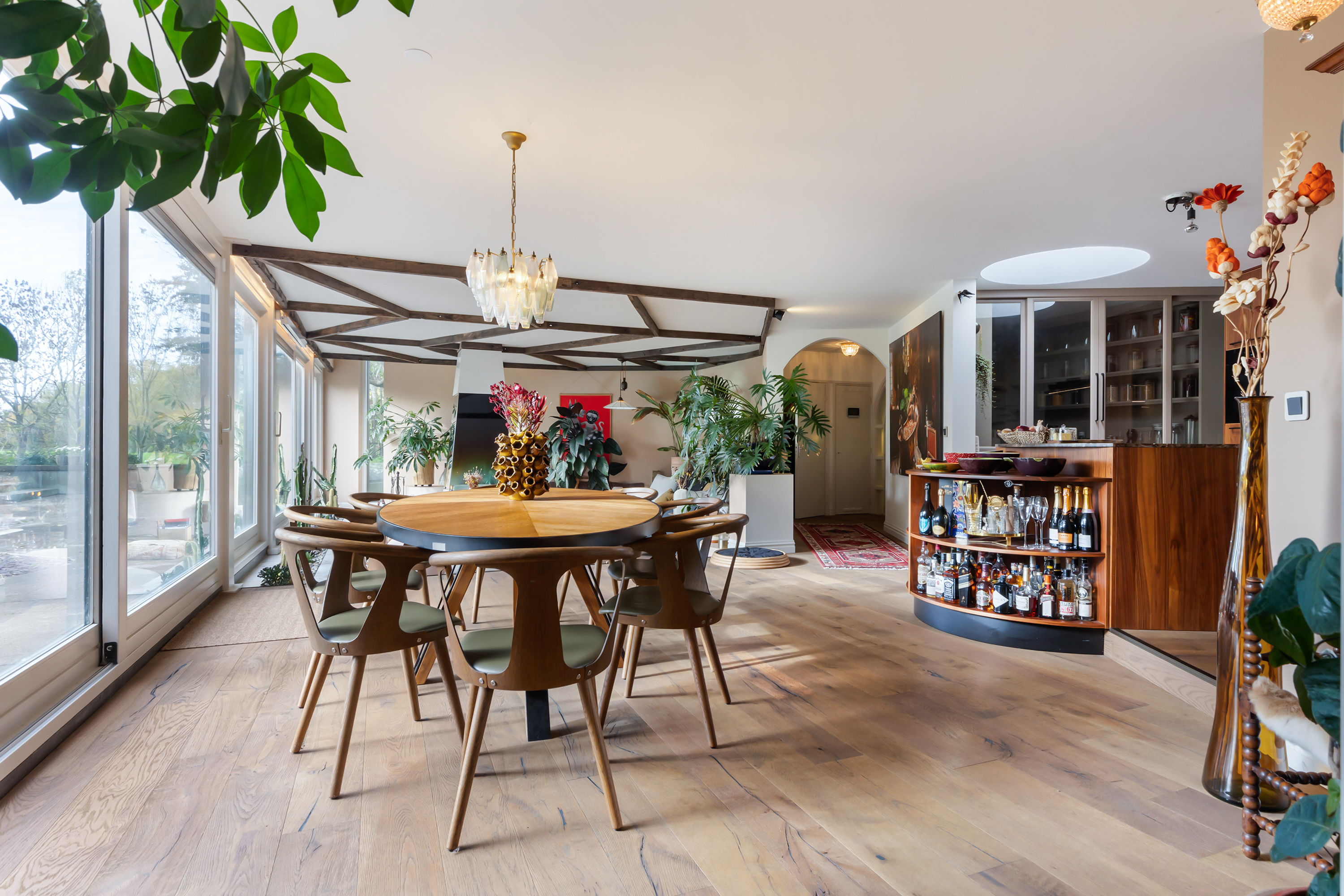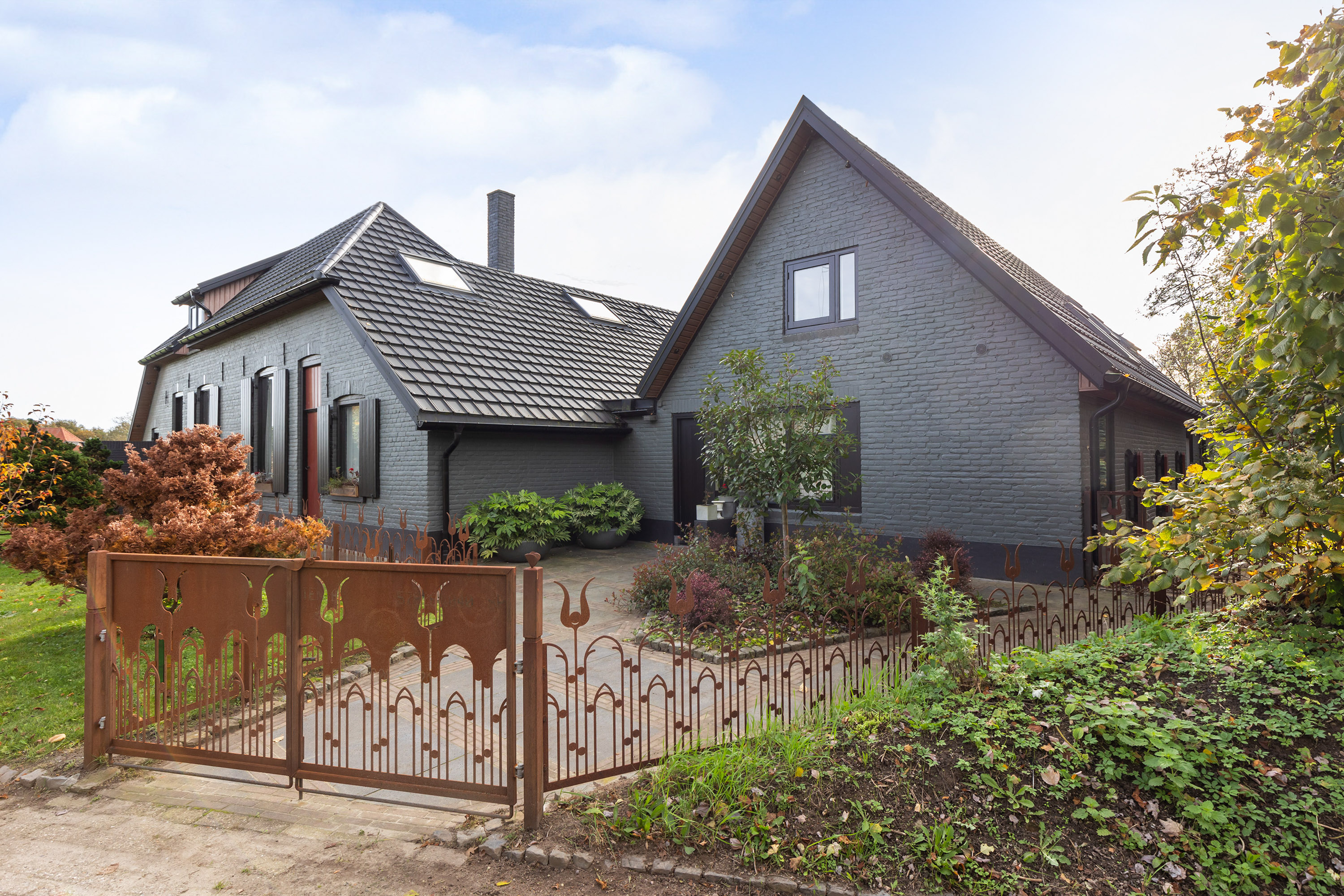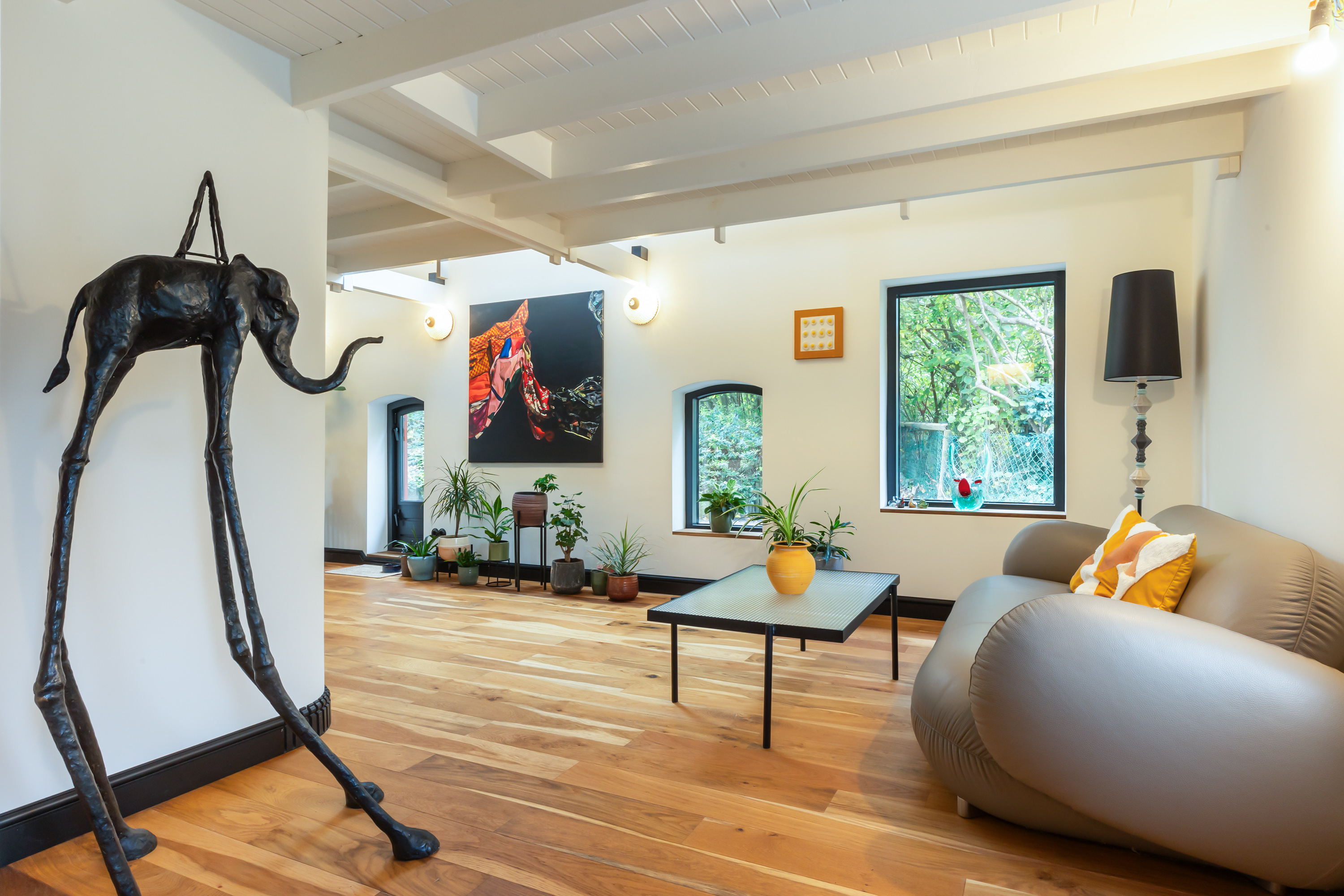 The exterior has been fully repainted, fitted with new roofing, and enclosed by a bespoke corten steel boundary with glass panels referencing the striking tulip artwork in the front garden. All windows have been upgraded with insulating glazing, and the interior has been redesigned into a hotel-chic living environment with warm tones, high-quality bespoke joinery and atmospheric lighting. The property is equipped with a comprehensive camera system and alarm installation both in and around the buildings.