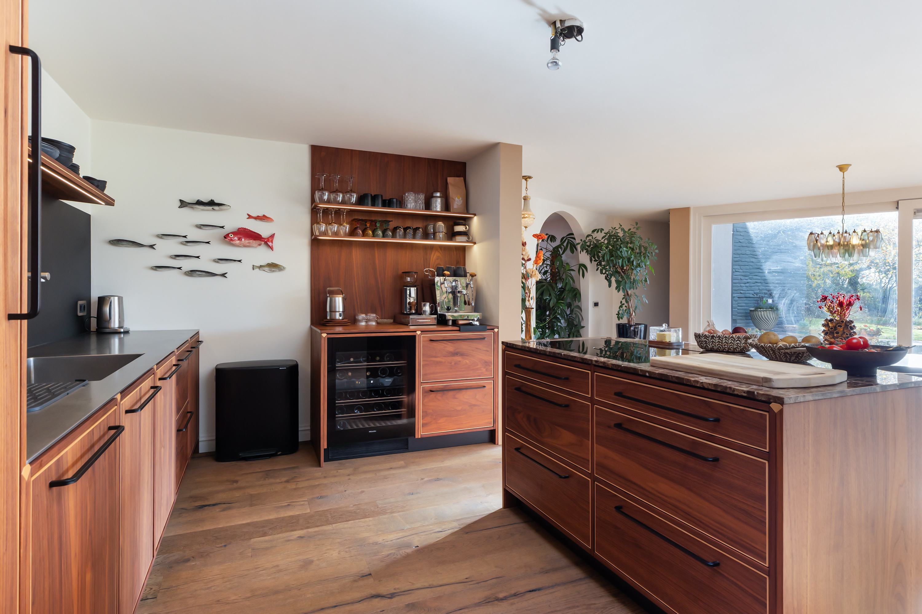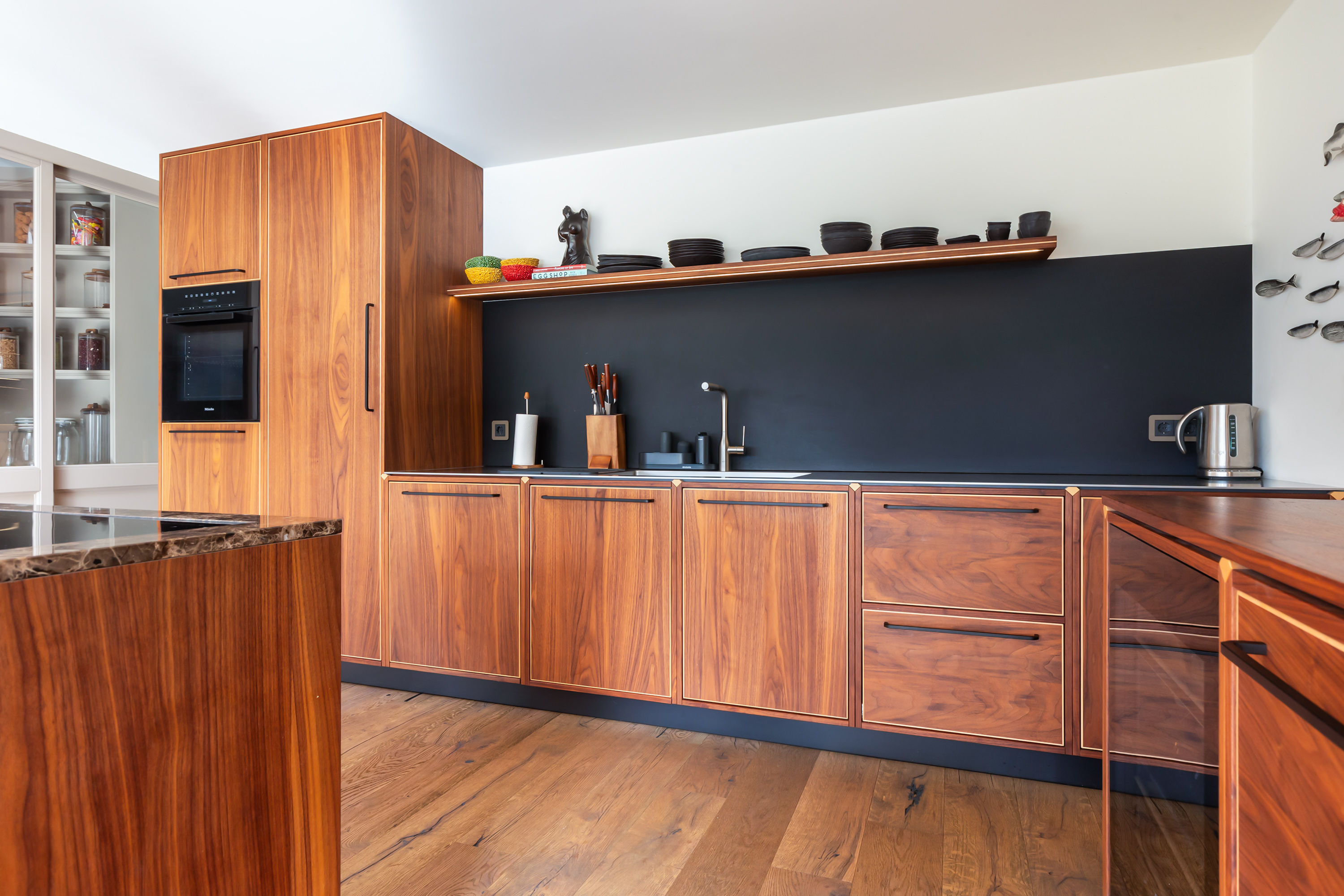 The living room, with oak flooring and open fireplace, is bright and spacious thanks to the glazed rear façade overlooking the terrace and garden. The bespoke kitchen, crafted in walnut with stainless steel worktops and Miele appliances, forms the heart of the home.