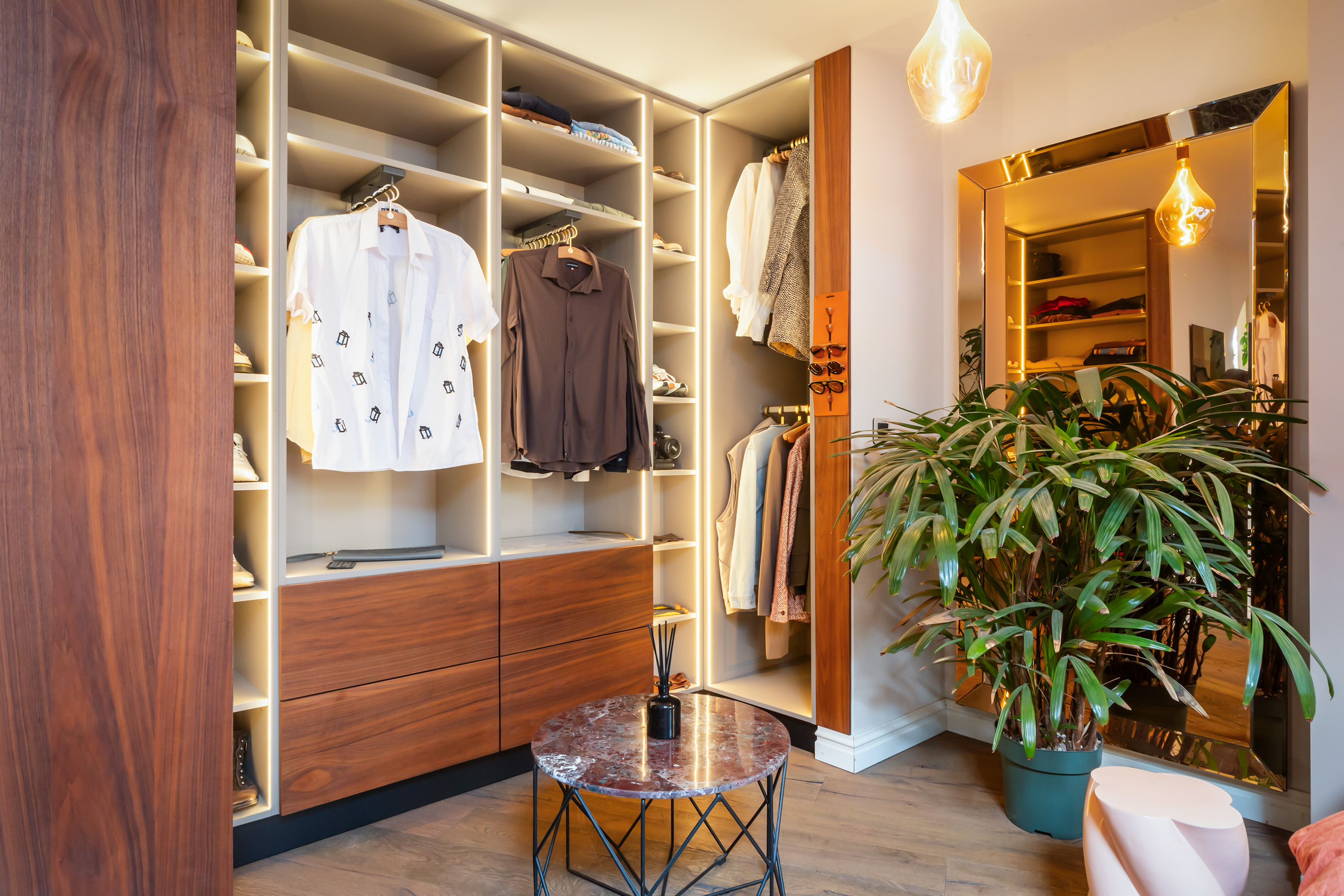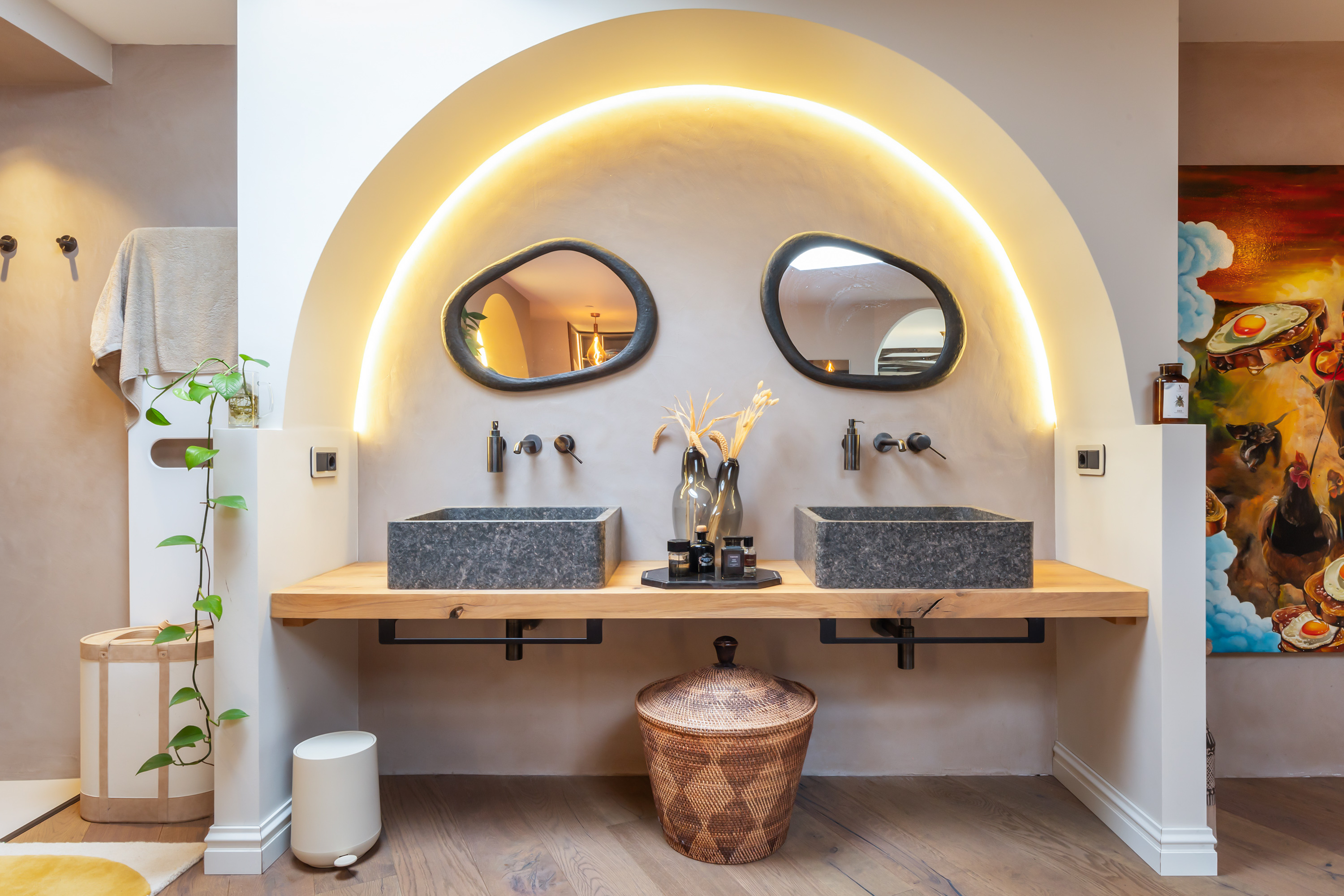 Additional rooms include a utility room, guest WC and a generous bedroom with walk-in wardrobe and luxury hotel-style bathroom. This bathroom features a double walk-in shower, granite basins, bespoke cabinetry and softly illuminated arched recesses that lend the space a warm, exclusive ambience.