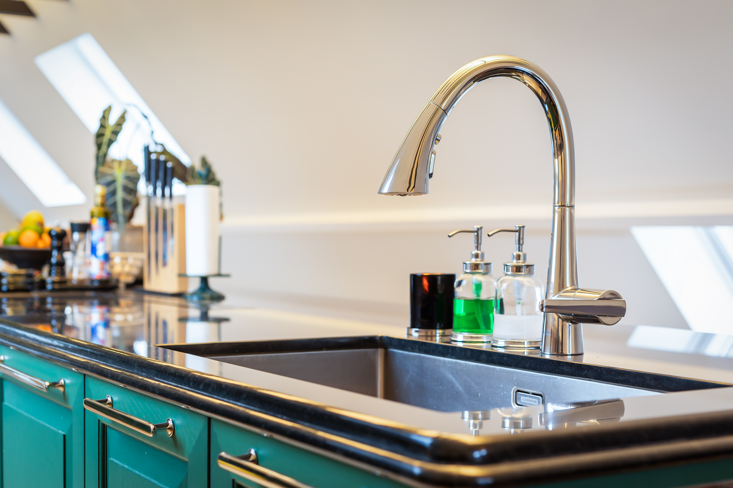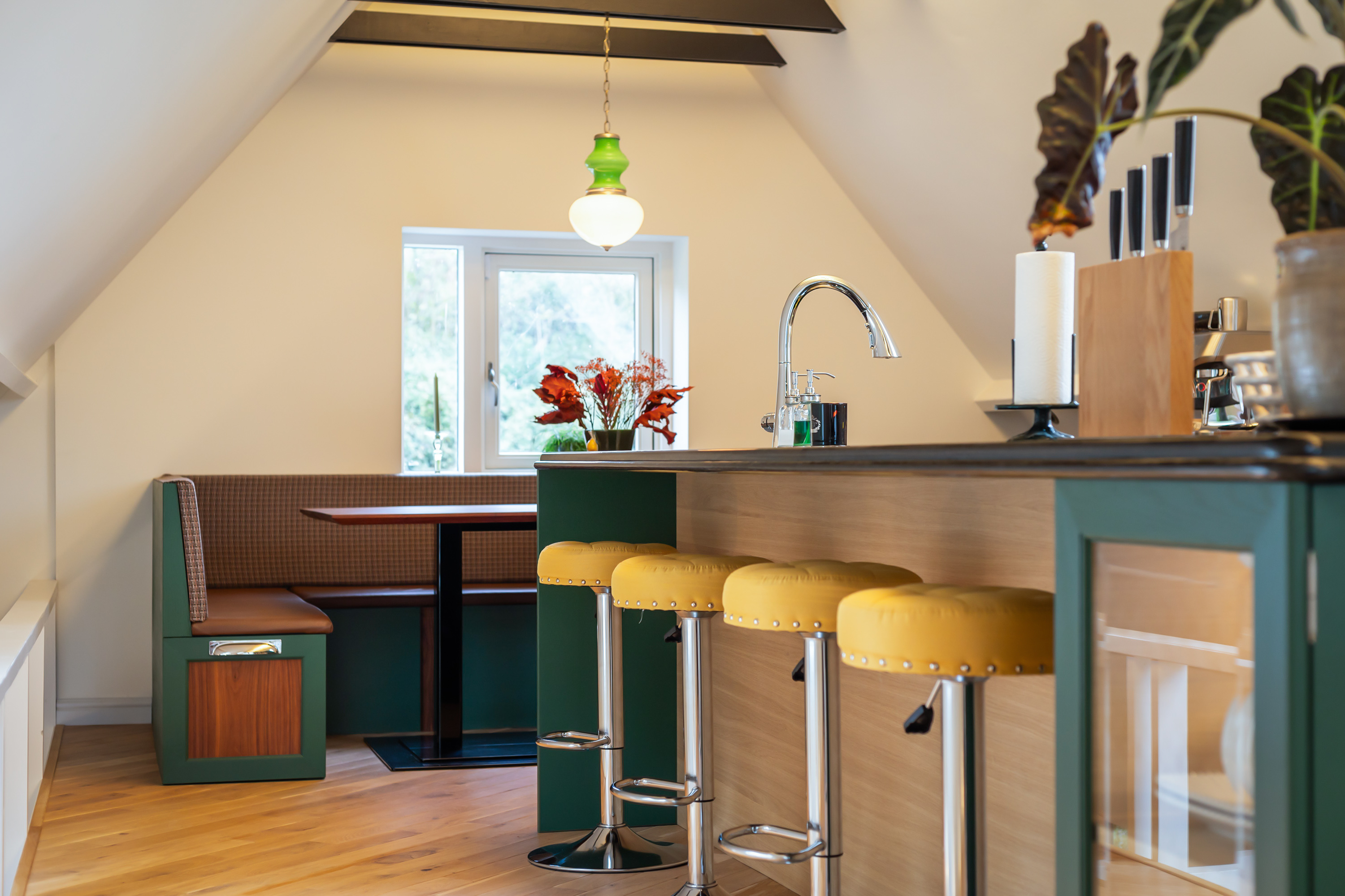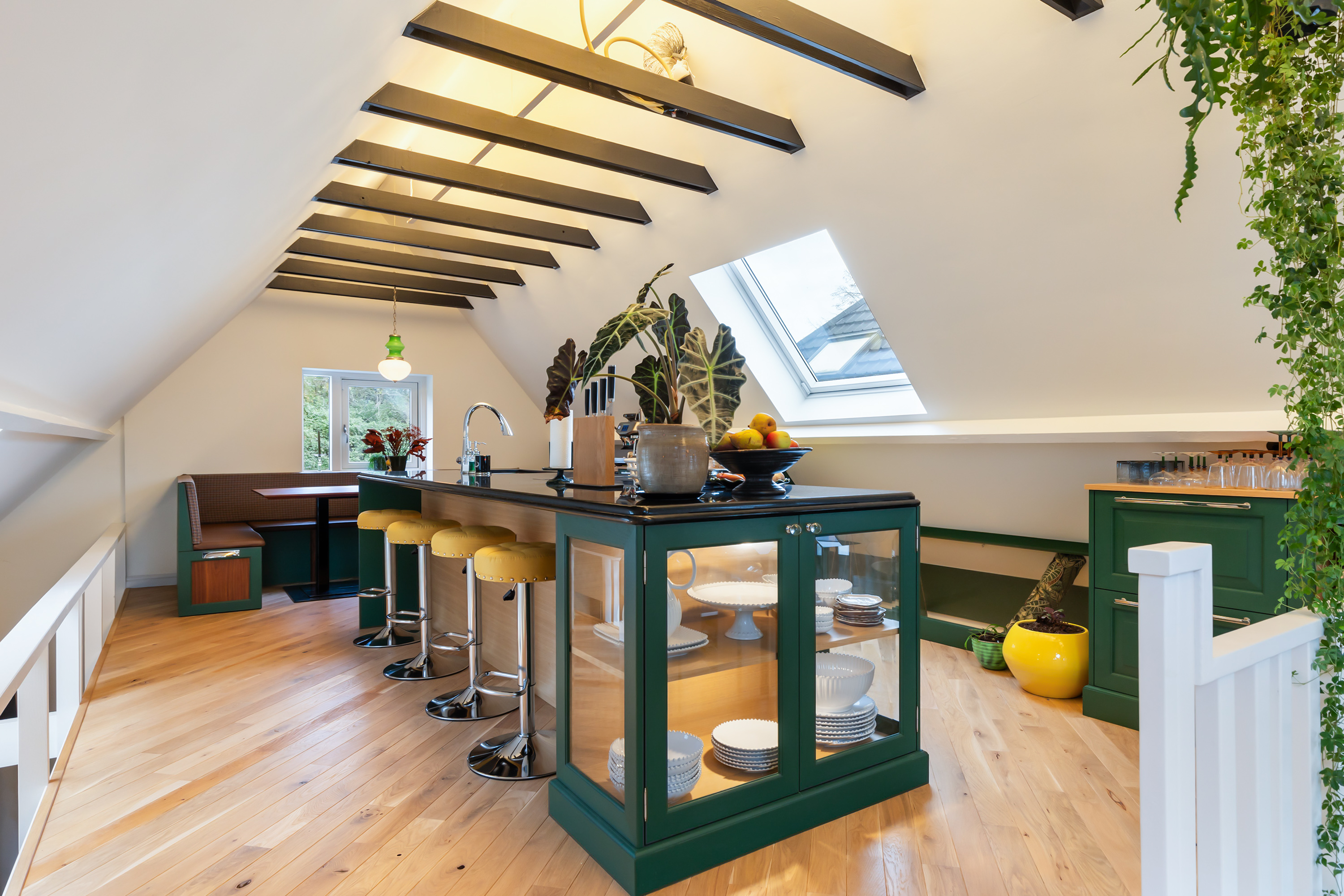 On the mezzanine level is an atmospheric kitchen-diner featuring oak cabinetry in a woodland green tone, granite worksurfaces and Miele appliances. At the front is a bright dining area, while the rear offers a cosy TV room with French doors opening onto the spacious roof terrace. Here, you can enjoy panoramic views across the garden and fields – an ideal spot to unwind or dine in the evening sun.