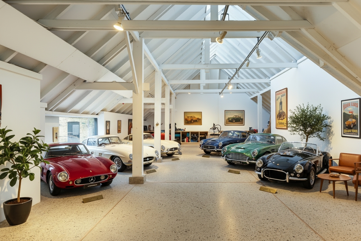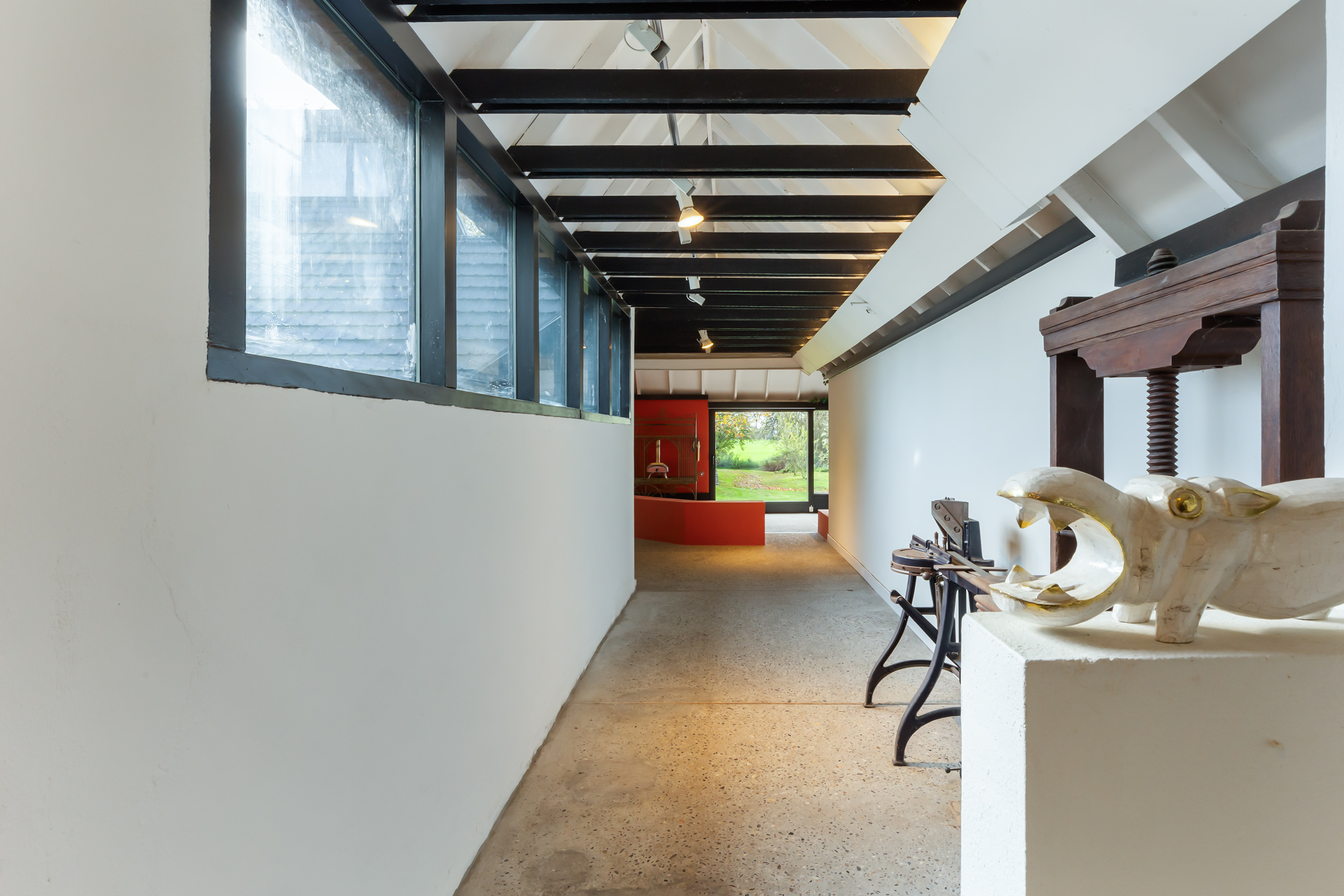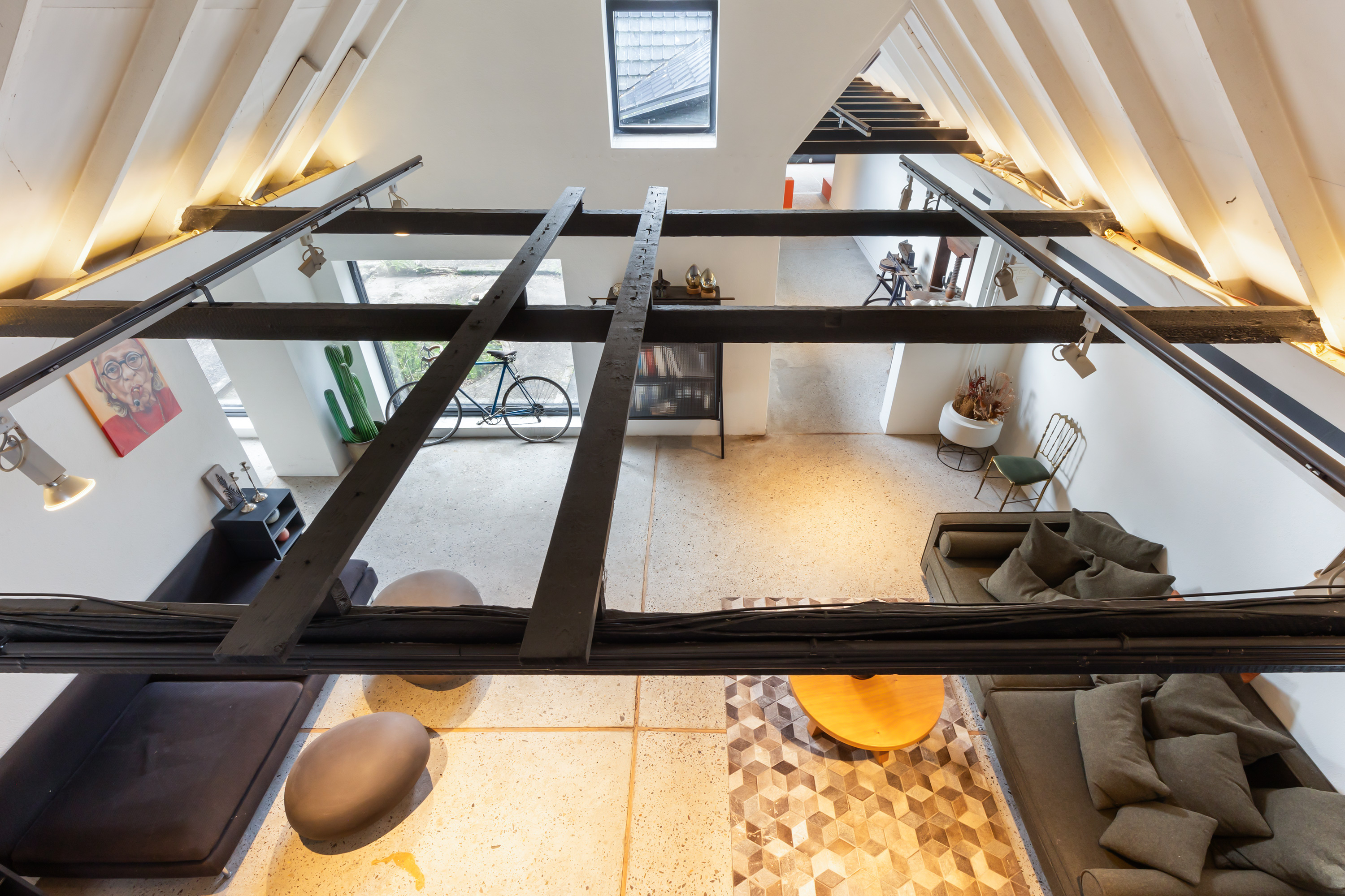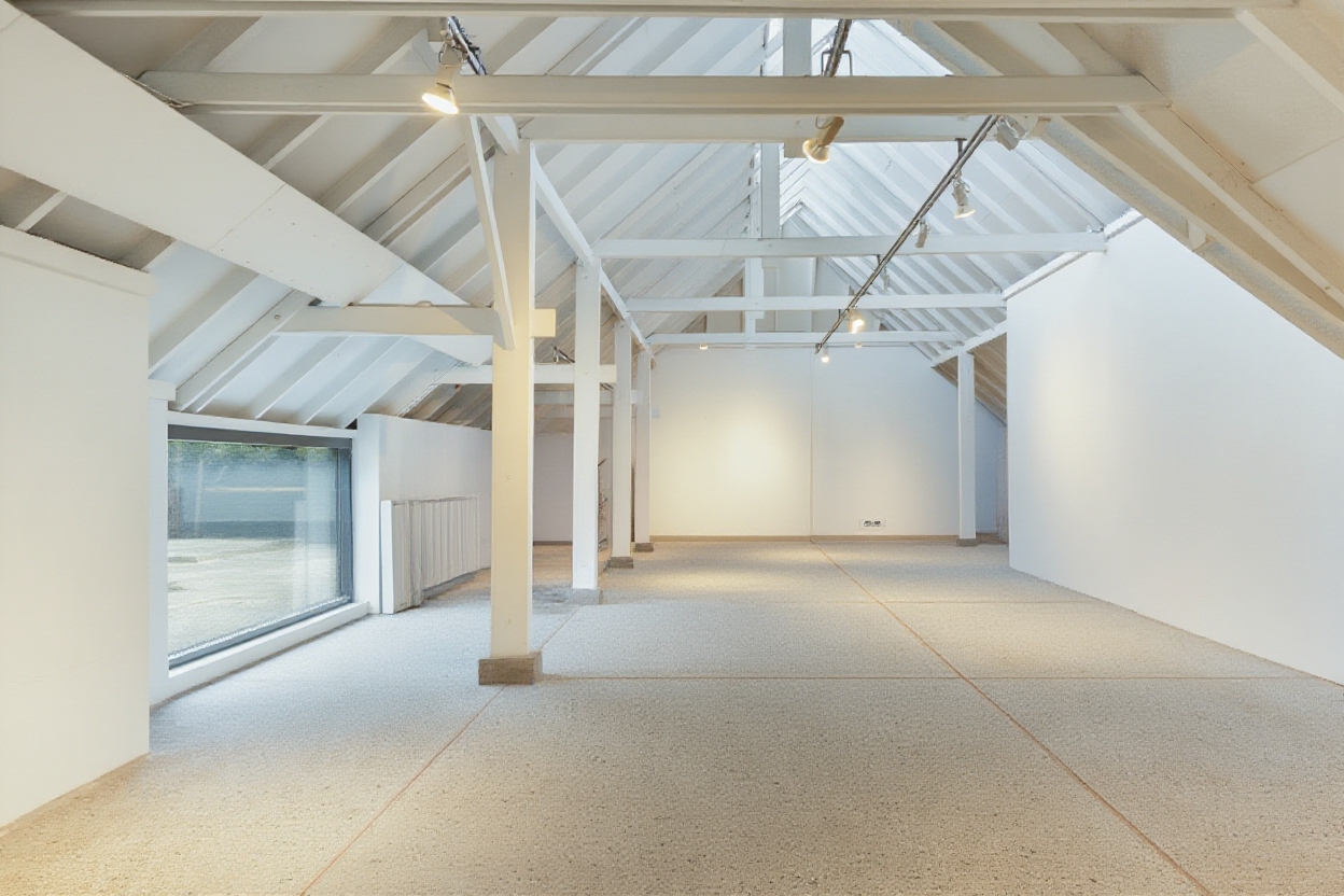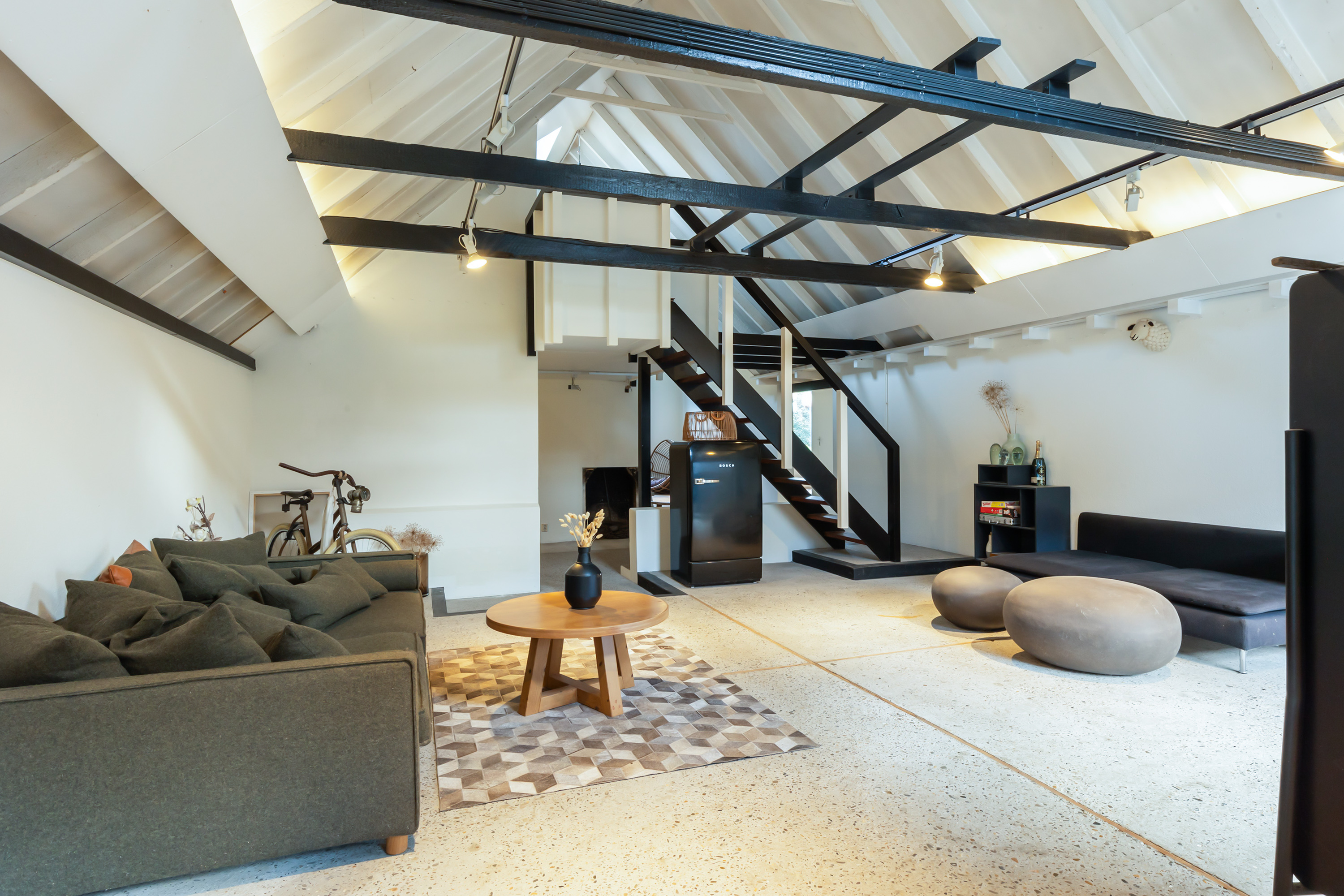 The adjoining 445 m² commercial building offers countless possibilities: an atelier, gallery, showroom, office or workshop. Its soaring ridge height with black timber trusses, generous proportions and large windows create a striking atmosphere of craftsmanship and character. The building includes its own entrance, office, pantry and WC. The mezzanine floor offers further space for guest accommodation, an atelier or workspace.
