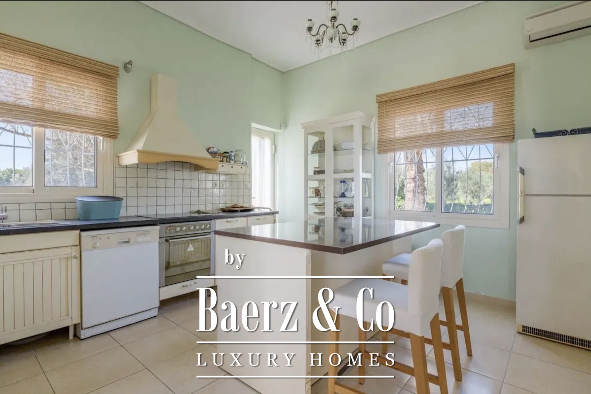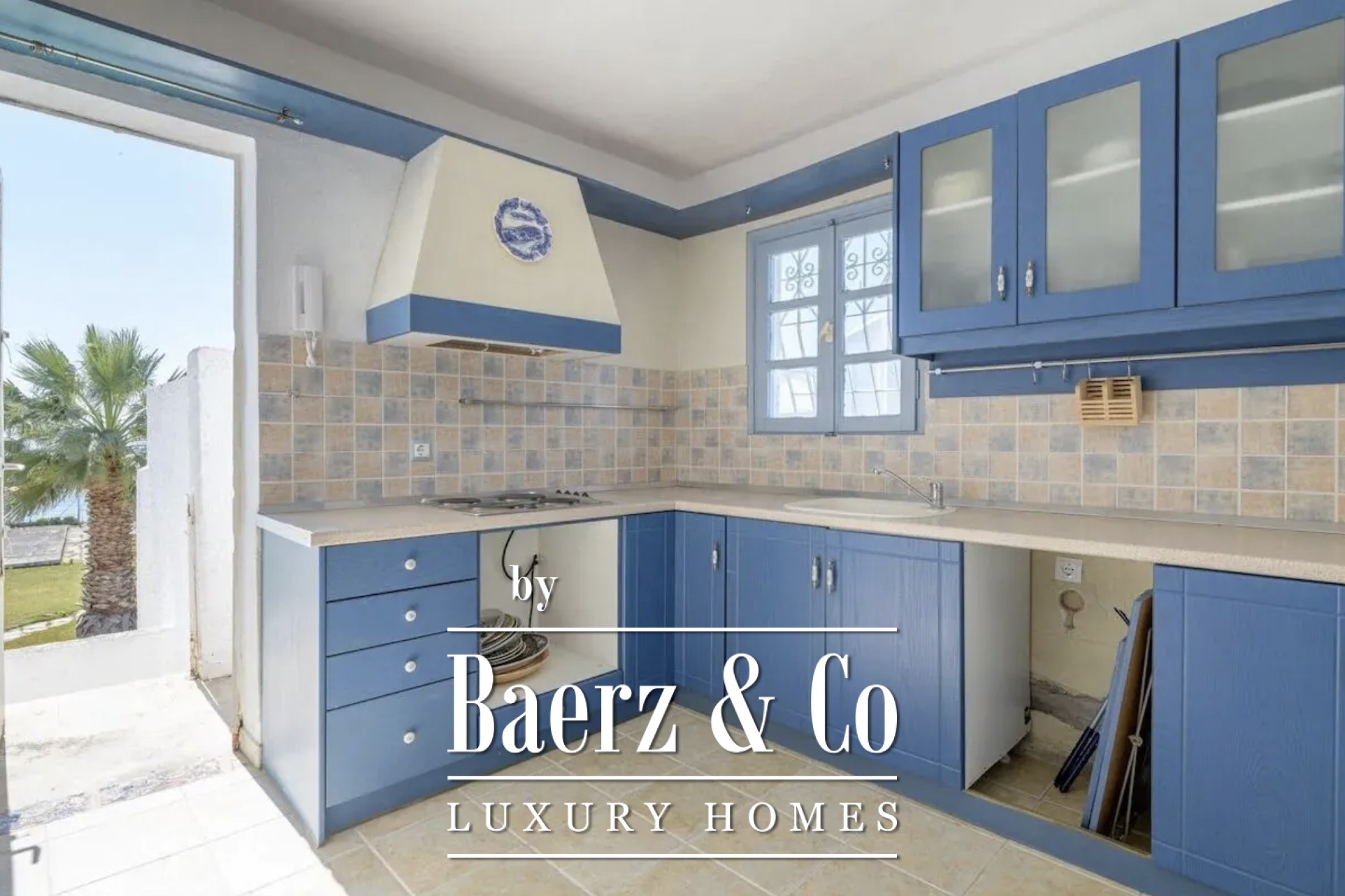 This seafront villa Eretria stands just forty meters from the pristine sandy beach, offering uninterrupted sea views and absolute privacy within one of Eretria’s most desirable coastal enclaves. Set on a generous 6,000 m² plot and encompassing a total of 250 m², the villa is structured across two levels, each with their own independent entrances, allowing for flexible living and guest accommodation.