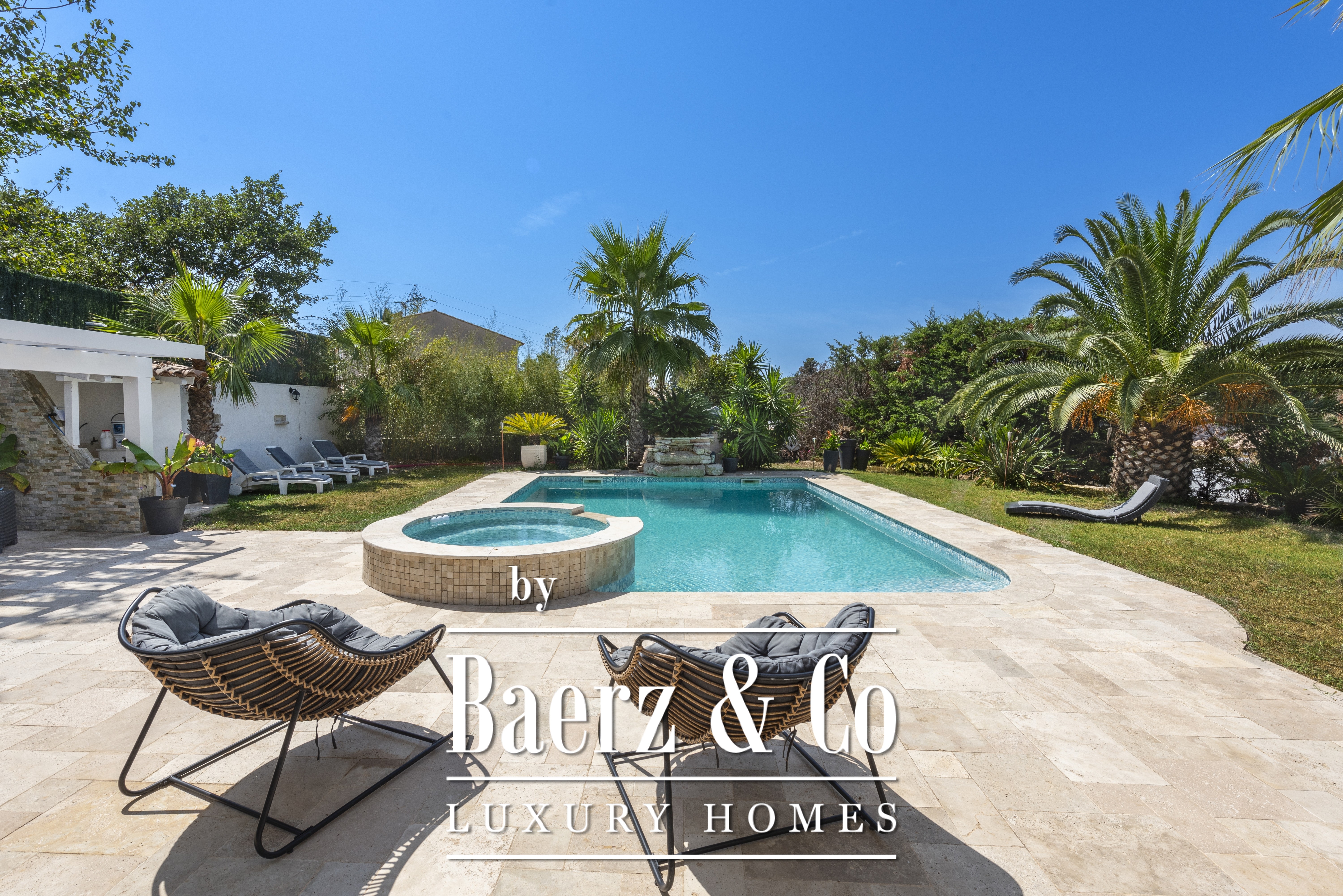 Villa Fréjus presents a 172 m² villa for sale, designed around spacious volumes and refined light, set within a private and secure estate. This property is positioned in a quiet residential environment, while offering immediate access to amenities including shops, schools and main roads. The villa Fréjus opens with a luminous living area and a fully equipped open-plan kitchen, structured for effortless hosting. Facing west, the space extends naturally onto an expansive terrace overlooking the pool and landscaped grounds. The sleeping quarters encompass four bedrooms, a large bathroom, a shower room and a functional laundry room. The setting reveals a 1,082 m² plot, arranged with both open and covered terraces, creating zones for summer dining, relaxation by the pool and a dedicated jacuzzi. Granite tile flooring, underfloor heating, reversible air conditioning and electric roller shutters highlight attention to quality and comfort. The villa offers both a garage and ample indoor and outdoor parking, supporting a lifestyle of privacy and ease. The energy class B rating reflects balanced modern efficiency.