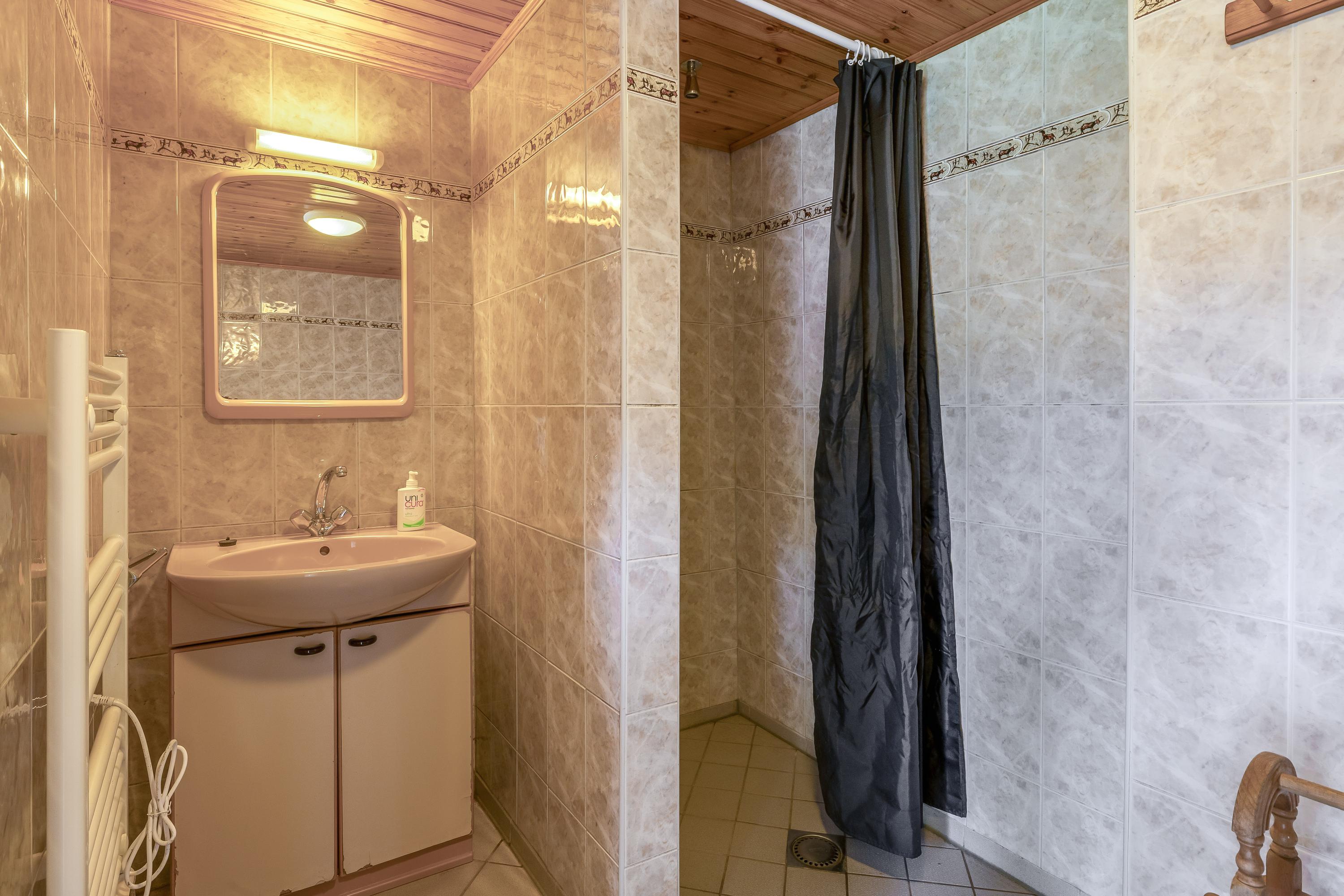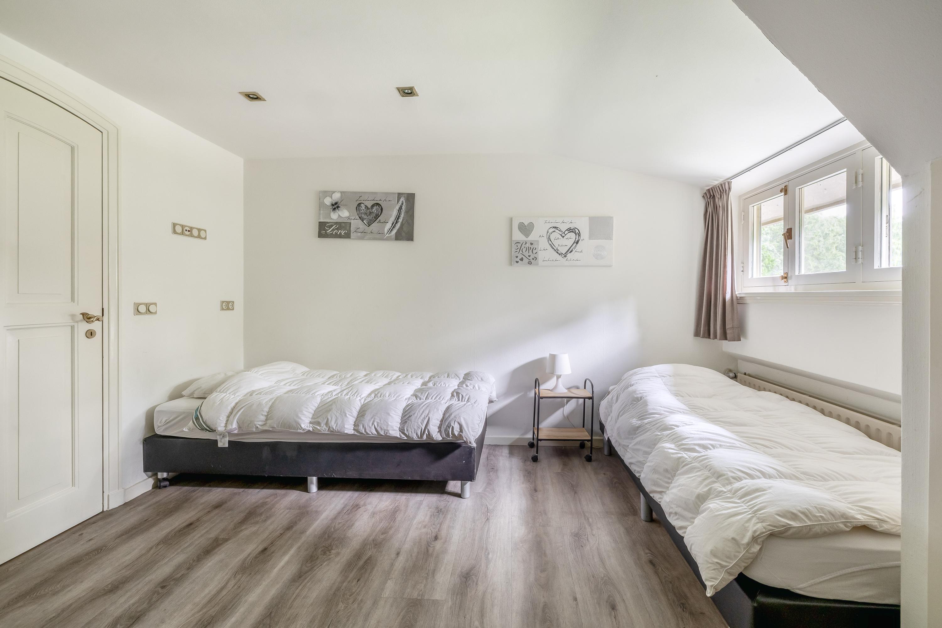 The country house exudes atmosphere and comfort. On the ground floor, you will find an impressive entrance hall with a mezzanine, a spacious living room with a sitting area with a cosy fireplace, a dining area and a separate television room, a spacious kitchen, a utility room and a bedroom with an en-suite bathroom. Authentic details such as wooden beamed ceilings and natural stone floors enhance the rural character. On the first floor are four large bedrooms, one with an en-suite bathroom, a second bathroom and a separate toilet. All rooms have natural light, washbasins and two bedrooms have built-in wardrobes – ideal for guest accommodation or family living. In the basement you will find even more space: an extra bedroom, a recreation/party/hobby room with bar, bathroom, storage room, central heating system and separate entrance to the outside. This makes the basement ideal as guest accommodation or a practice space.