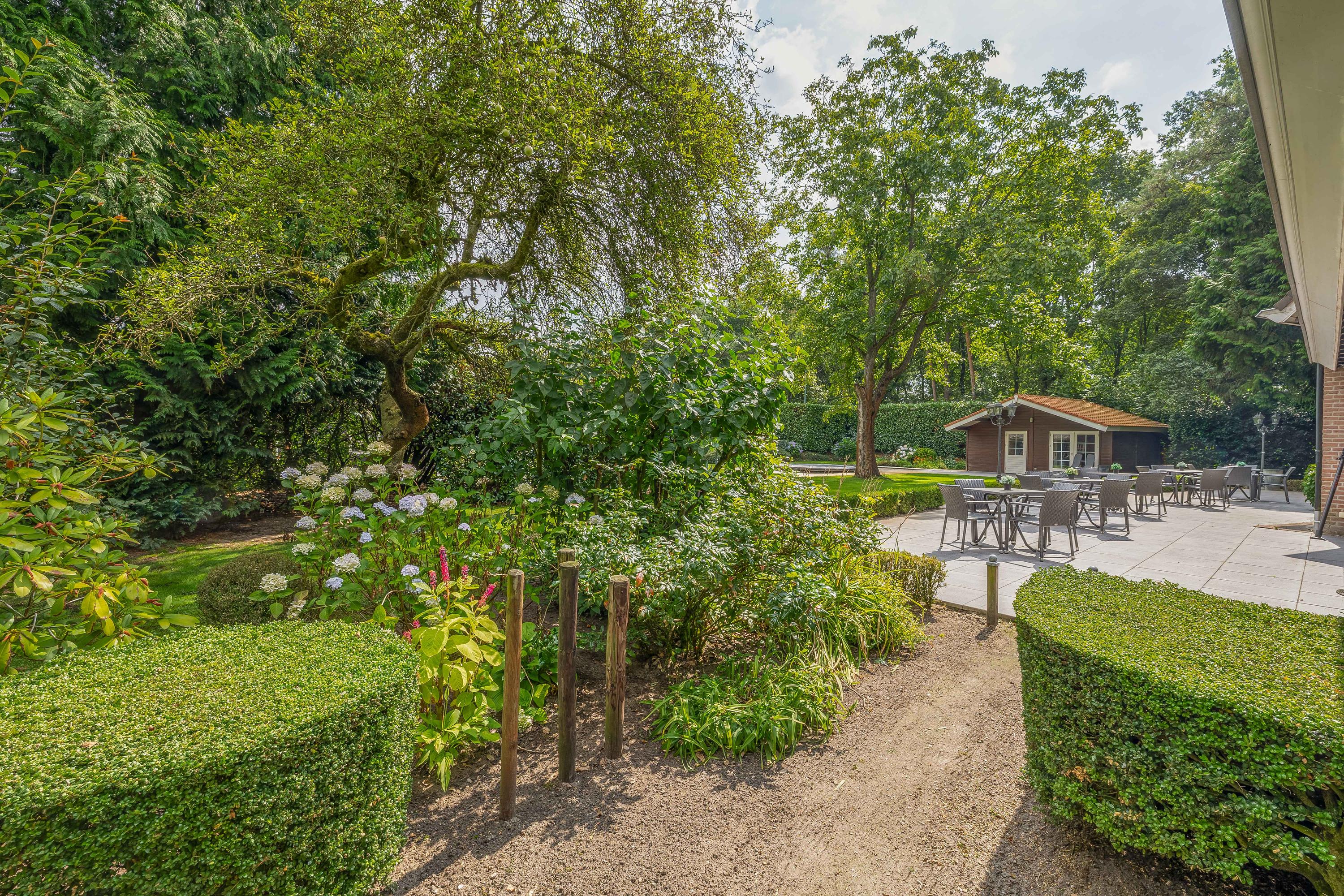Surrounding the house is a beautifully landscaped garden with a large terrace, playground, mature trees and plants, and a beautiful view of the adjacent meadows. The garden shed has been converted into a wellness area with a sauna, relaxation room, bathroom and toilet – a perfect place to relax. The former swimming pool is currently used as a sandpit with a trampoline, but can easily be restored to its former glory. The garden blends seamlessly into the surrounding private woods, ideal for a walk or a ride on your own property.