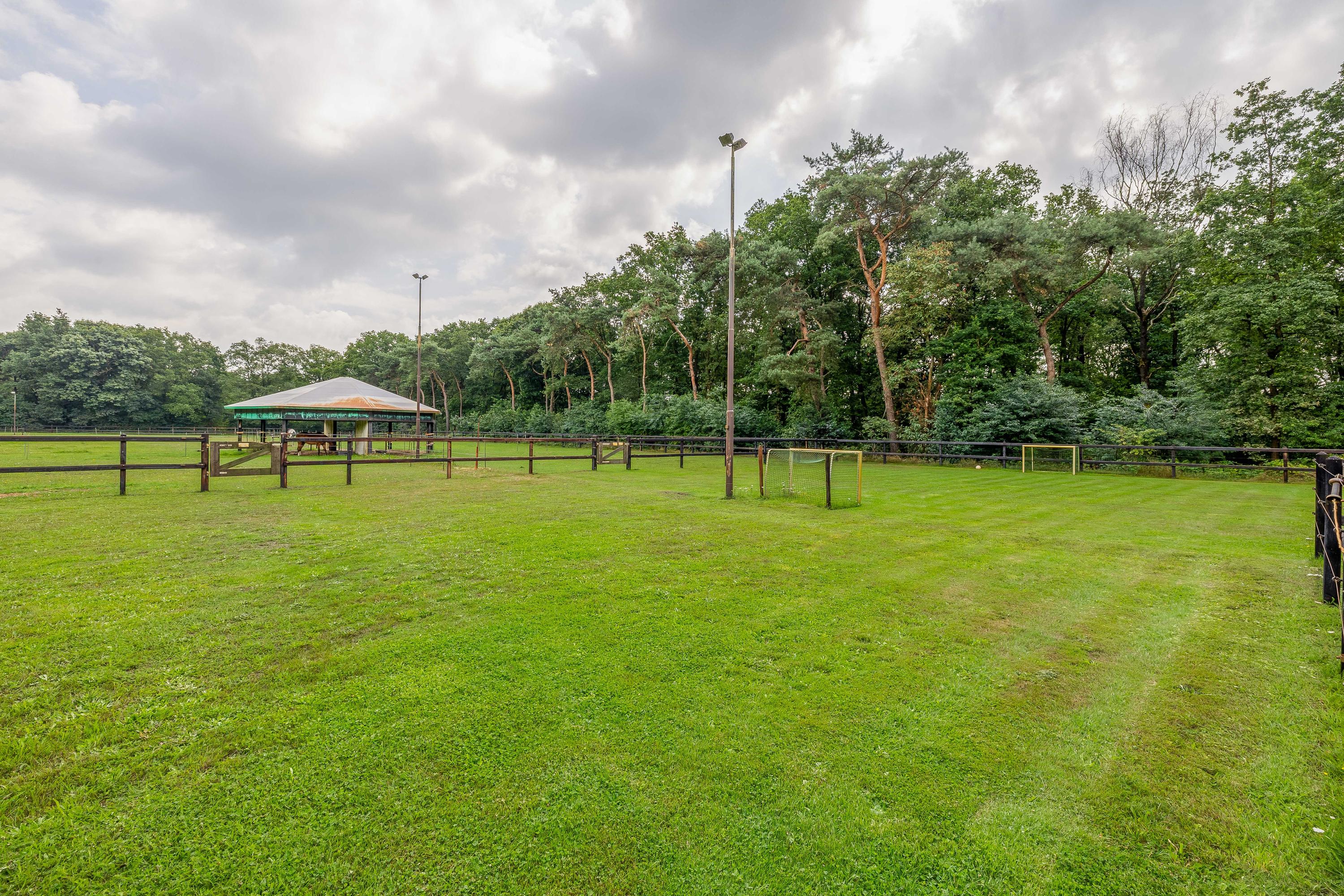 The detached horse stable has five stalls with outdoor hatches and weave racks, a hayloft, pasture access and additional facilities such as a shelter and a drained outdoor arena (20 x 40 metres) with professional flooring. Everything has been taken care of down to the last detail, including lighting, sprinklers and fencing.