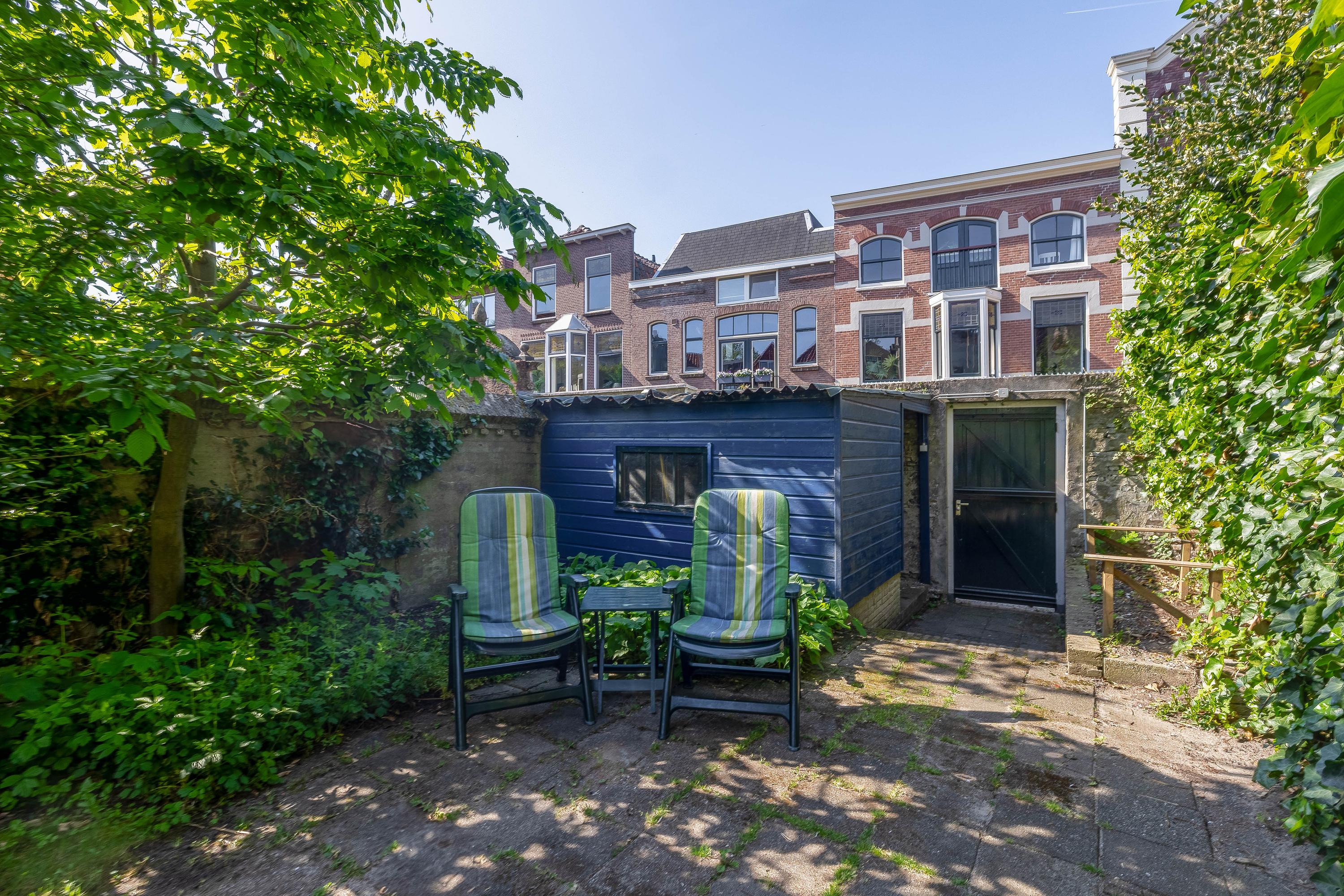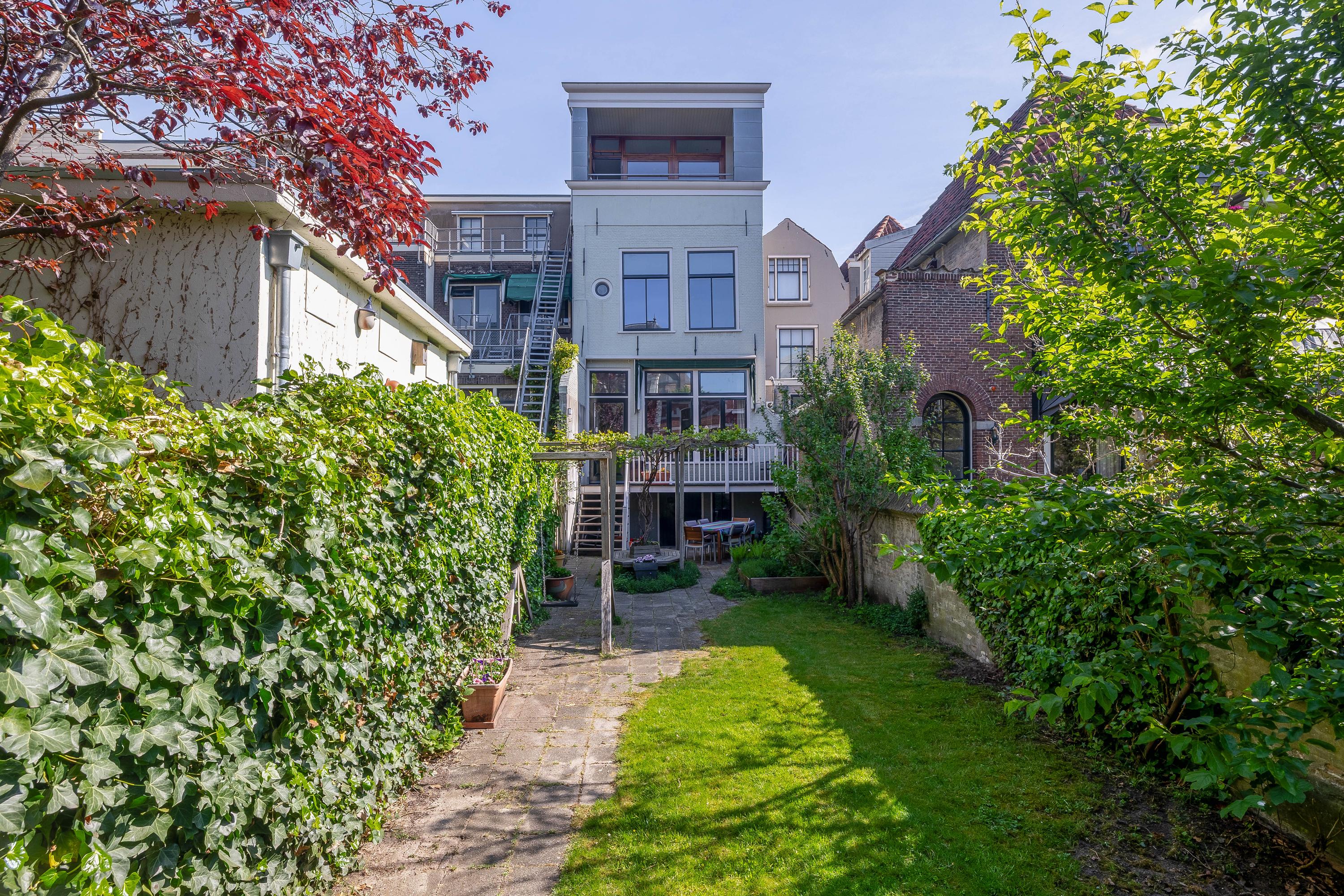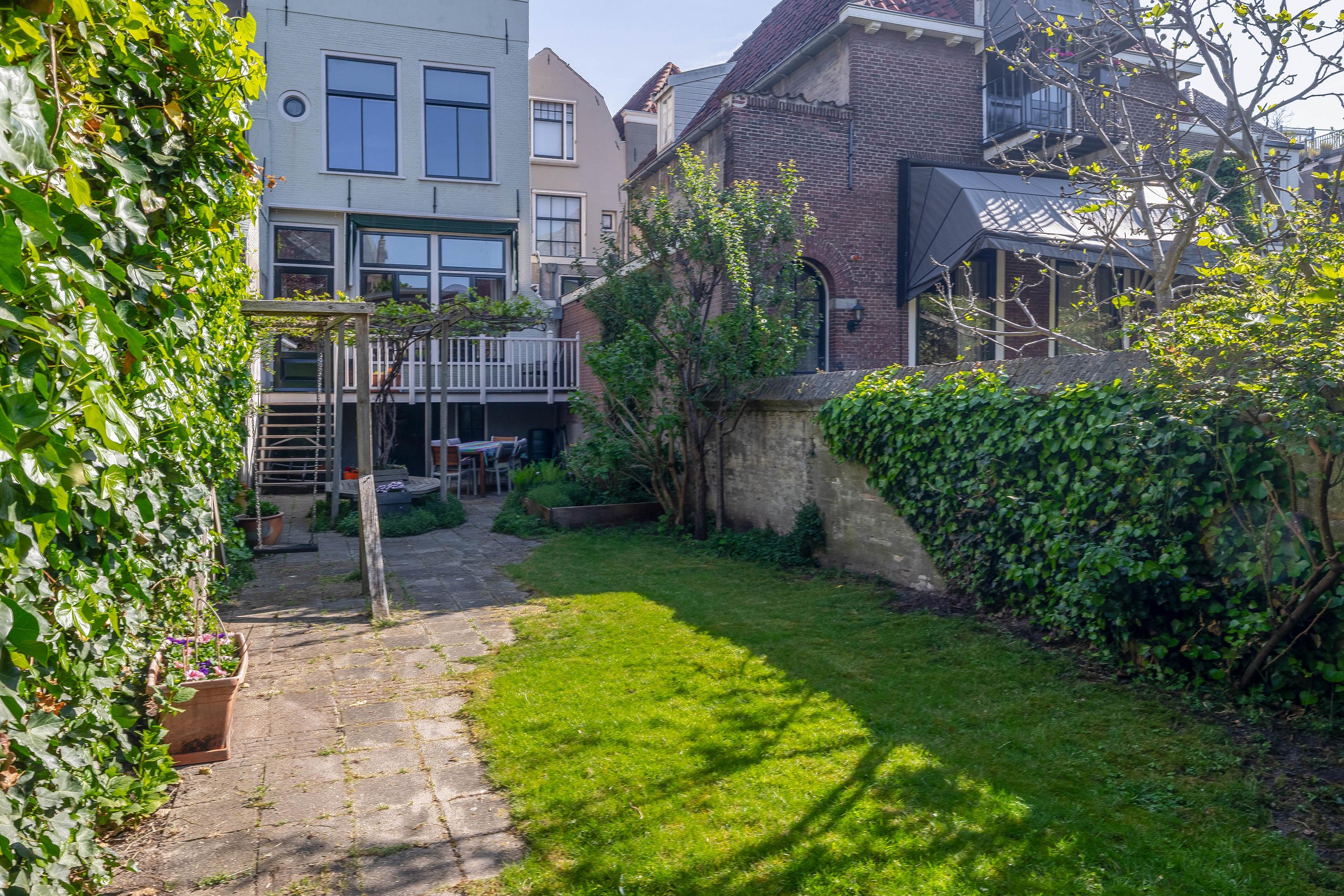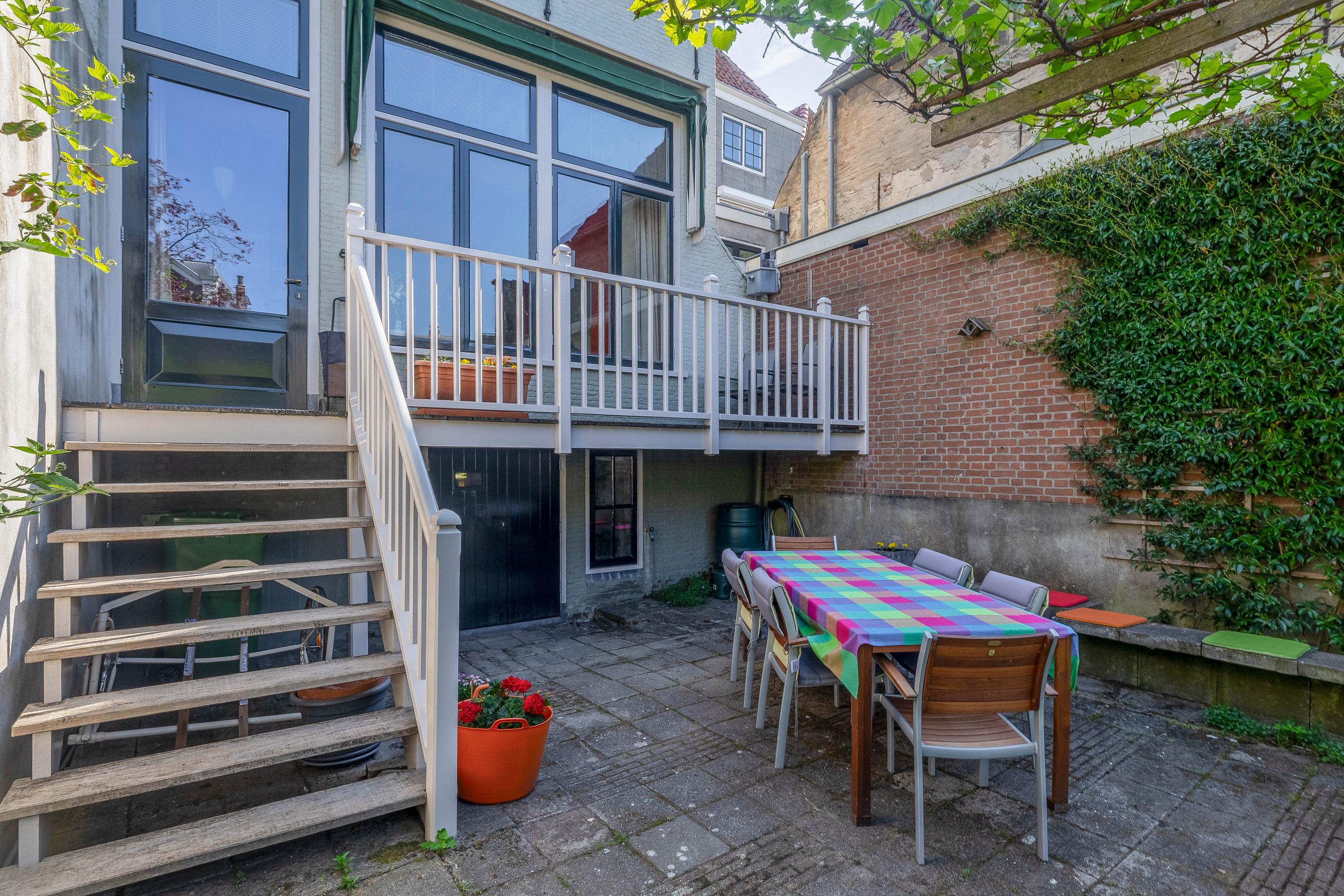 The sunny and charming garden is over 25 meters deep and includes multiple terraces, access to the cellar, a shed at the rear of the garden, a wooden footbridge at the rear (accessible via Peperstraat), and a restored city wall. From both the garden and the house, you have a fantastic view of monumental Gouda.