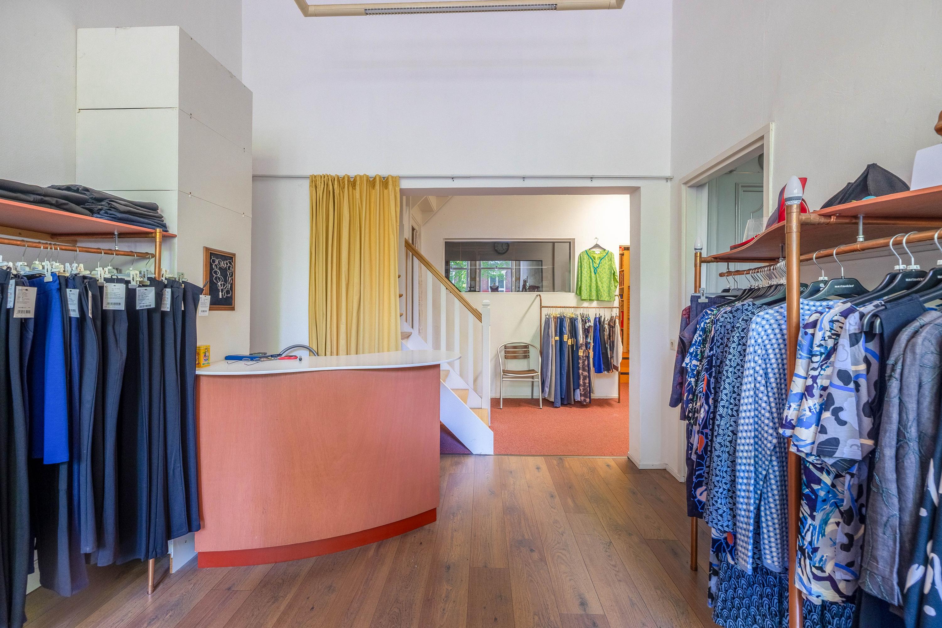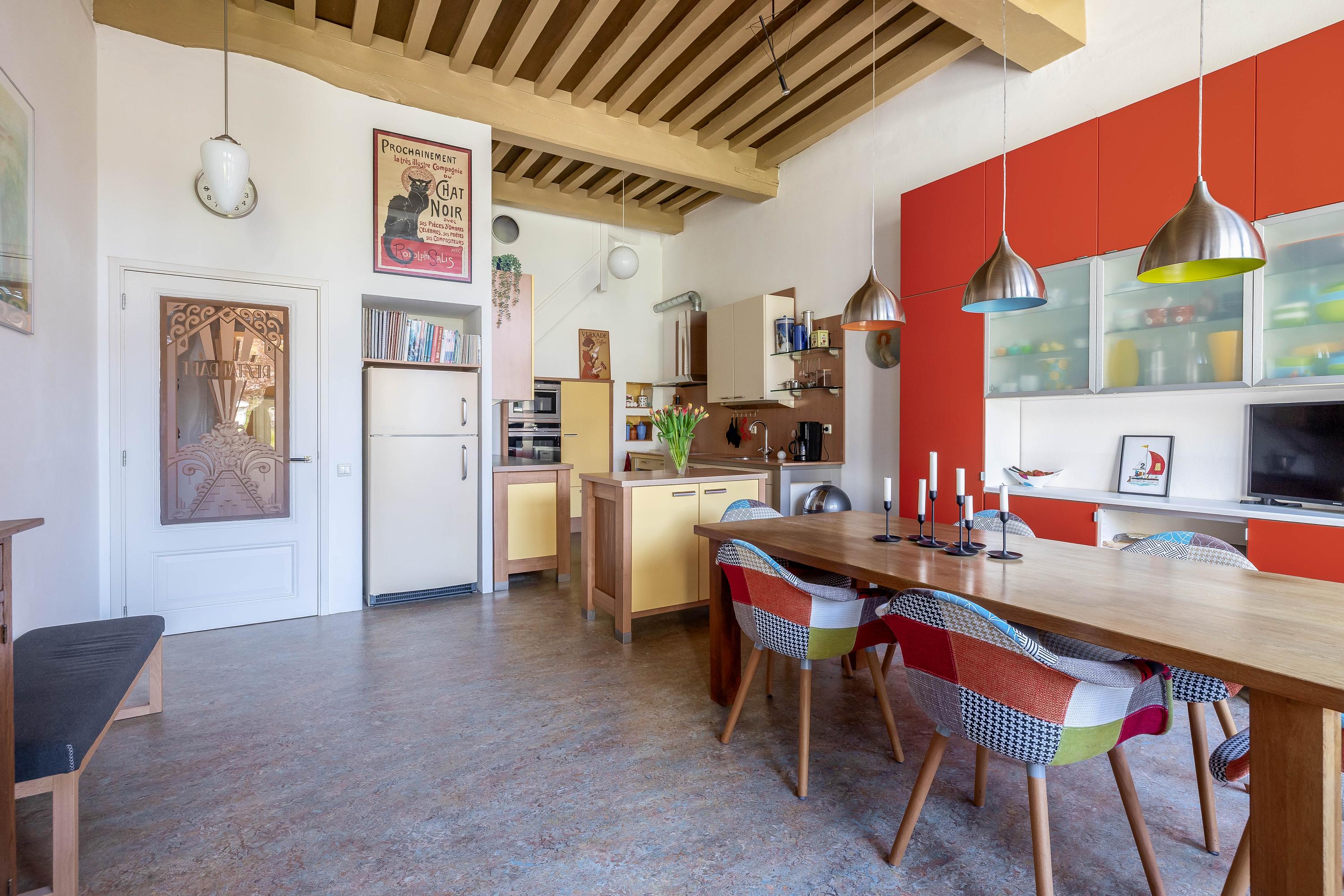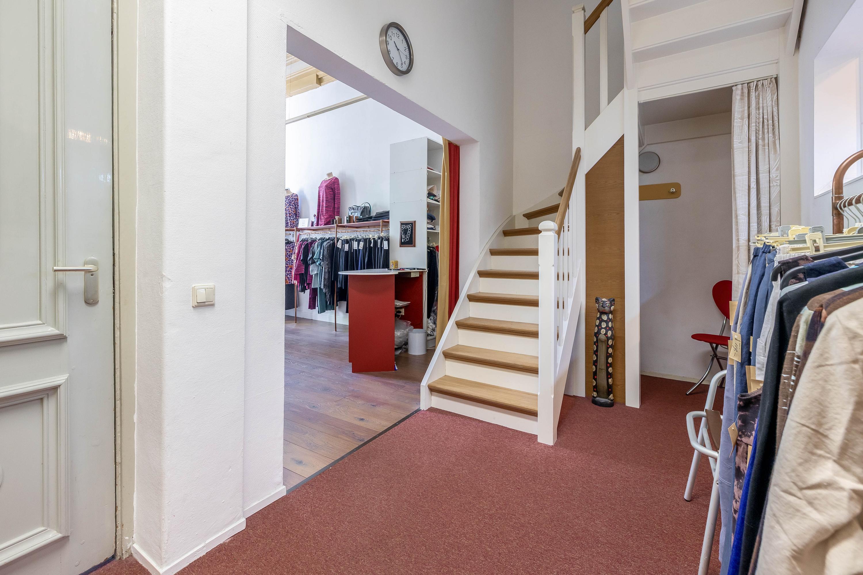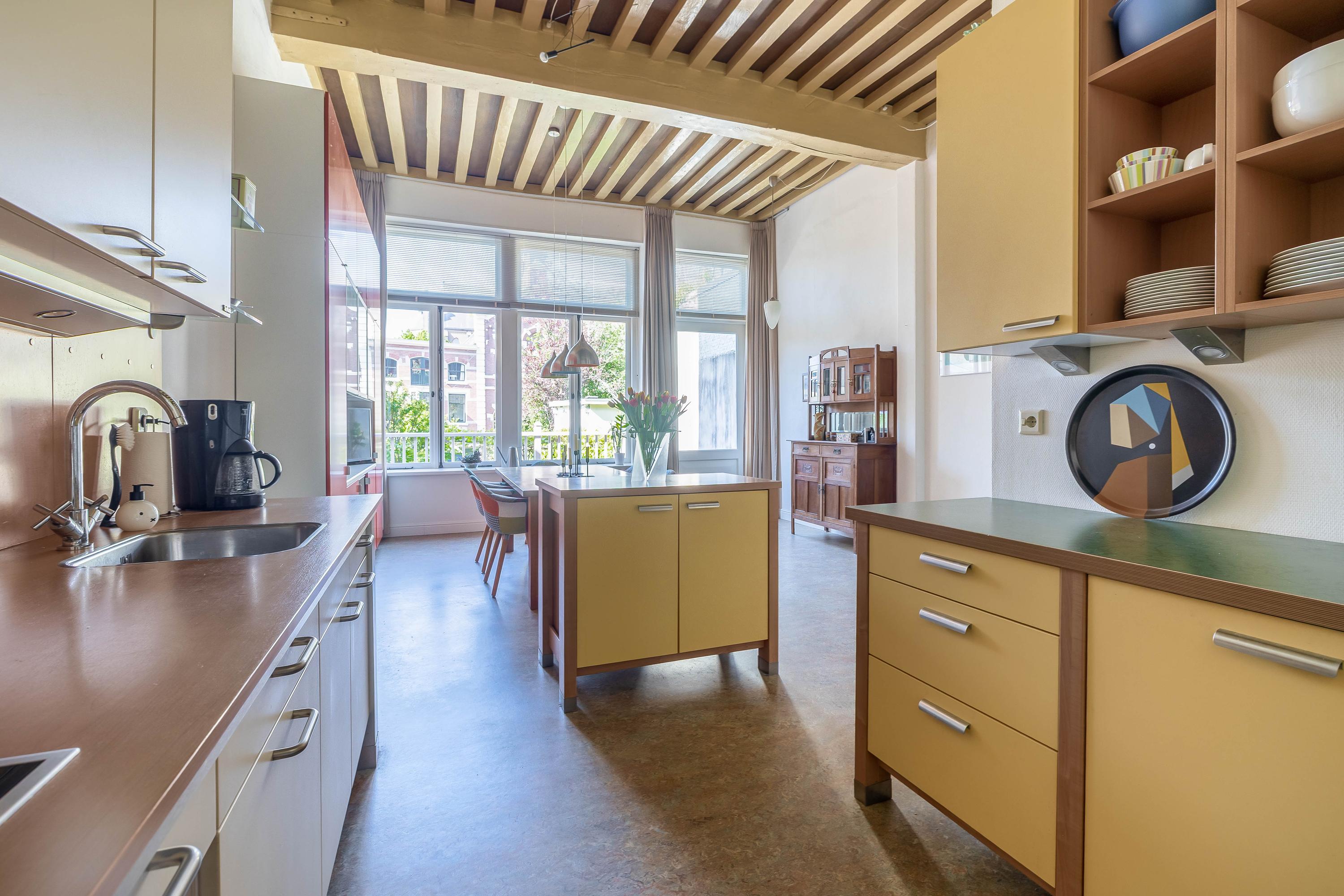 Shop space with beautiful wooden molded ceiling, staircase (fully renewed), studio with loft ladder to attic storage, toilet, second staircase (fully renewed), large kitchen-diner with stunning garden view, kitchen equipped with induction cooktop, extractor hood, combi oven, convection oven, dishwasher, kitchen boiler, marmoleum flooring with underfloor heating, and door to southwest-facing terrace.