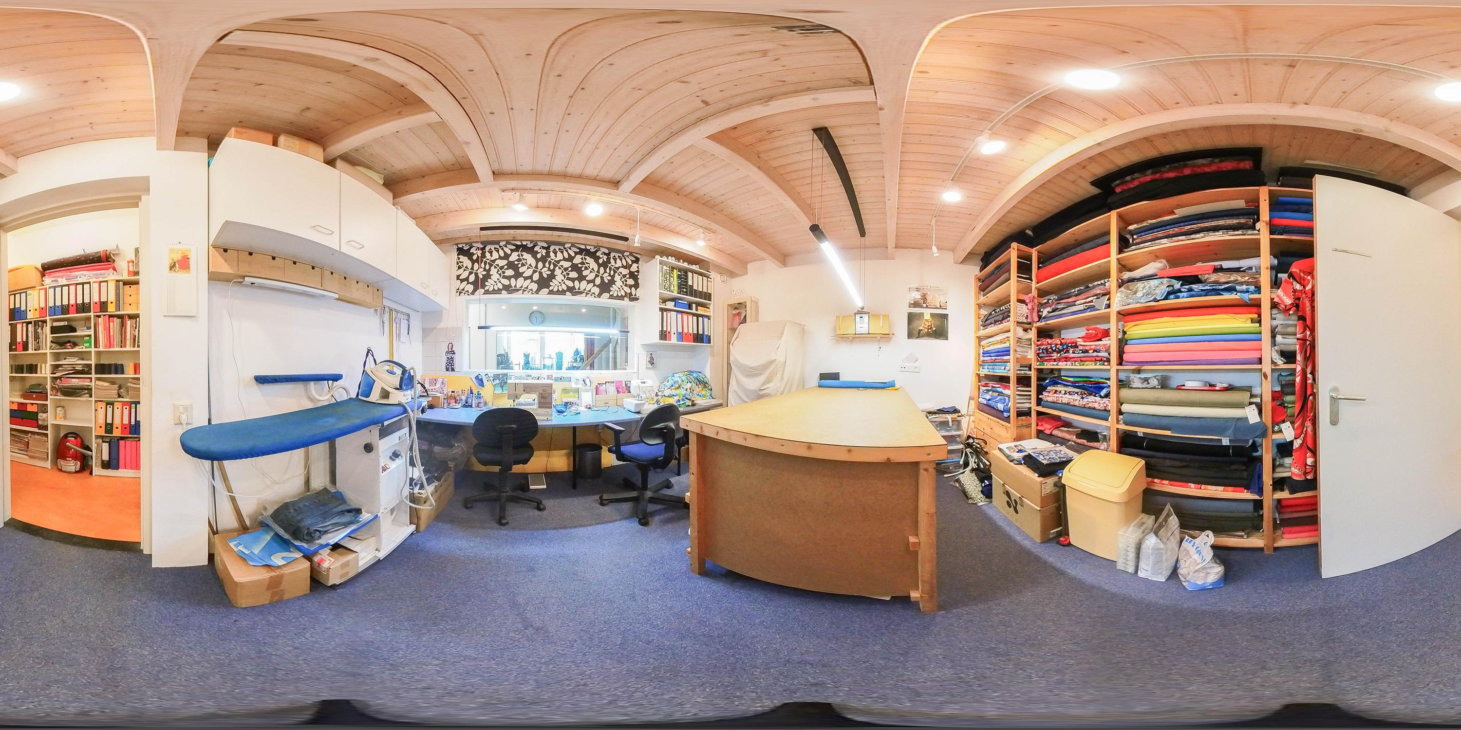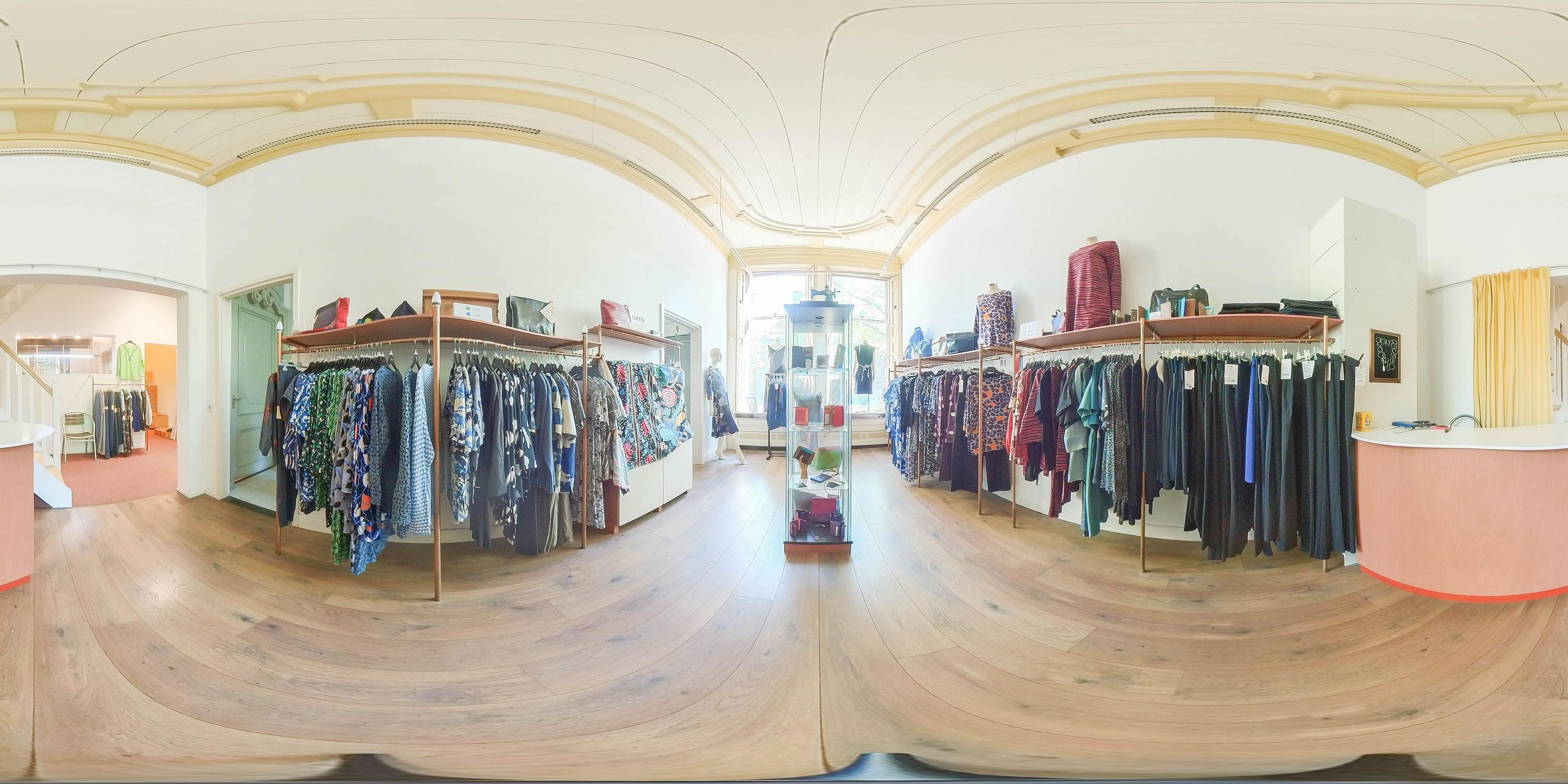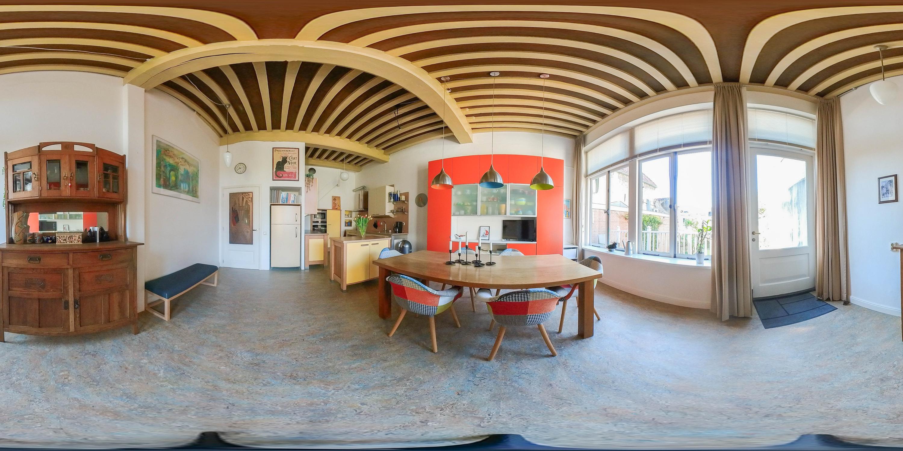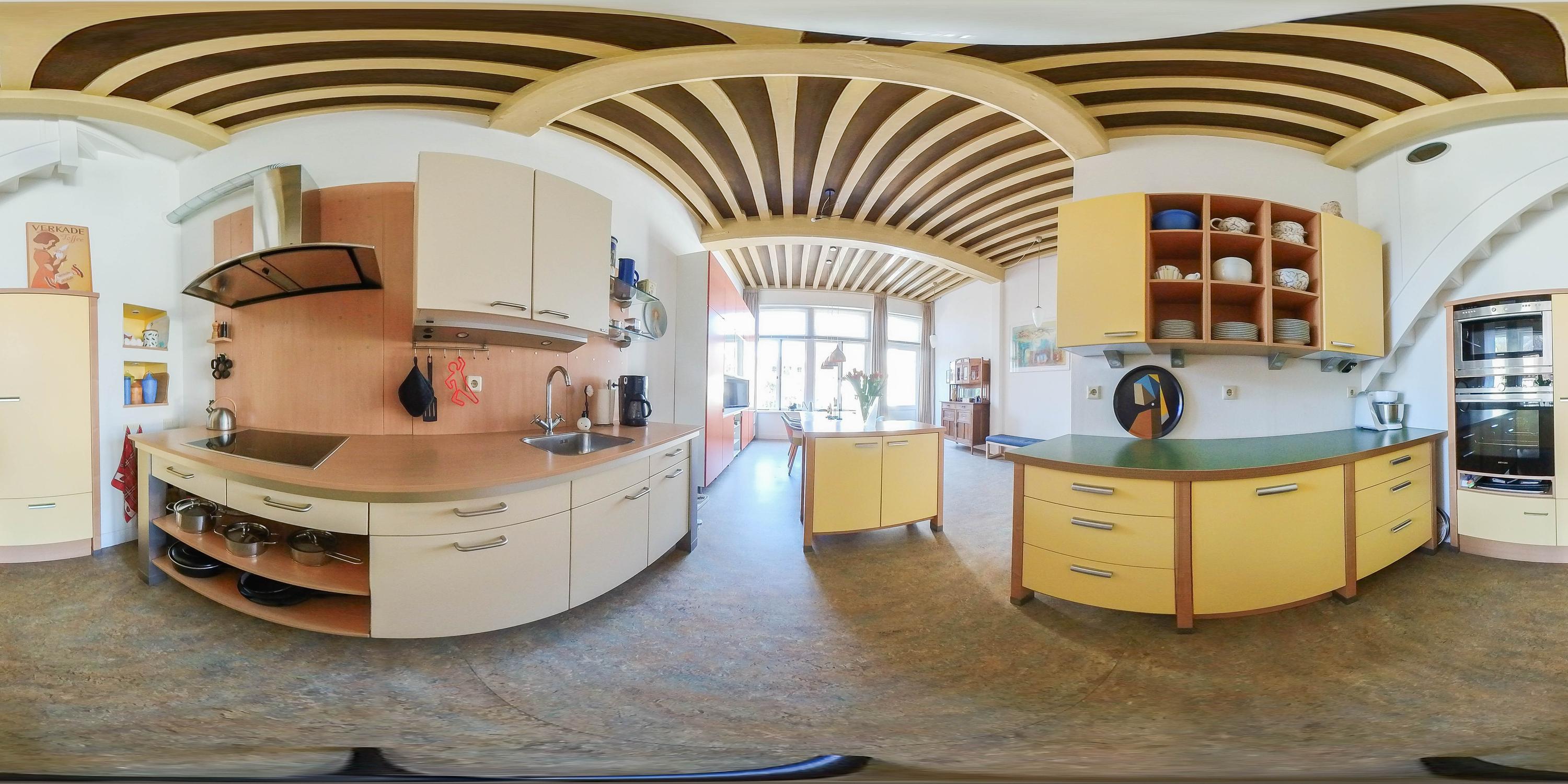 Shop space with beautiful wooden molded ceiling, staircase (fully renewed), studio with loft ladder to attic storage, toilet, second staircase (fully renewed), large kitchen-diner with stunning garden view, kitchen equipped with induction cooktop, extractor hood, combi oven, convection oven, dishwasher, kitchen boiler, marmoleum flooring with underfloor heating, and door to southwest-facing terrace.