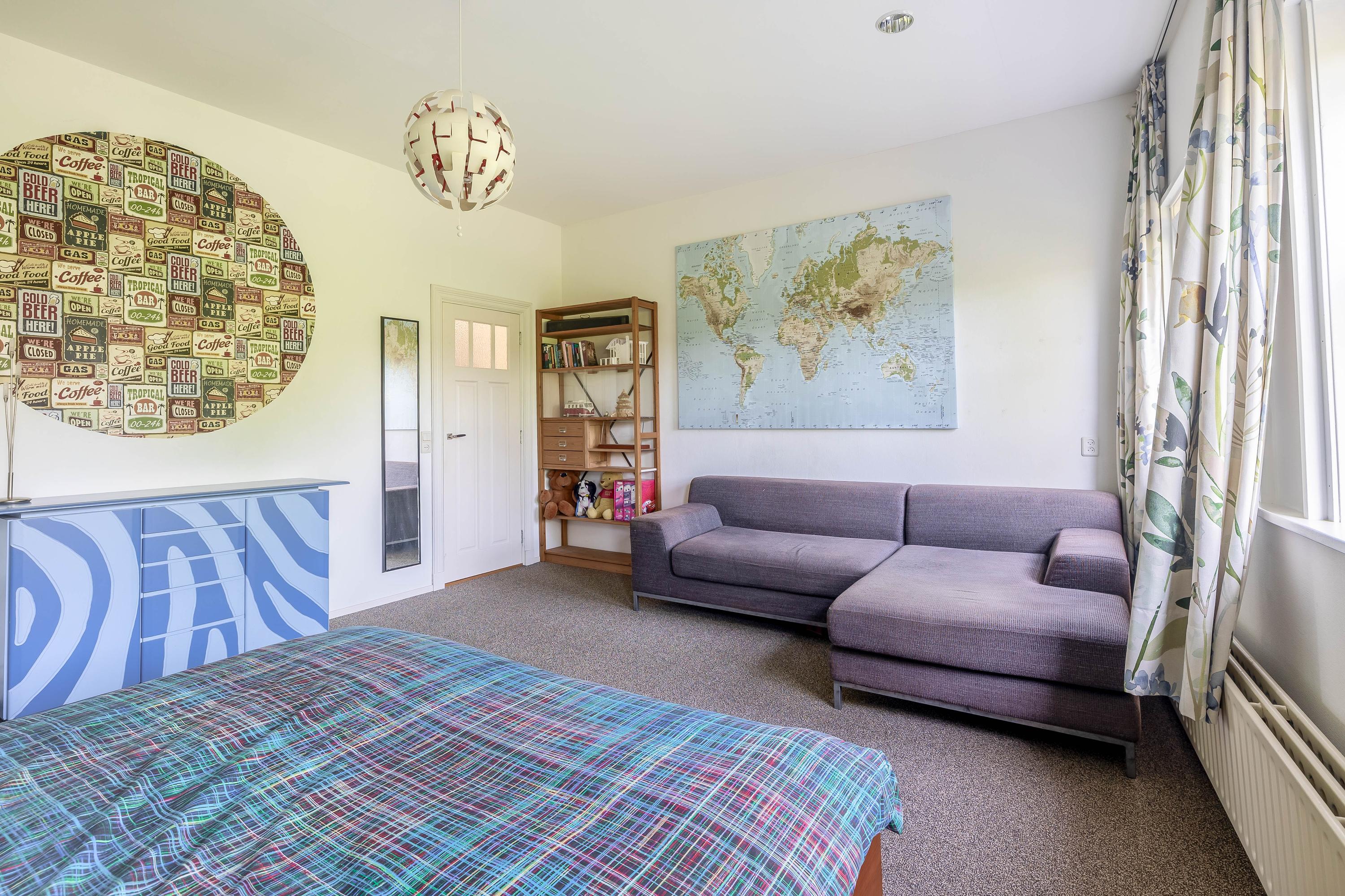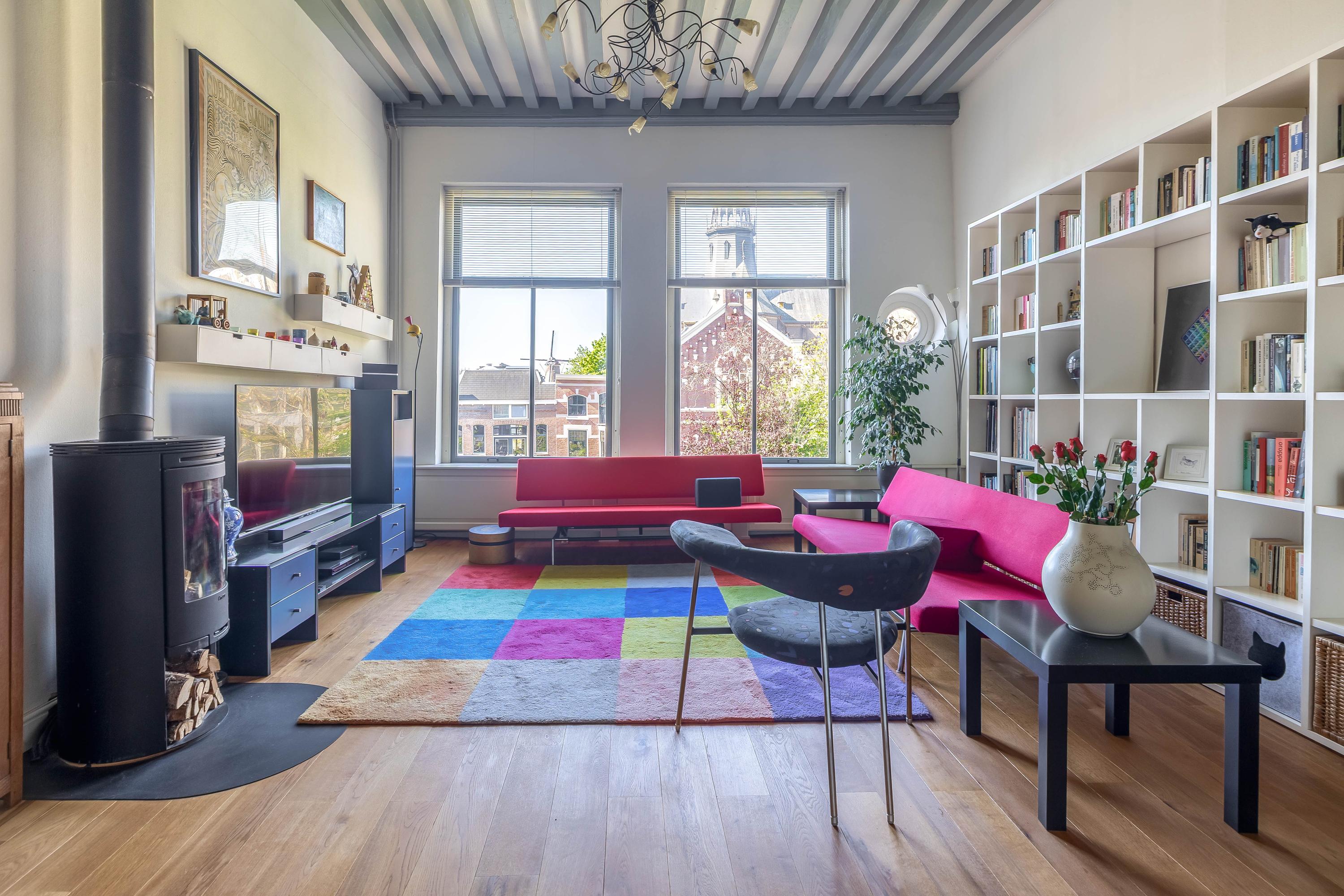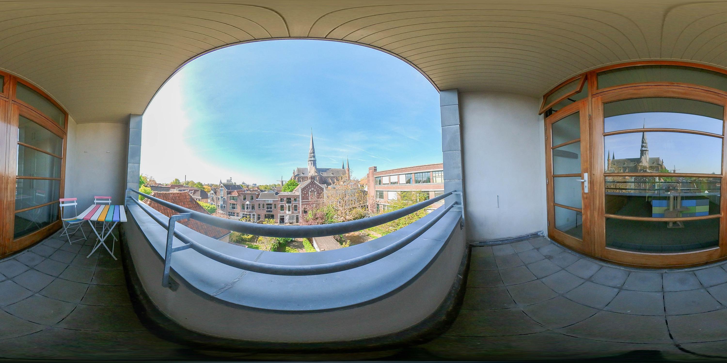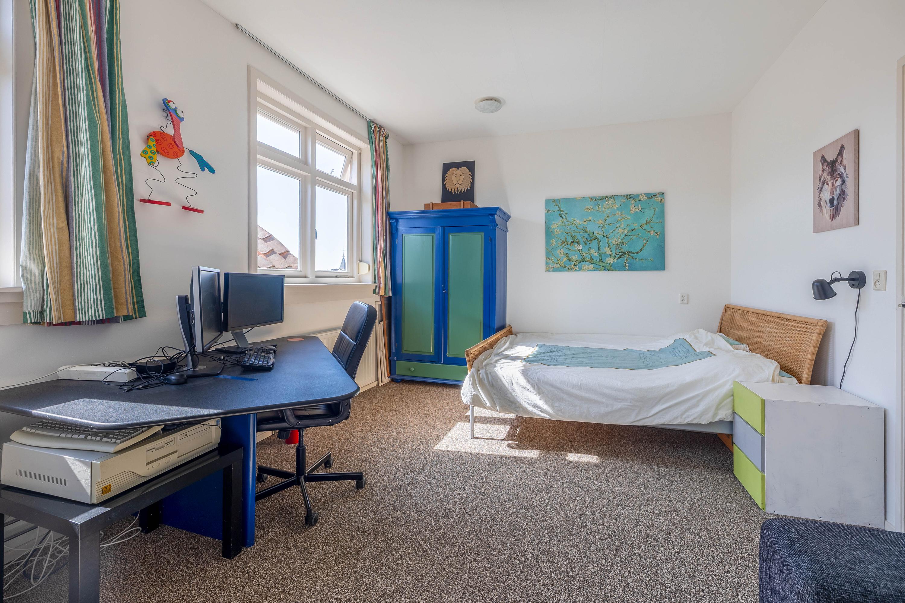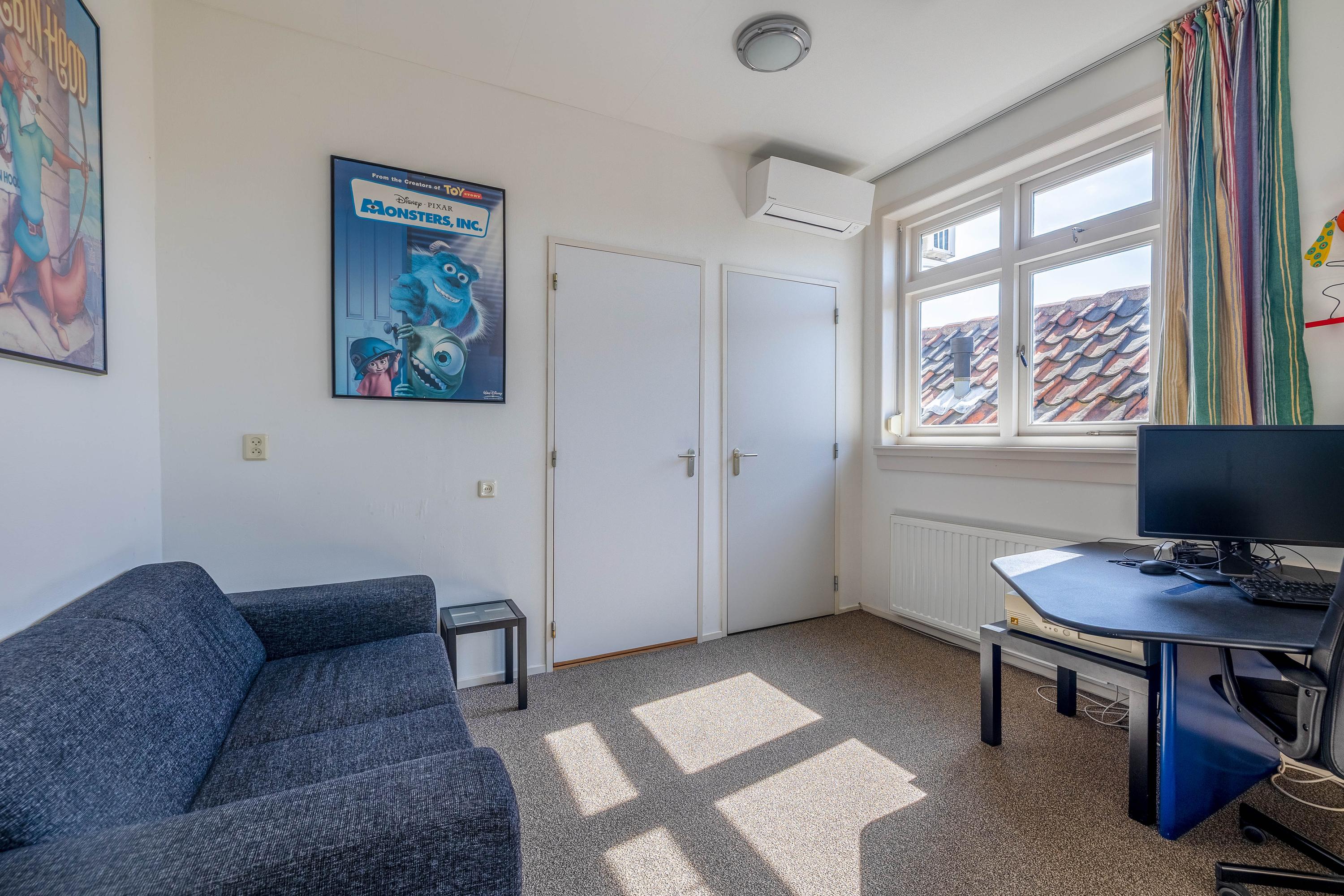 Rear bedroom with new rear façade and door to terrace with stunning view over the historic buildings of Gouda’s city center, bedroom with built-in wardrobe, air conditioning, boiler room, and front bedroom with view of the museum and St. John’s Church