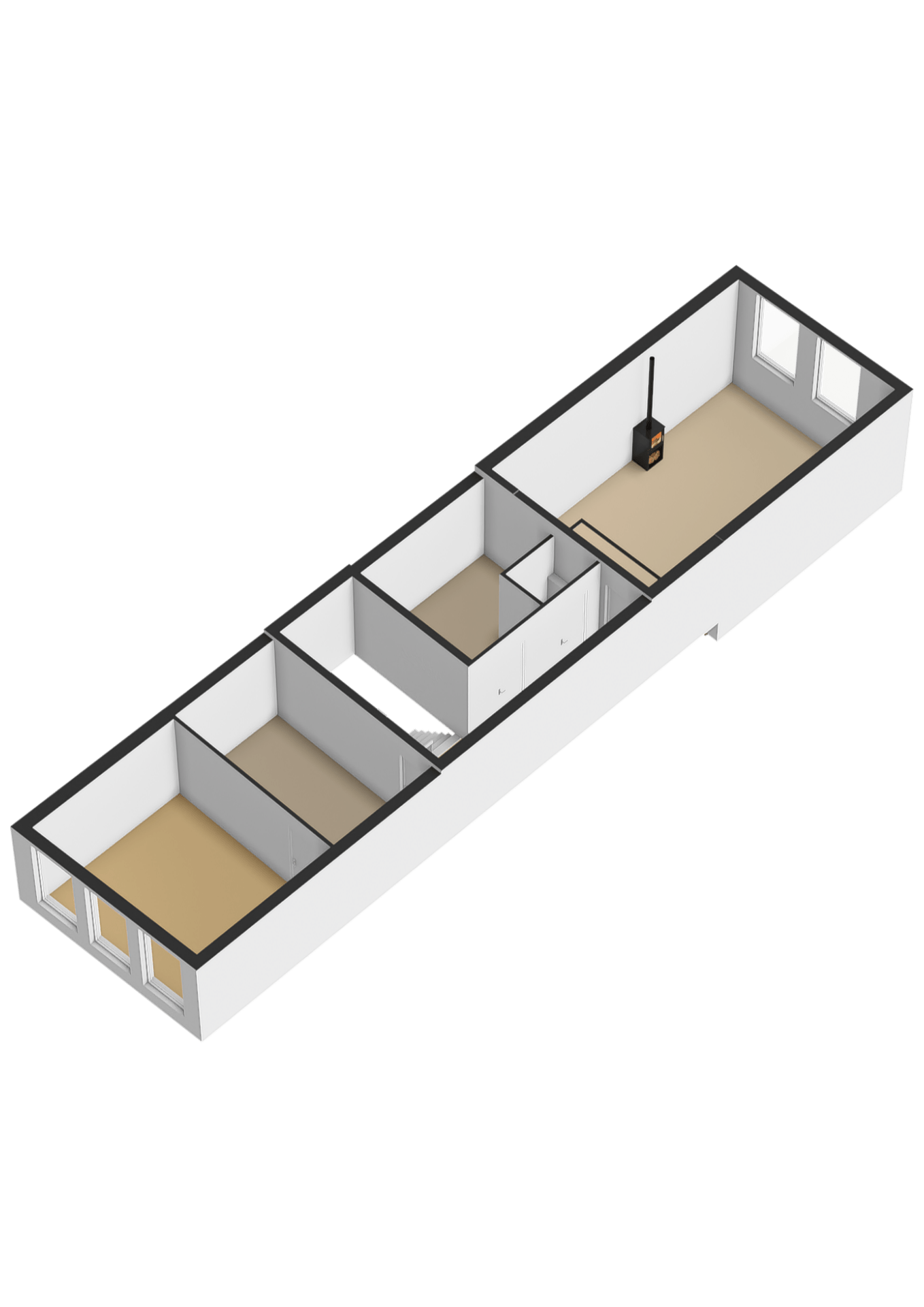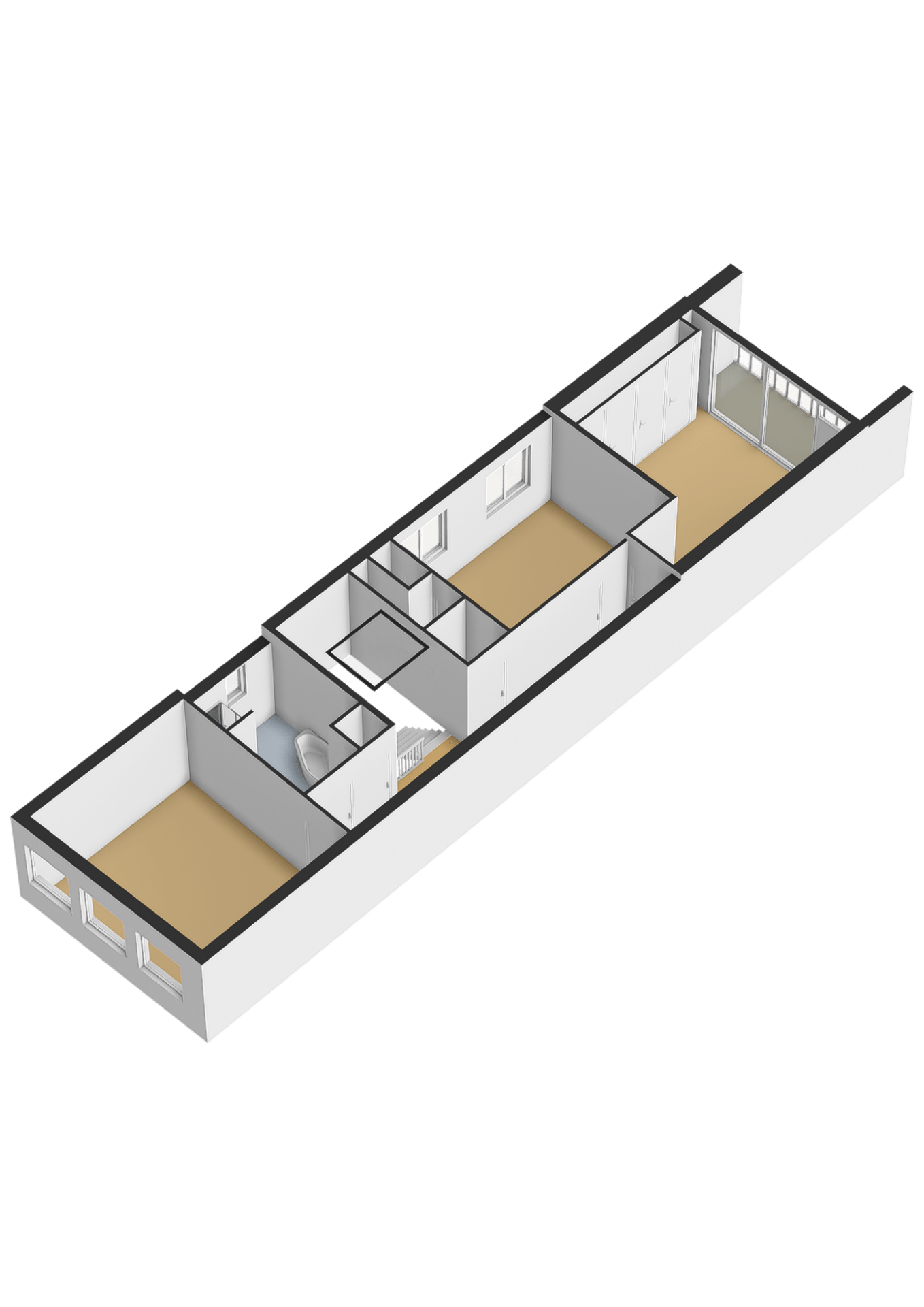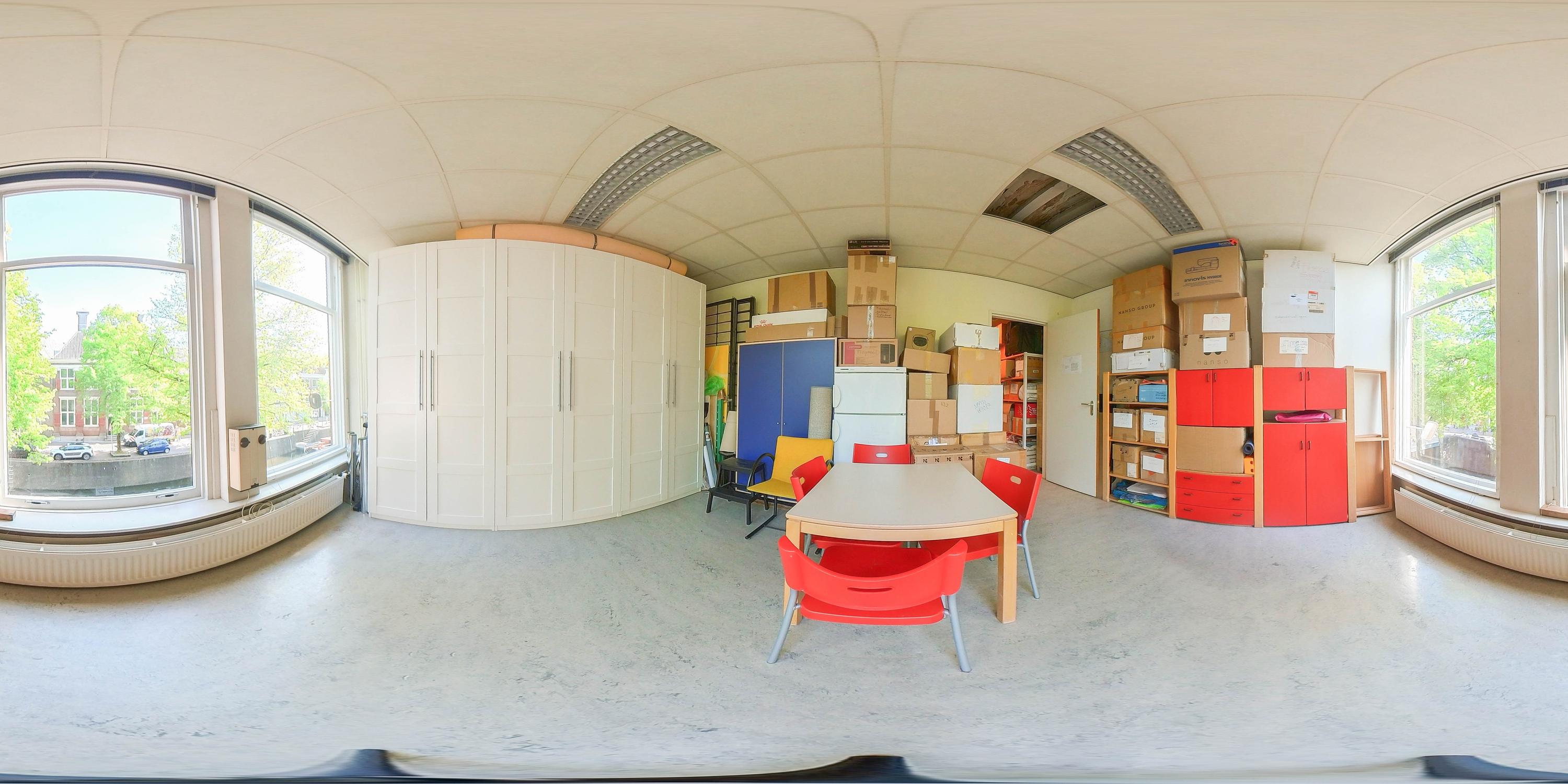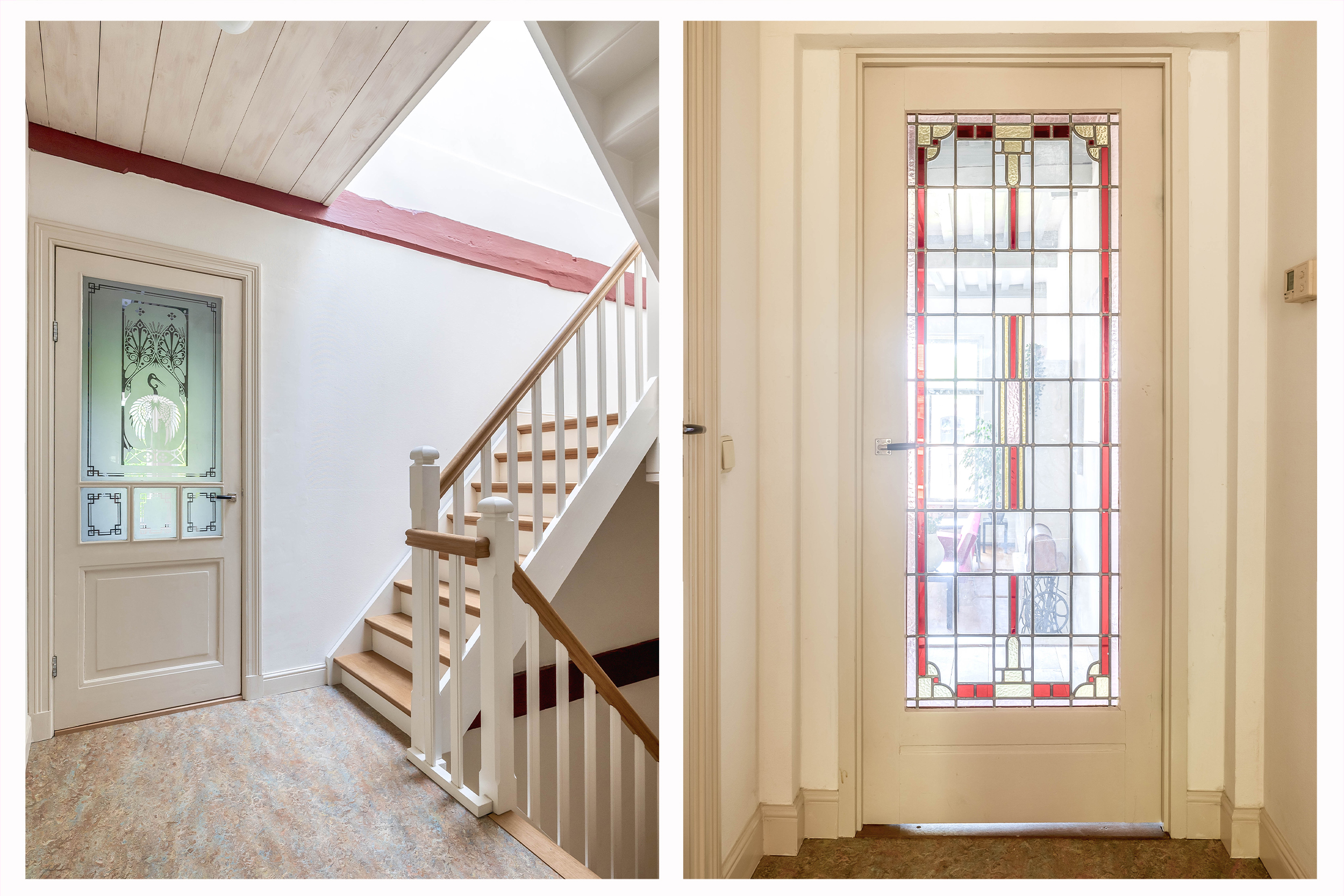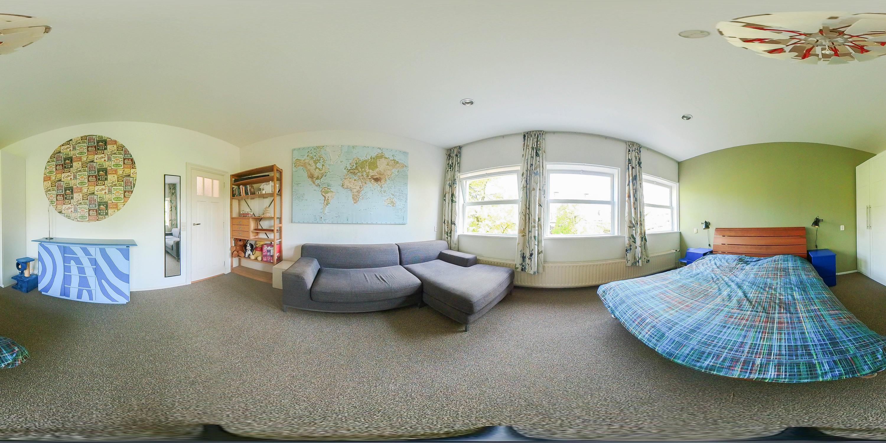 Rear bedroom with new rear façade and door to terrace with stunning view over the historic buildings of Gouda’s city center, bedroom with built-in wardrobe, air conditioning, boiler room, and front bedroom with view of the museum and St. John’s Church
