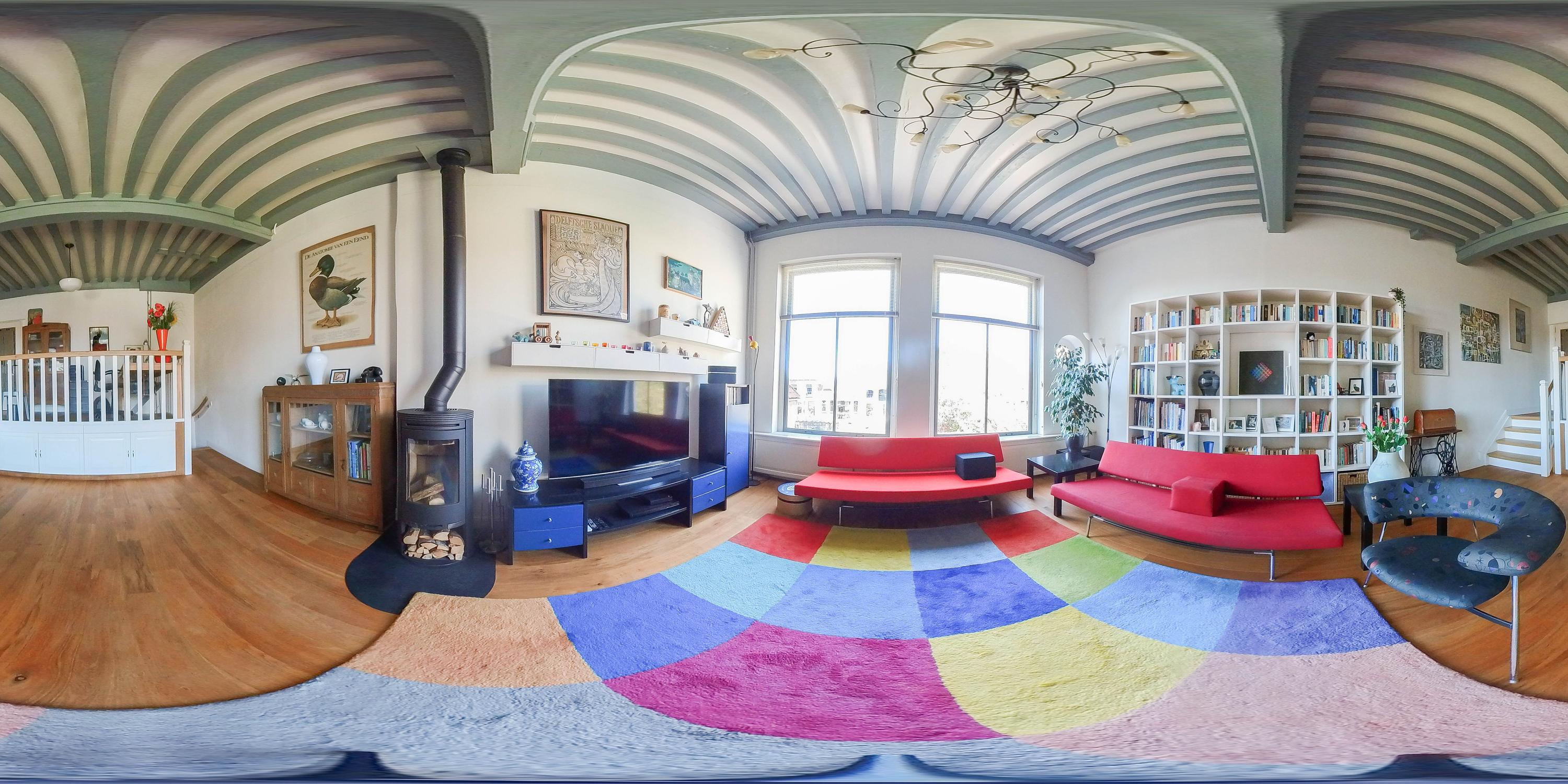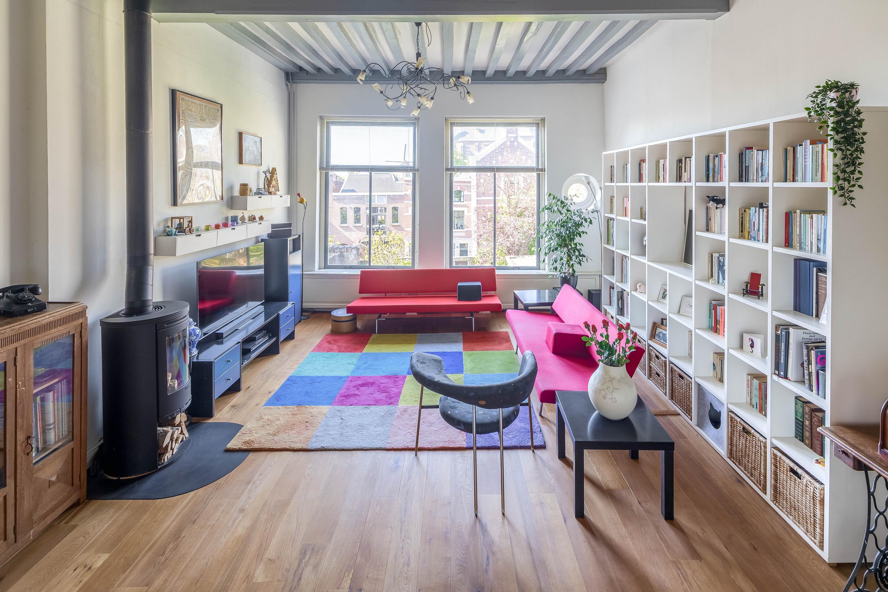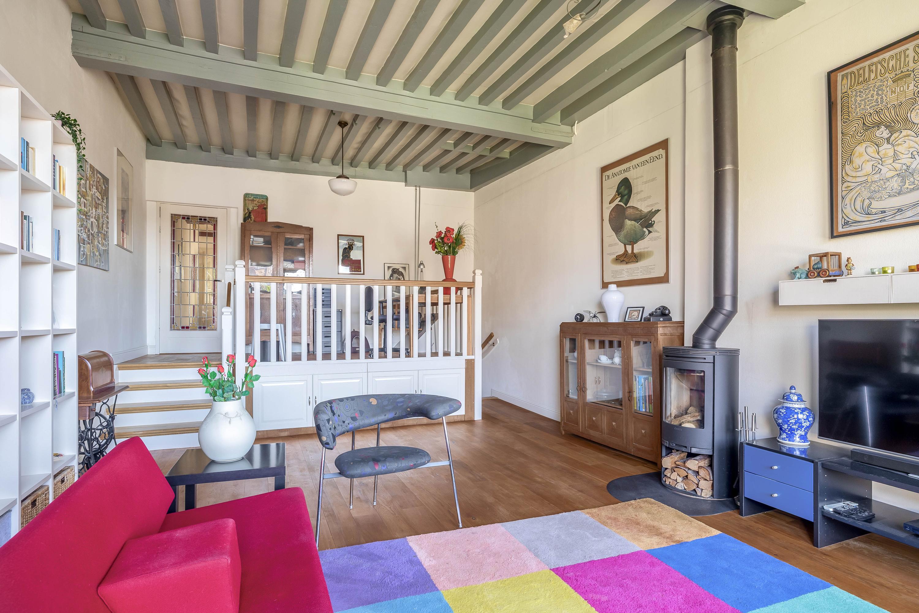 Living room with wooden floor, beamed ceiling, high-efficiency wood stove with external air supply, playful elevated workspace,