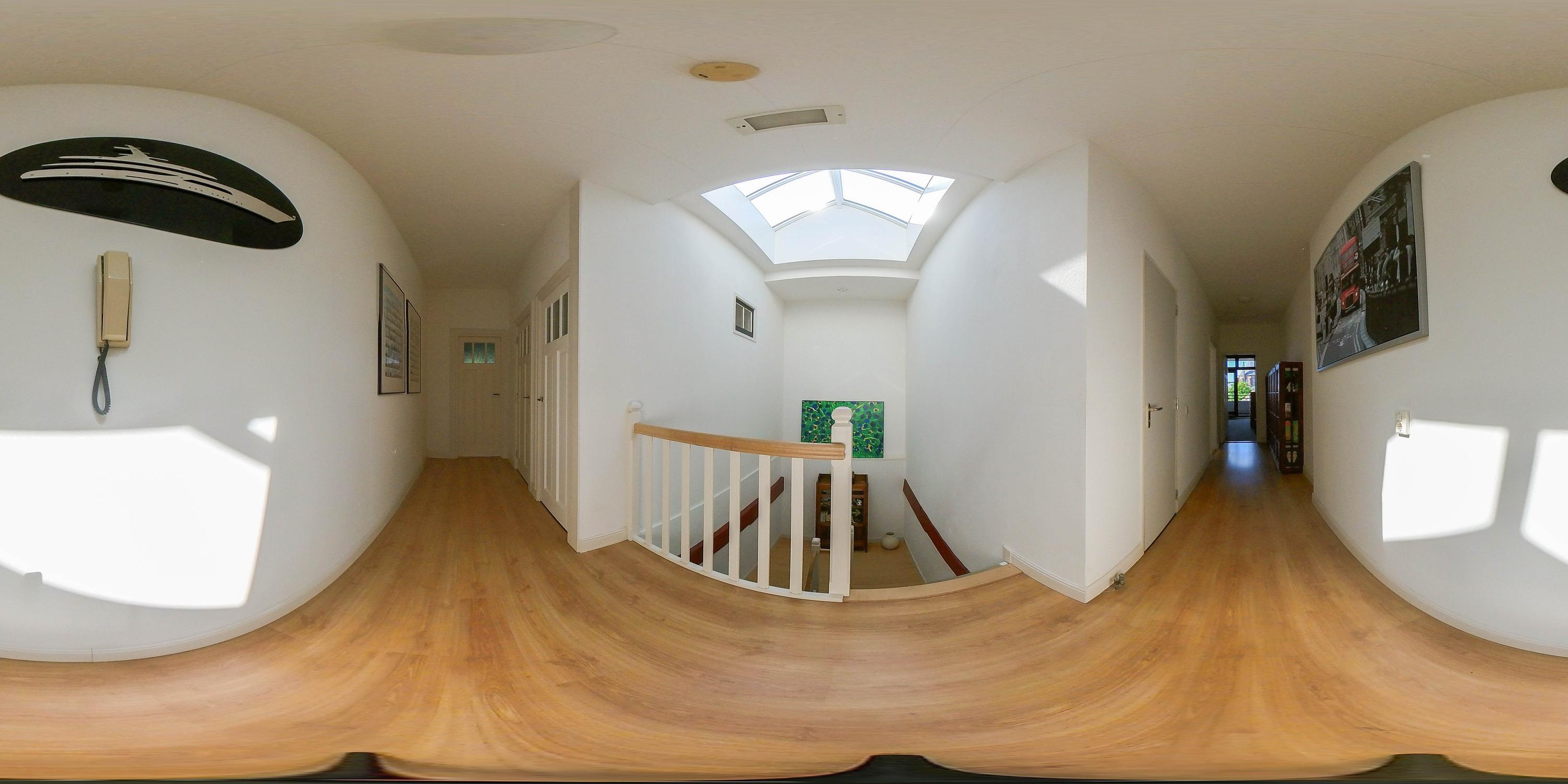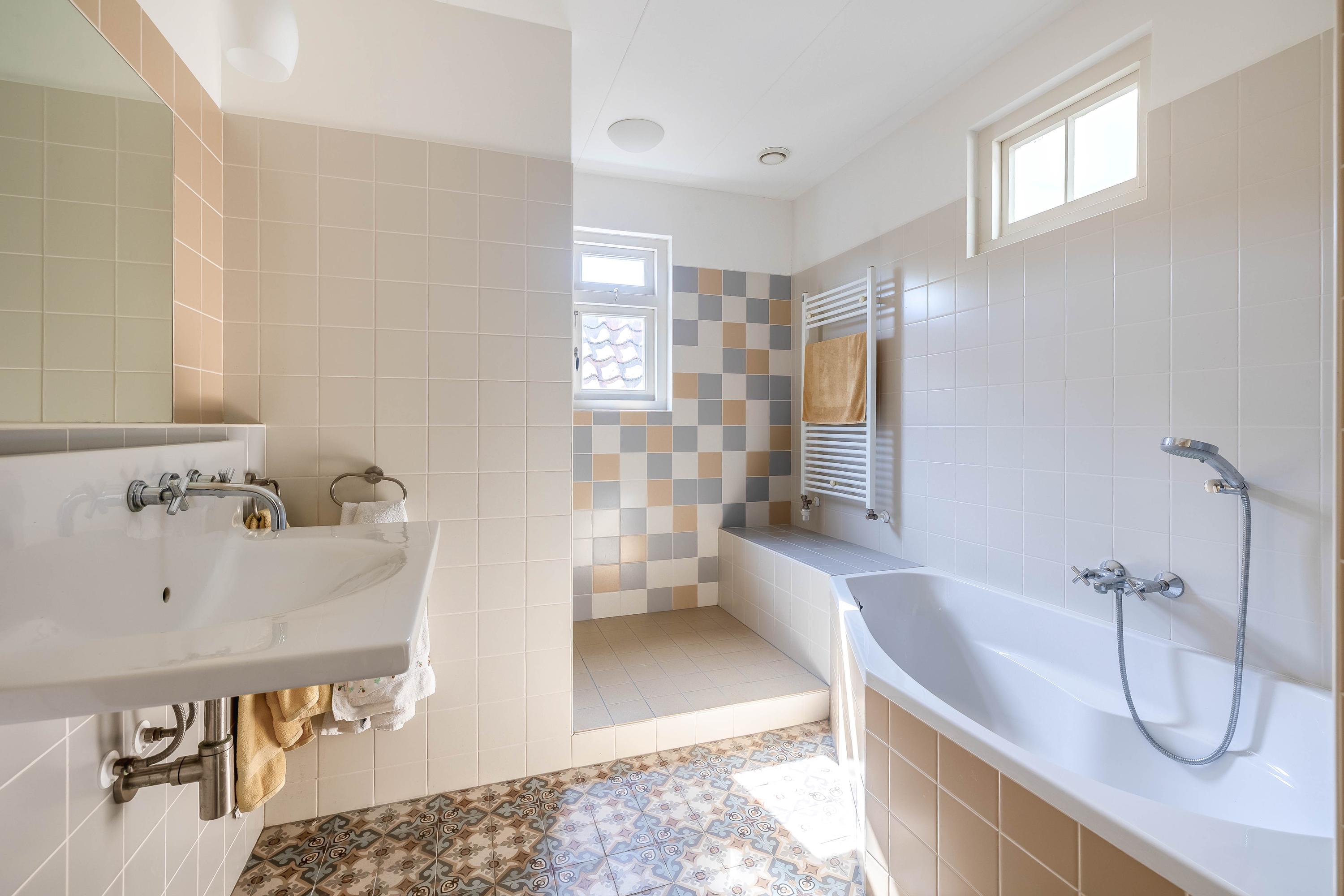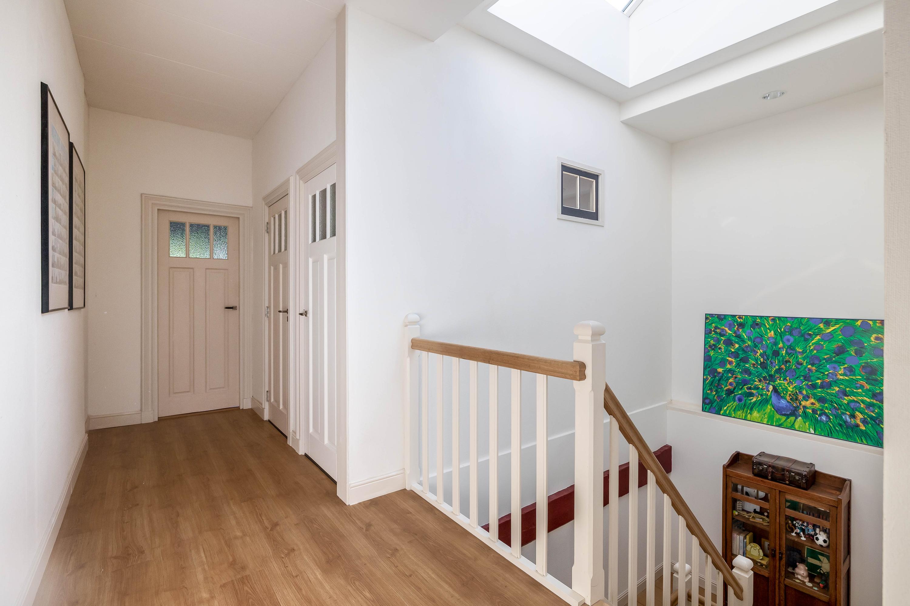 Spacious landing with roof light, laminate flooring, toilet (wall-mounted toilet and small sink), bright bathroom with walk-in shower, bathtub, sink, windows, fully tiled, and designer radiator