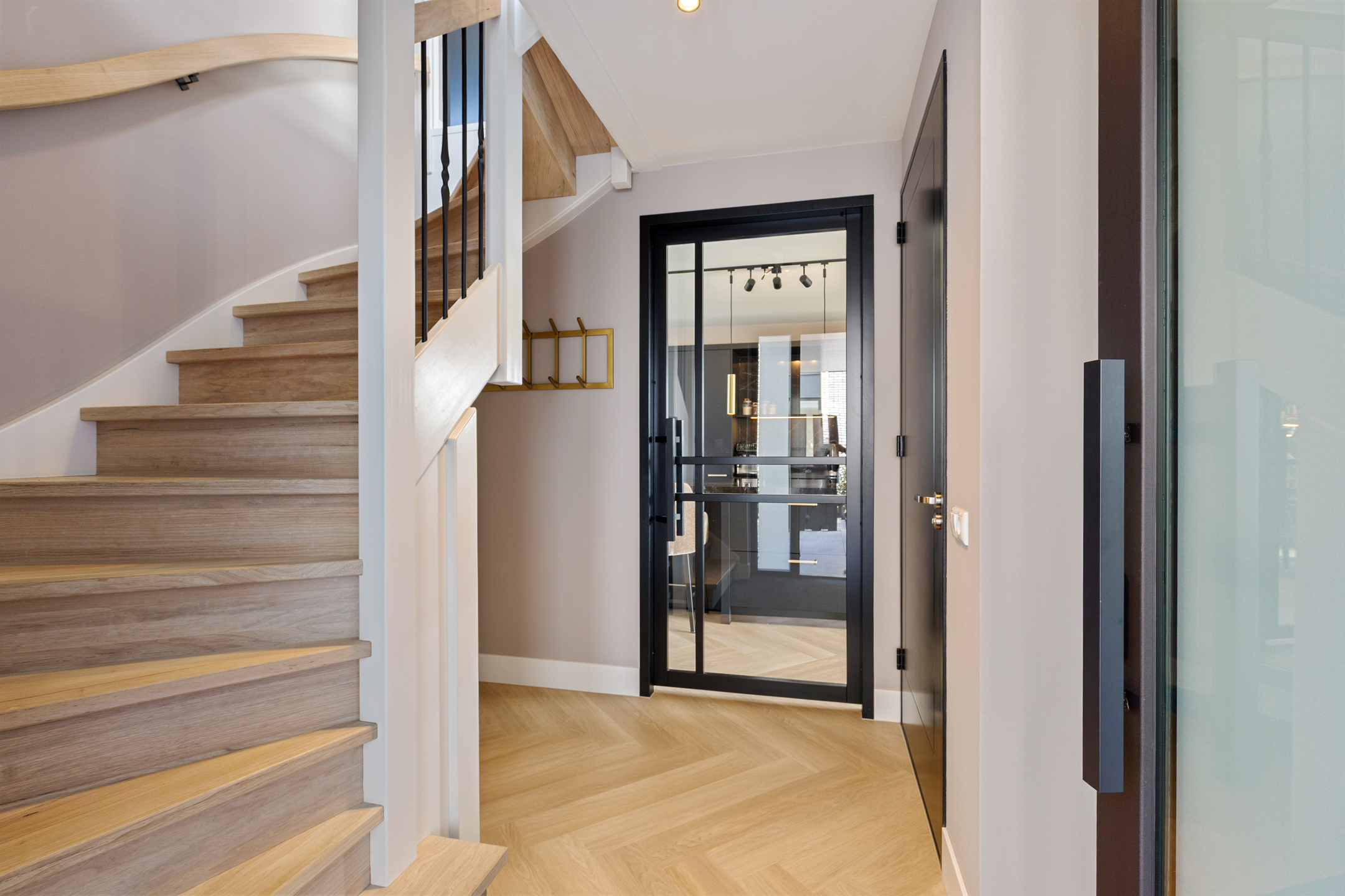 The entrance leads into a spacious hallway featuring a staircase finished with Fraké wood treads and handrails, combined with elegant black balusters, a stylish guest toilet, and the utility meter cupboard. From the hallway, an extra-wide glass door provides access to the generous living area.