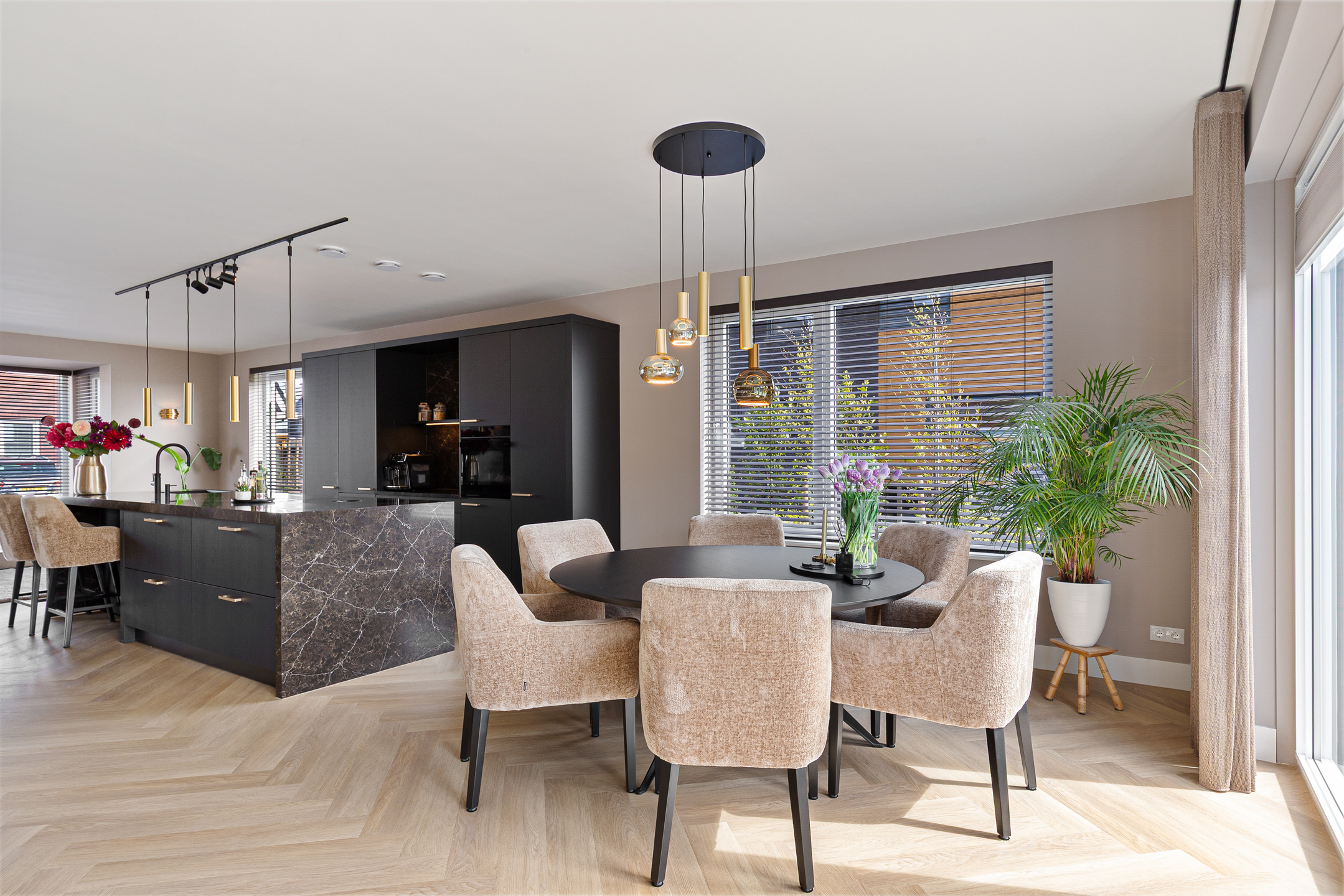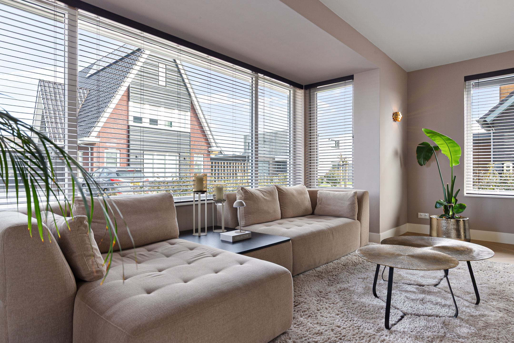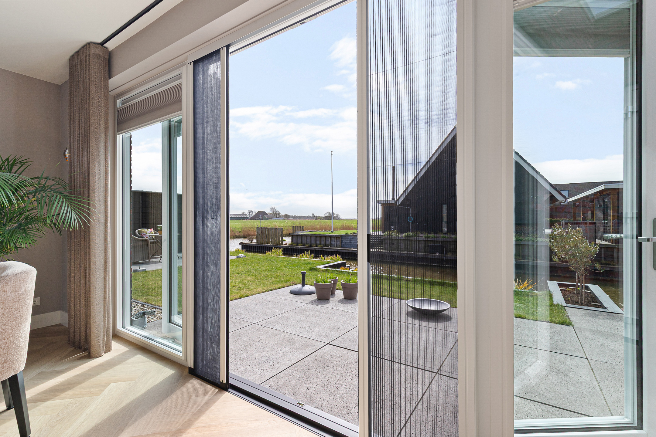 A stylish built-in electric fireplace (Kalfire E-one, Dec. 2025) set within an elegant surround finished with bronze ceramic KitKat tiles serves as a true focal point. The living room is fitted with wooden Luxaflex blinds, beautiful in-between curtains on the garden side, interior sun shading, and a double pleated insect screen door.