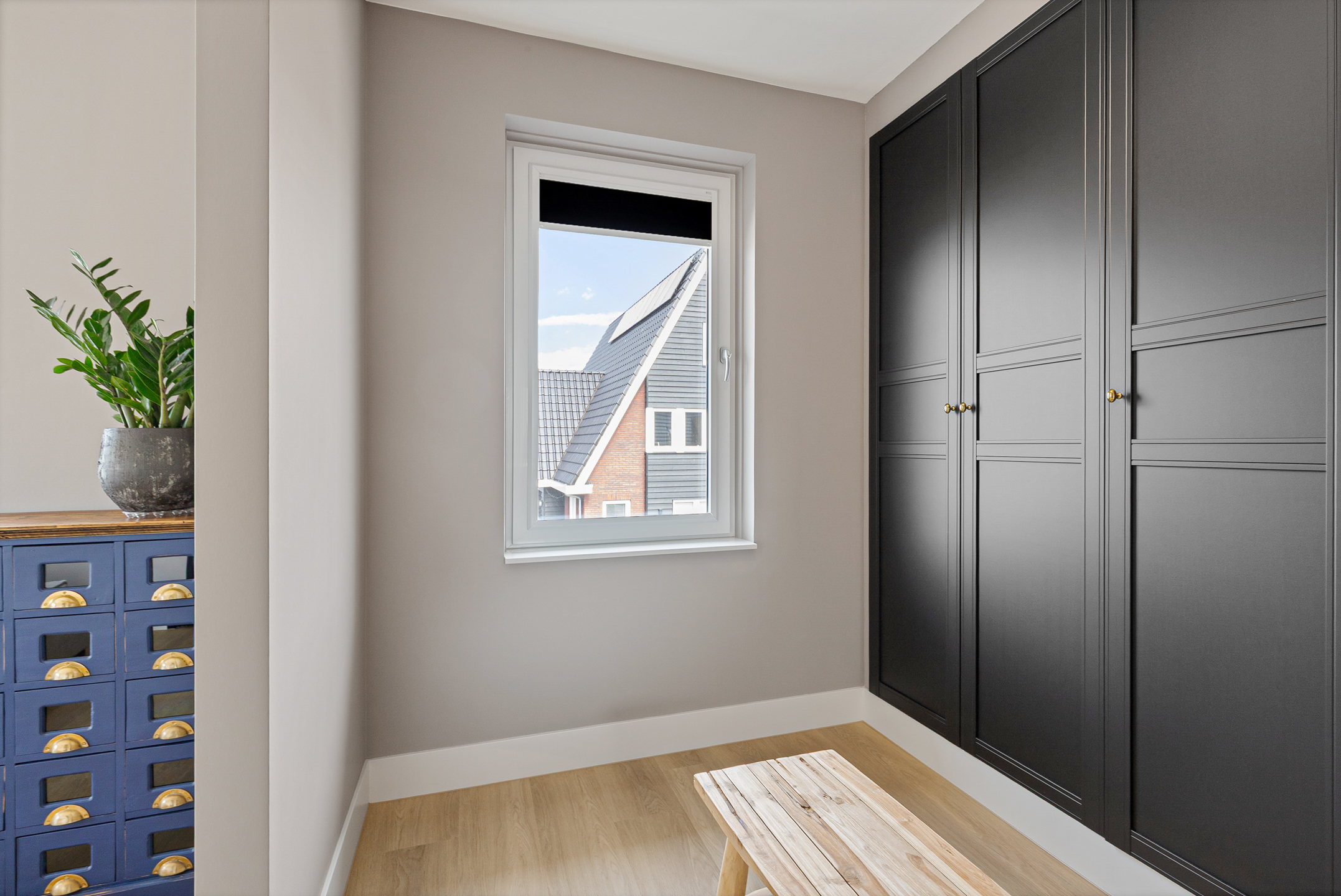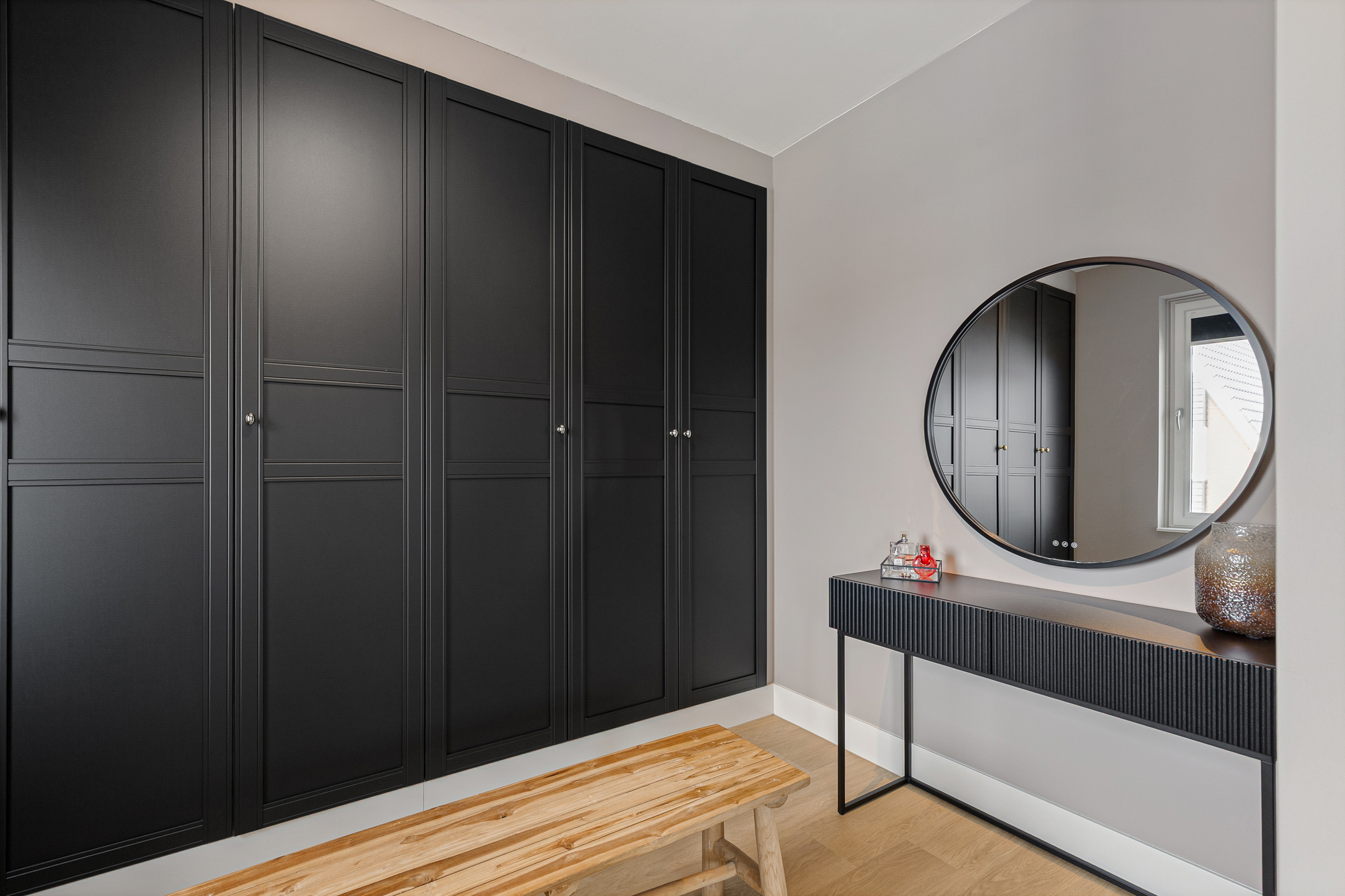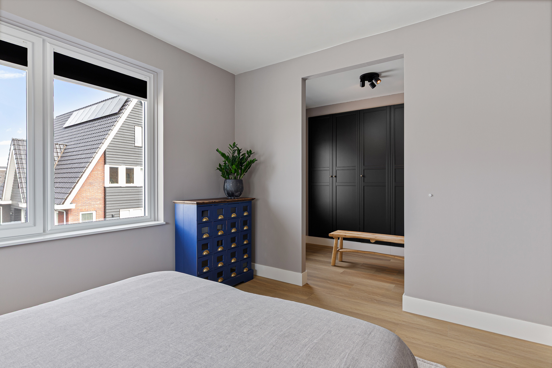 The master bedroom is generously proportioned and features a luxurious en-suite dressing room with fitted wardrobes and space for a vanity setup.