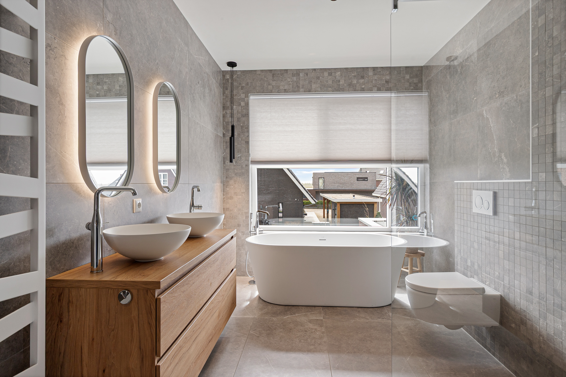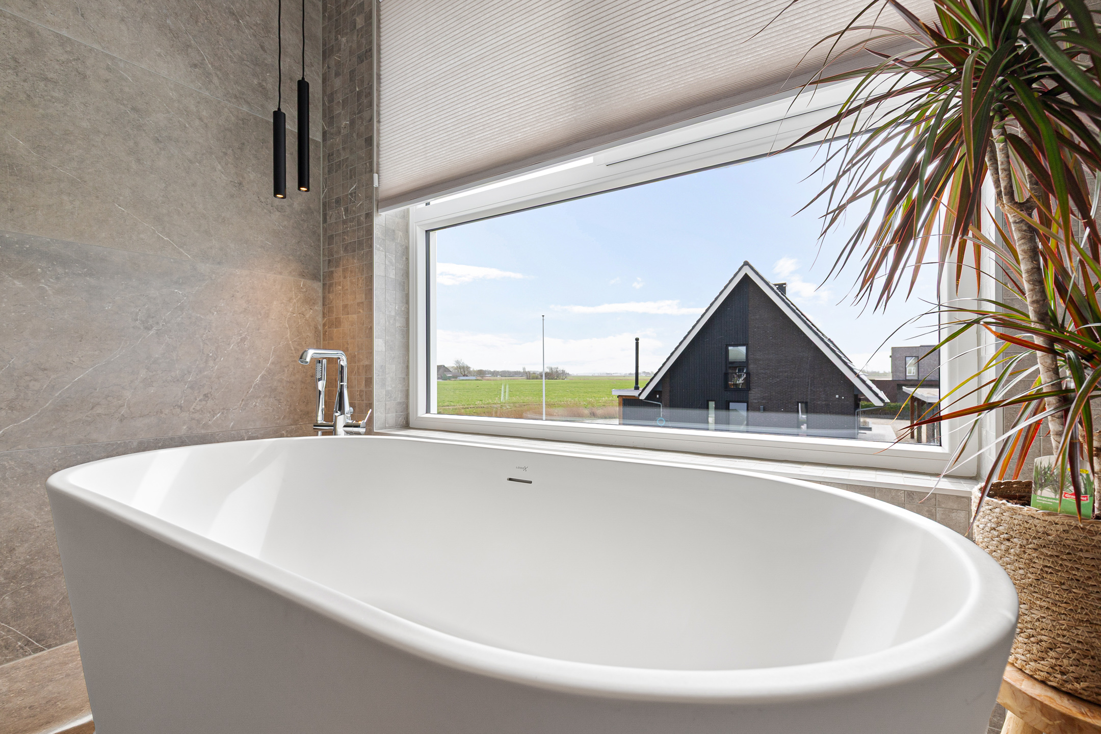 The luxury bathroom is finished in the same elegant style as the rest of the sanitary areas in the home and exudes a calm atmosphere. The bathroom includes: bathtub with panoramic countryside views, spacious walk-in shower, double vanity unit, toilet. The entire first floor is equipped with underfloor heating and the same high-quality PVC flooring in plank pattern, ensuring a consistent and tranquil interior appearance. All windows are fitted with insect screens and pleated blinds.
