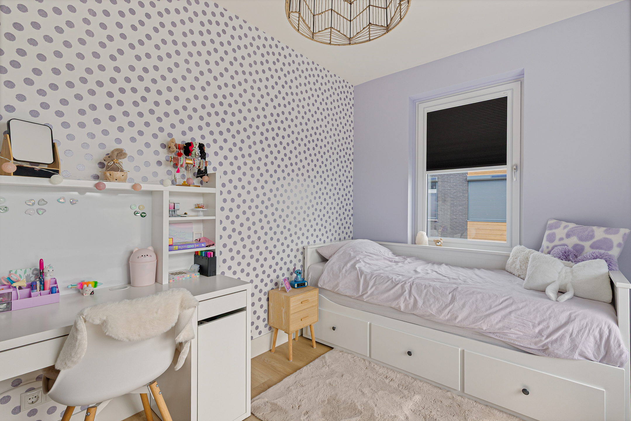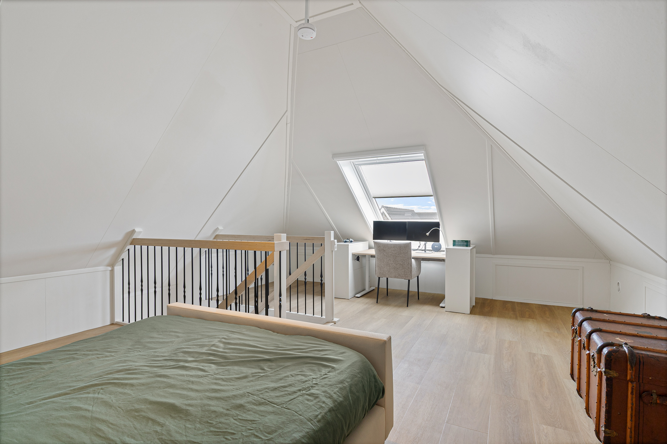This floor is currently used as a guest room and home office and also offers ample storage space behind the knee walls. Thanks to its generous space, natural light, and practical layout, this is a highly comfortable and multifunctional level.