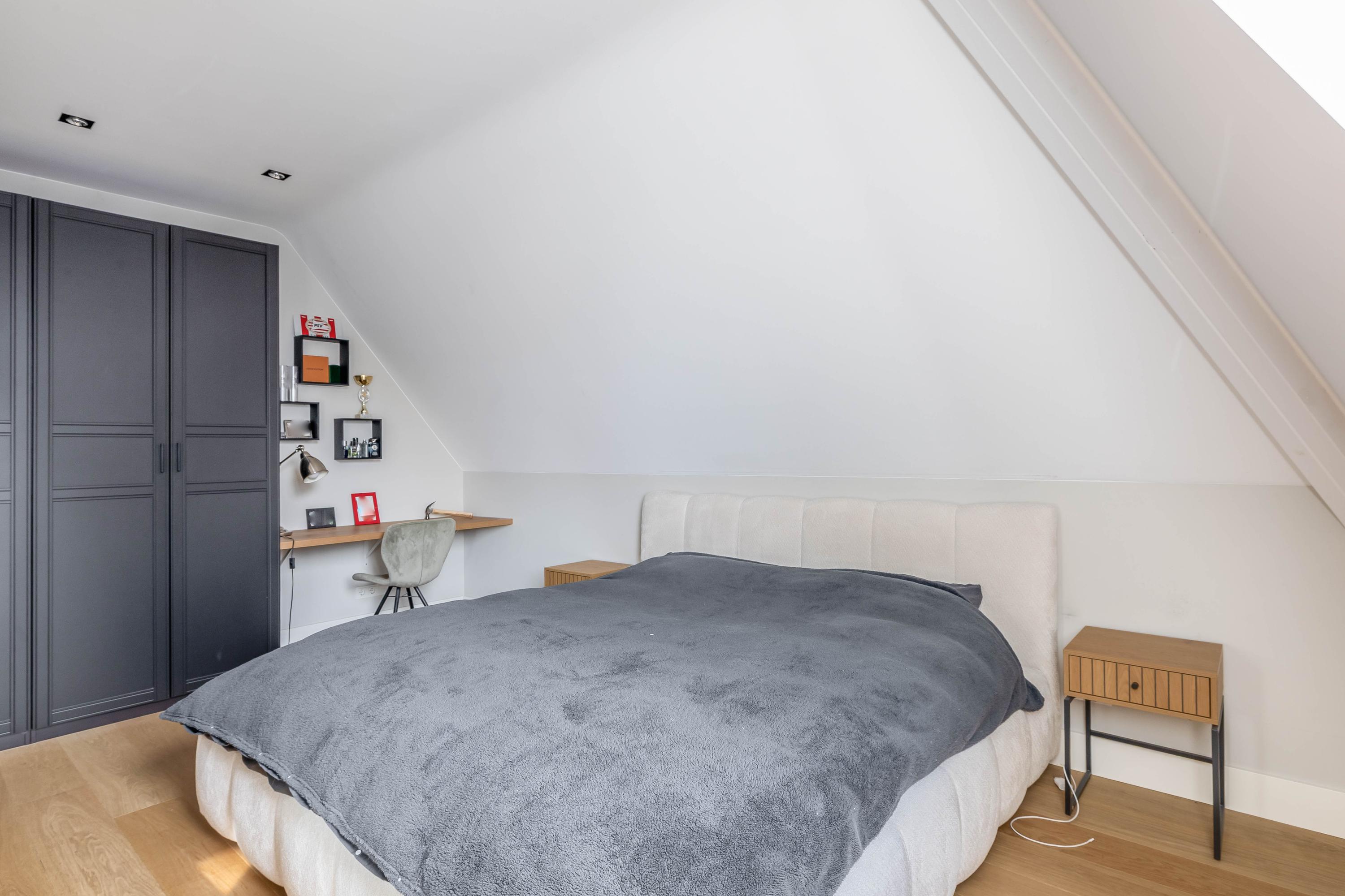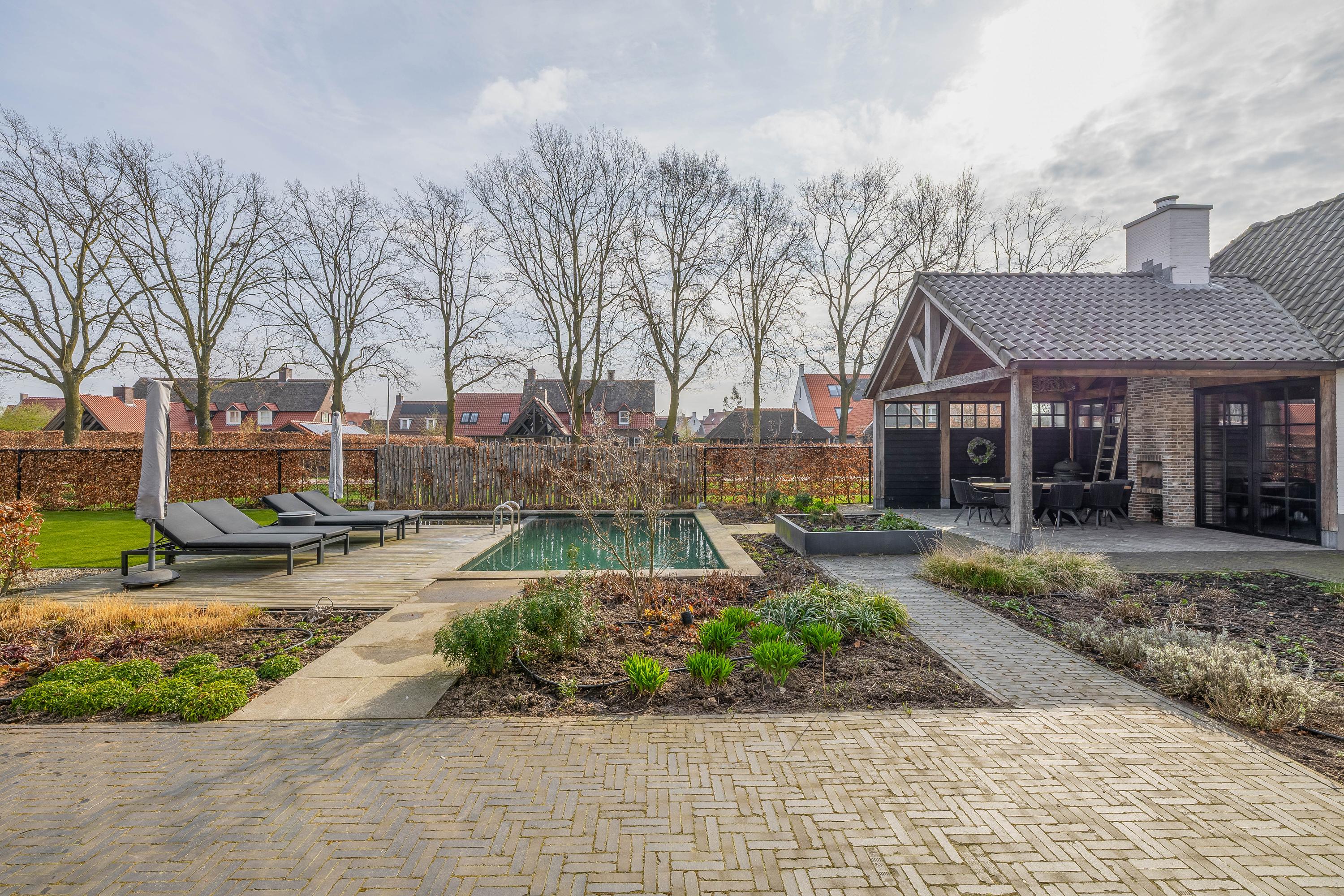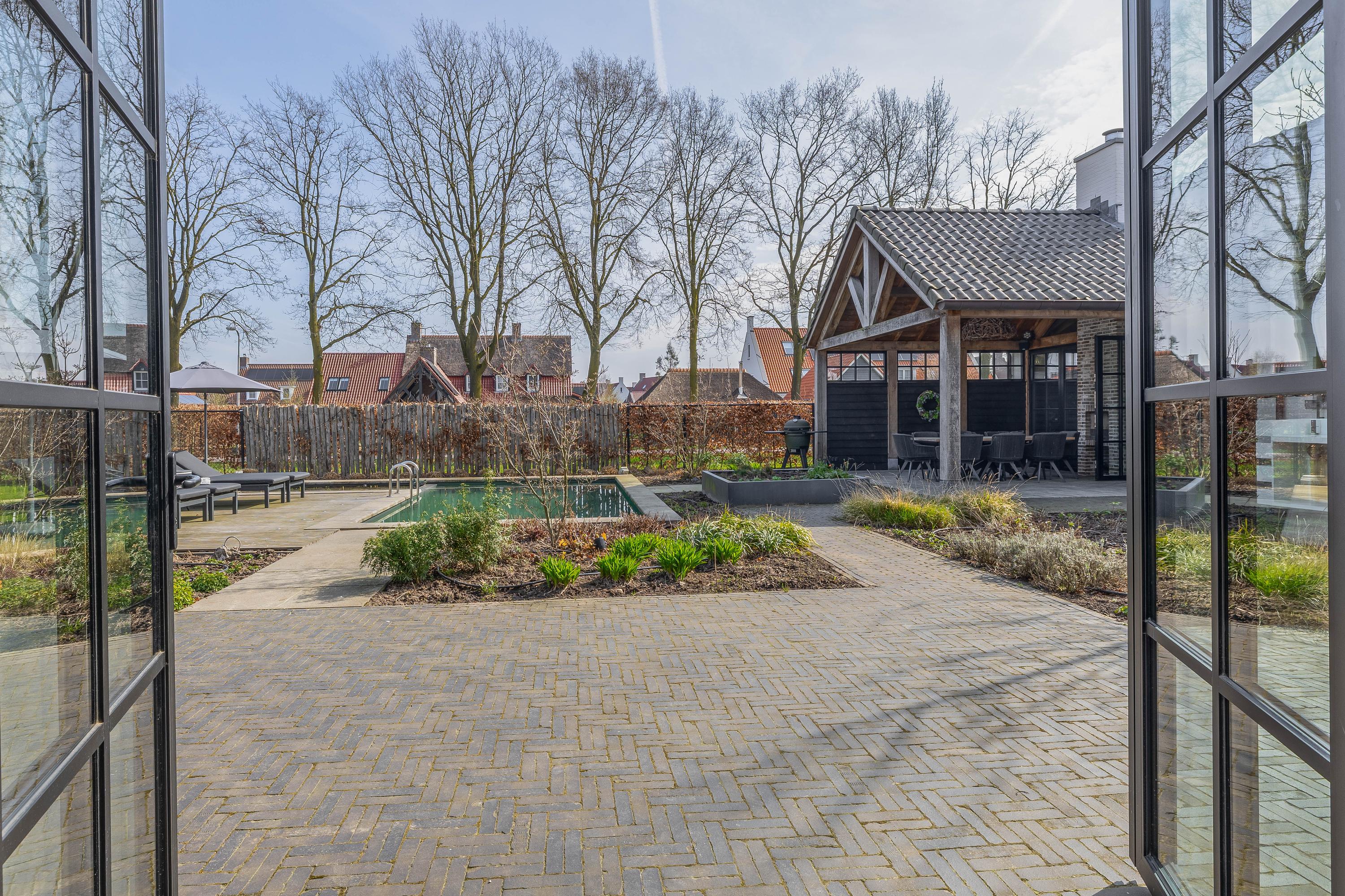 The adjacent (fully insulated) garden shed, with a high continuous ceiling, is perfect for use as a chill-out space, studio, or extra office. The garden shed is styled in harmony with the house. The garden, landscaped by an architect, is a true work of art with rich borders, elegant hedges, atmospheric pathways, and lush lawns. The carefully chosen boundary walls and playful materials create a dynamic and inviting outdoor experience. Not to mention the water paradise, which flows into a rustic pond area, creating a perfect balance between luxury and nature.