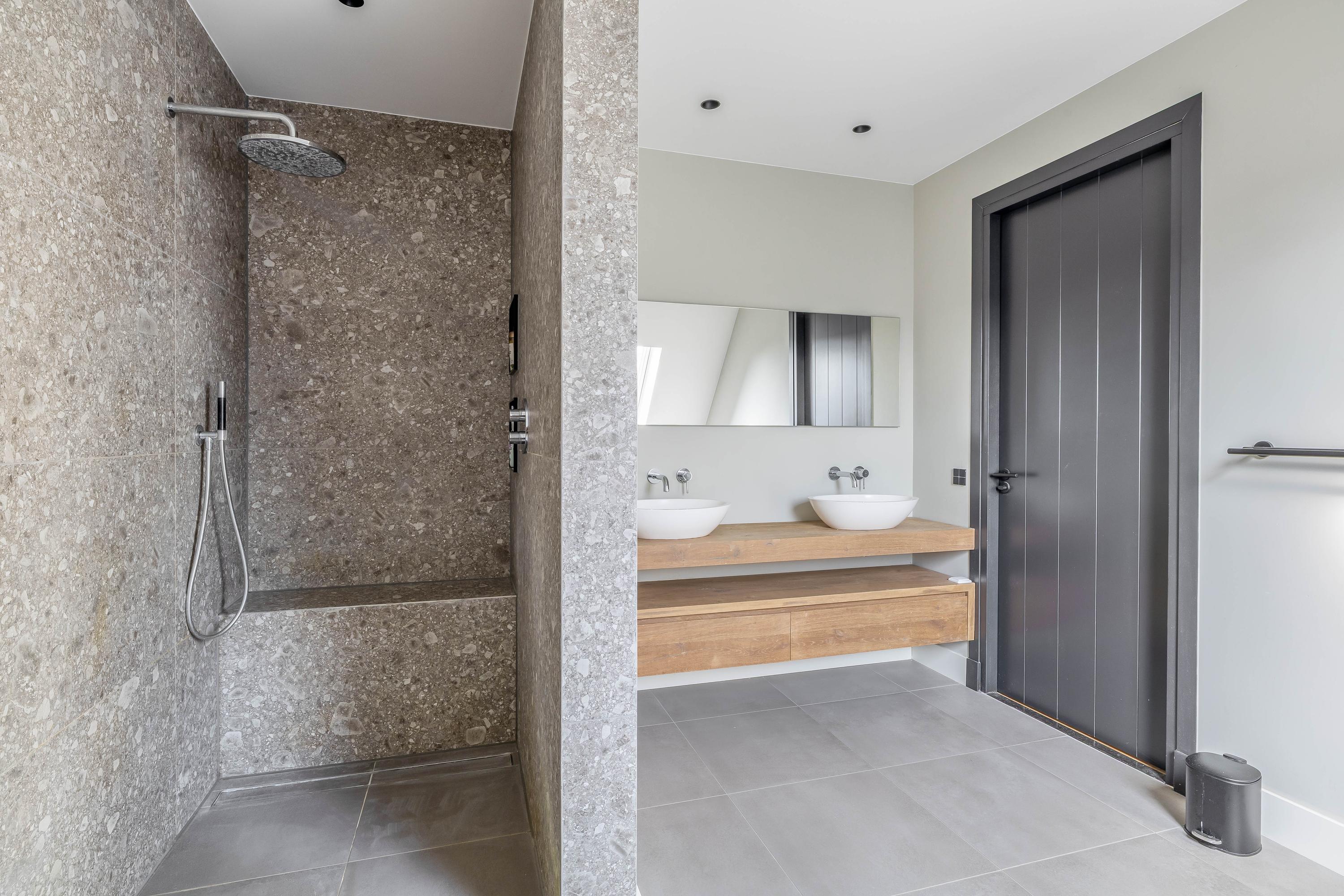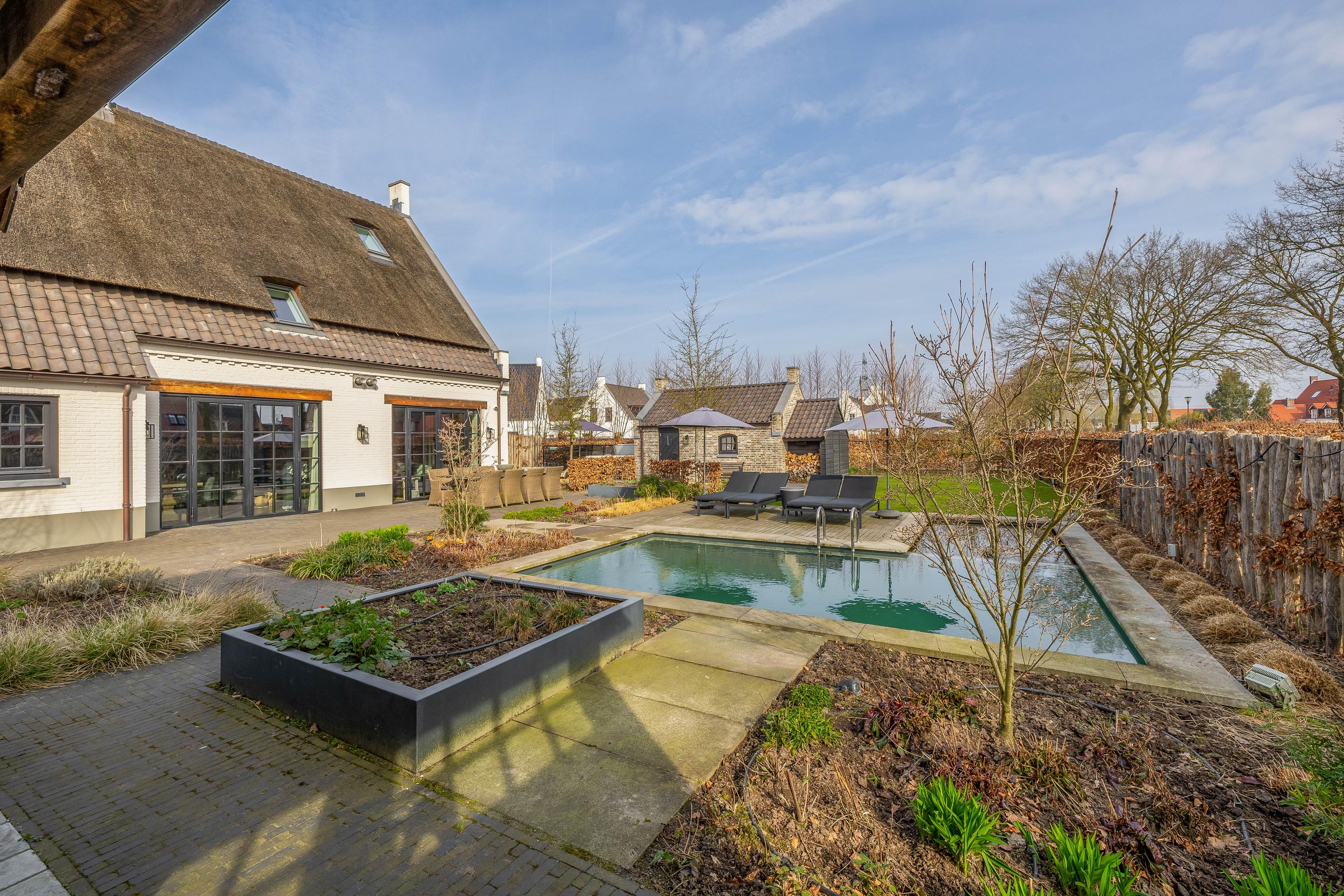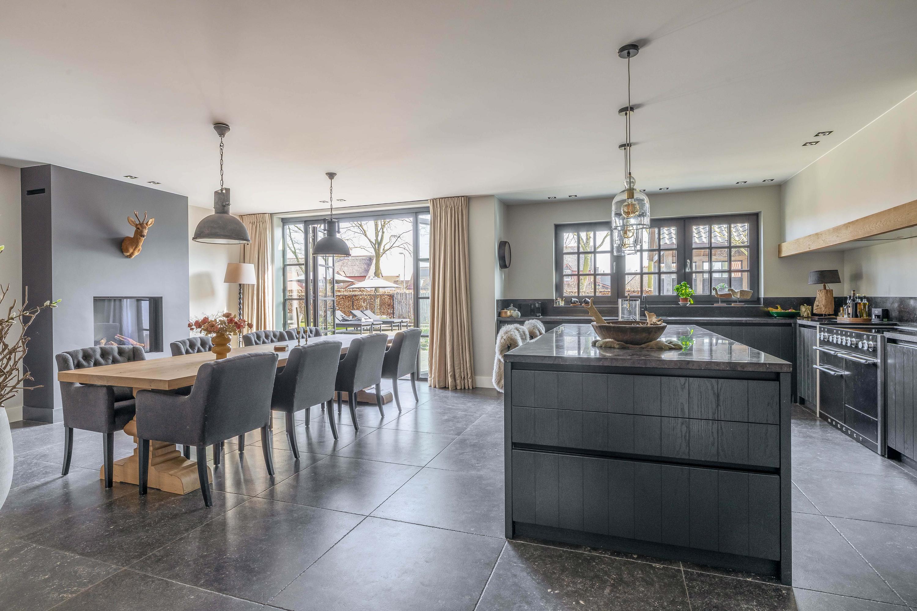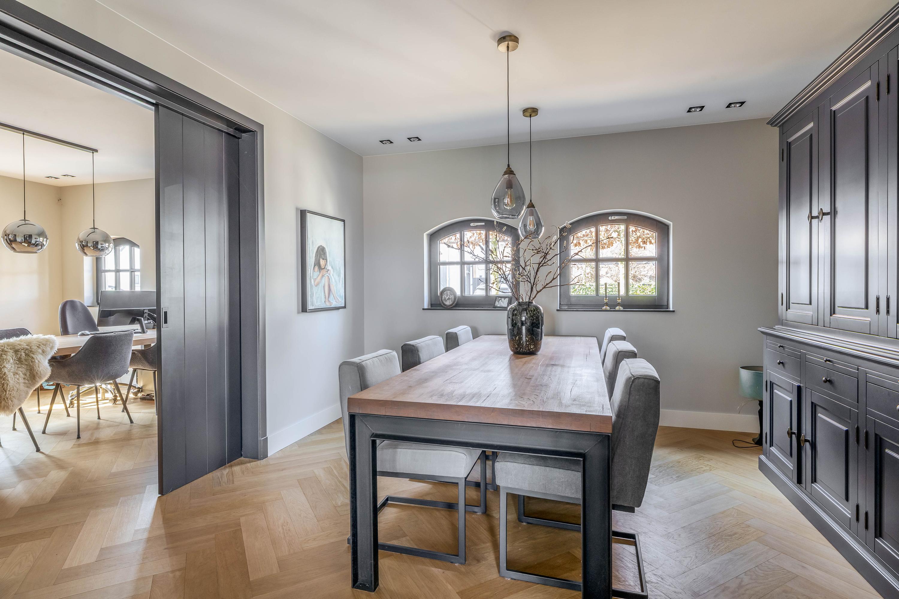 This farmhouse offers you a rare opportunity to live in an oasis of luxury, comfort, and privacy. With attention to detail, high-quality materials, and a thoughtful layout, every floor showcases a cohesive design where ceramic tiles, an oak herringbone floor, and meticulously applied stucco unite to form a warm and elegant whole. The seamlessly coordinated materials and finishes give every space a refined, consistent look.