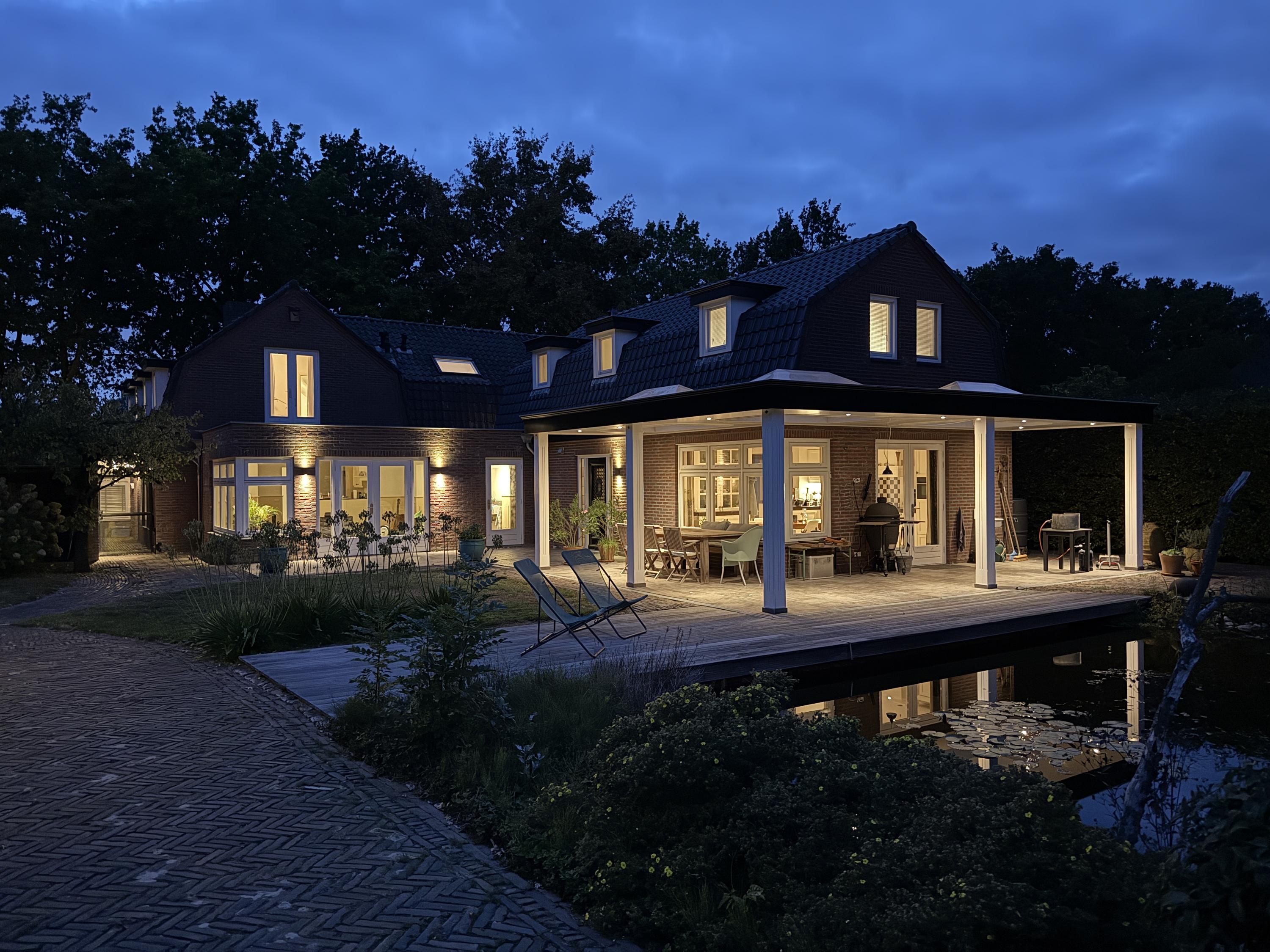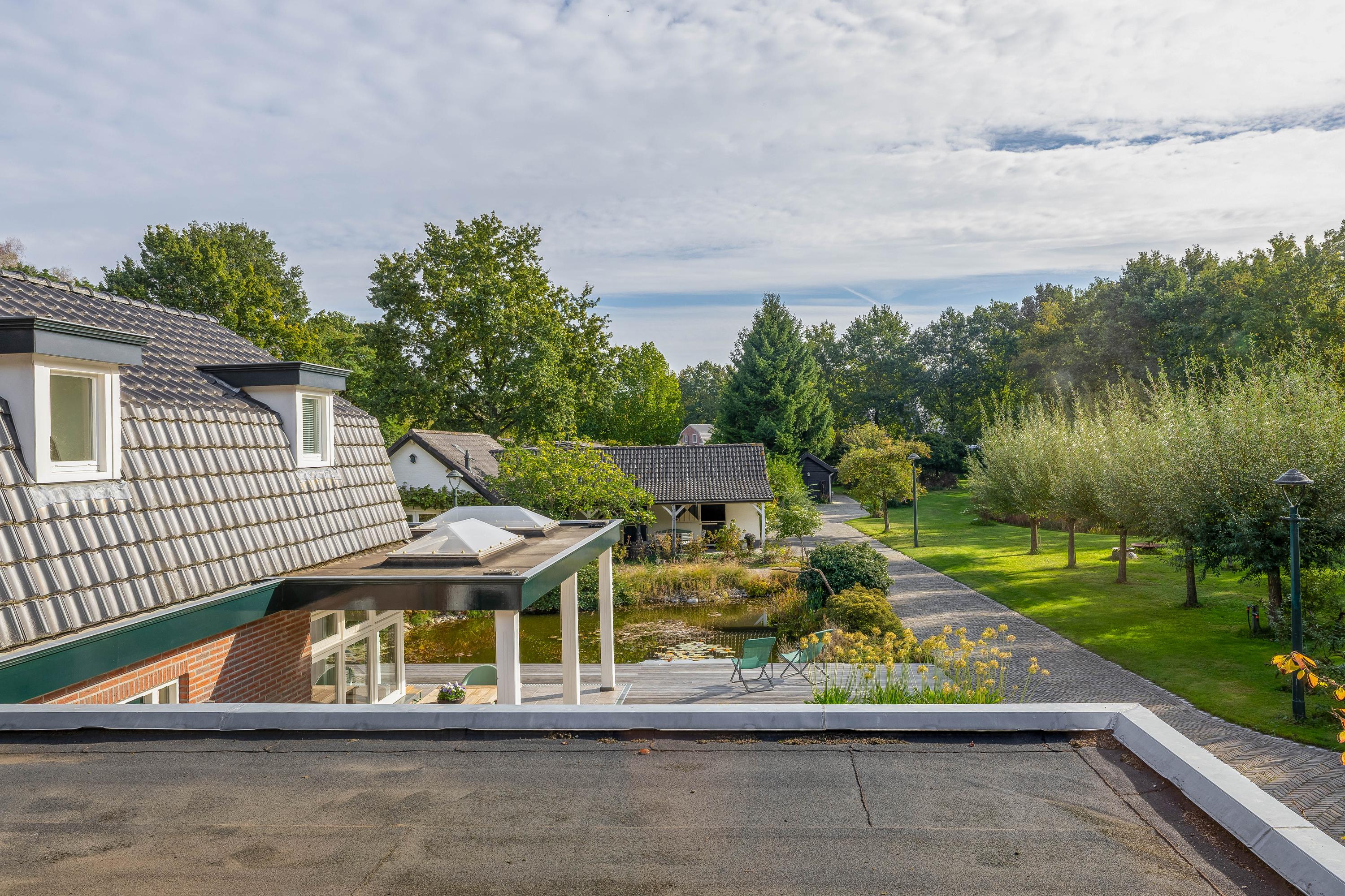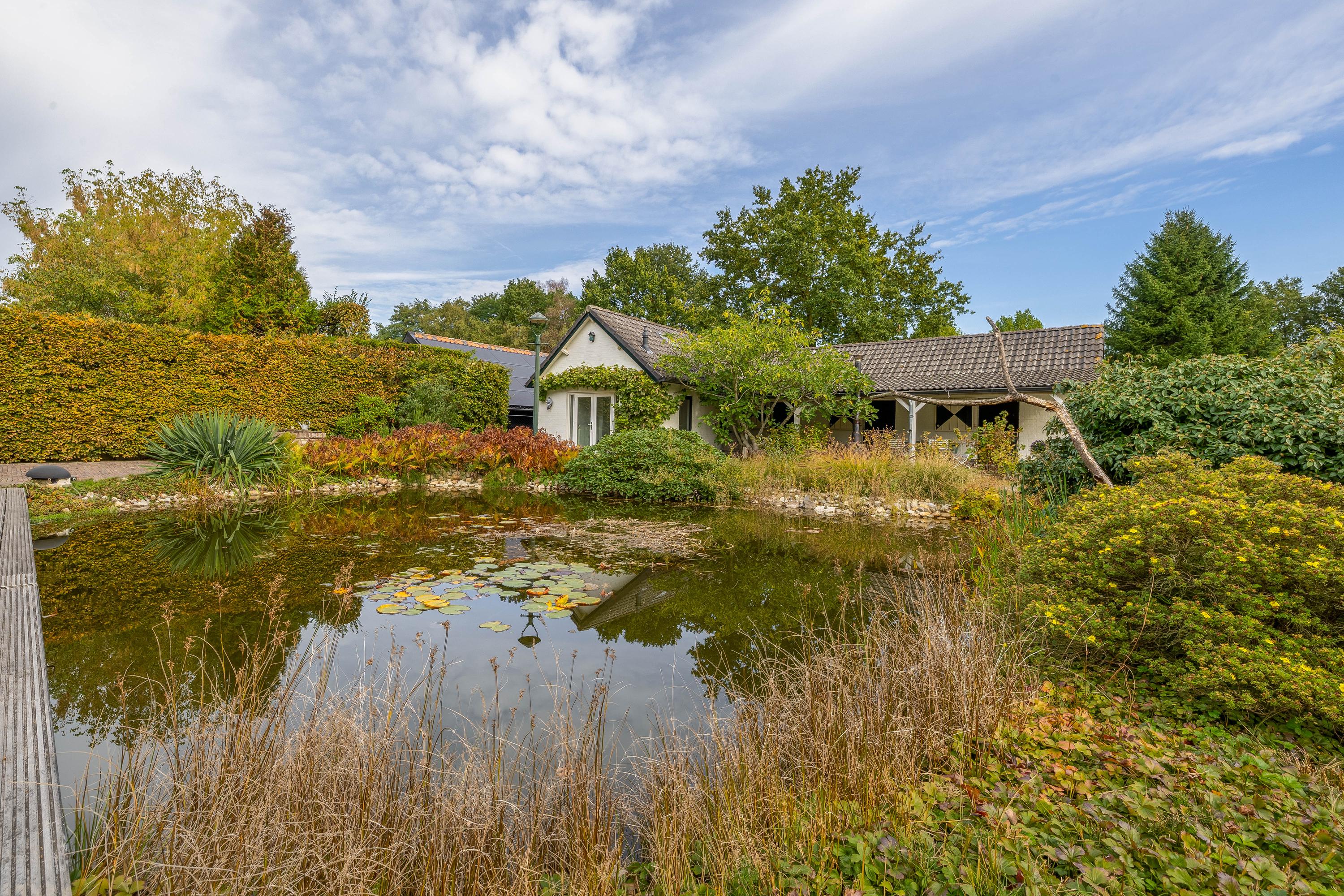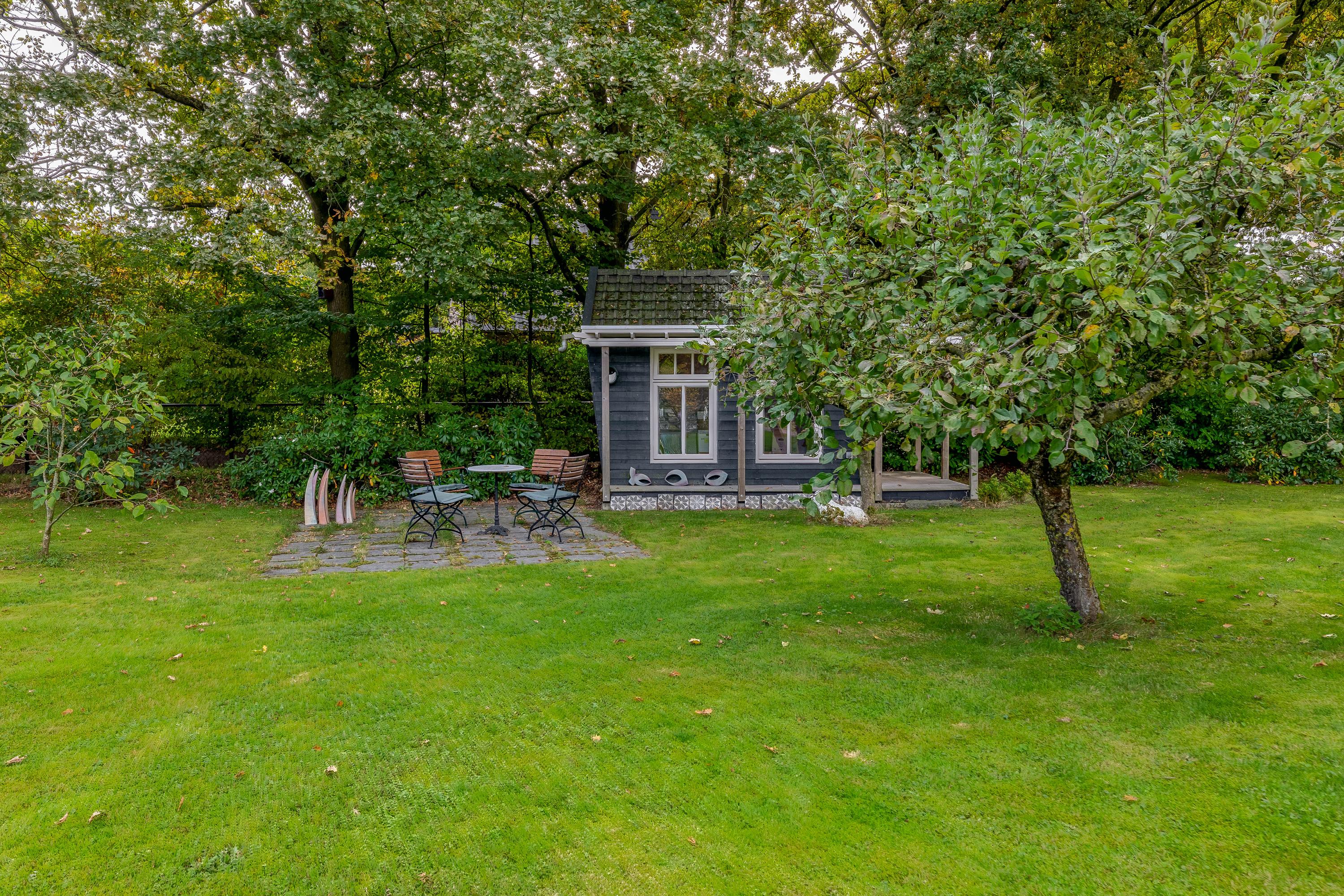 A very spacious, beautifully landscaped garden with a covered terrace at the rear and a charming terrace at the front; perfect for enjoying both the sun and the shade. The park-like grounds are further decorated with baked clinker paths, an elegant beech hedge and an impressive, sloping lawn. The large water feature with a beautiful decking terrace and a natural wadi further down the plot create a special harmony between water, nature and architecture. The garden also offers a variety of fruit and nut trees and raspberry bushes, which attract a rich variety of wildlife and birds. The “writer's cottage” is located at the front of the garden. This unique cottage is constructed of wood with a tiled roof and vinyl flooring. A decking terrace has been laid around the cottage. This charming cottage is suitable for various purposes: a playhouse for children, a workspace or a hobby room. The practical layout, with its own back entrance on both sides of the house, guarantees optimal accessibility and privacy.