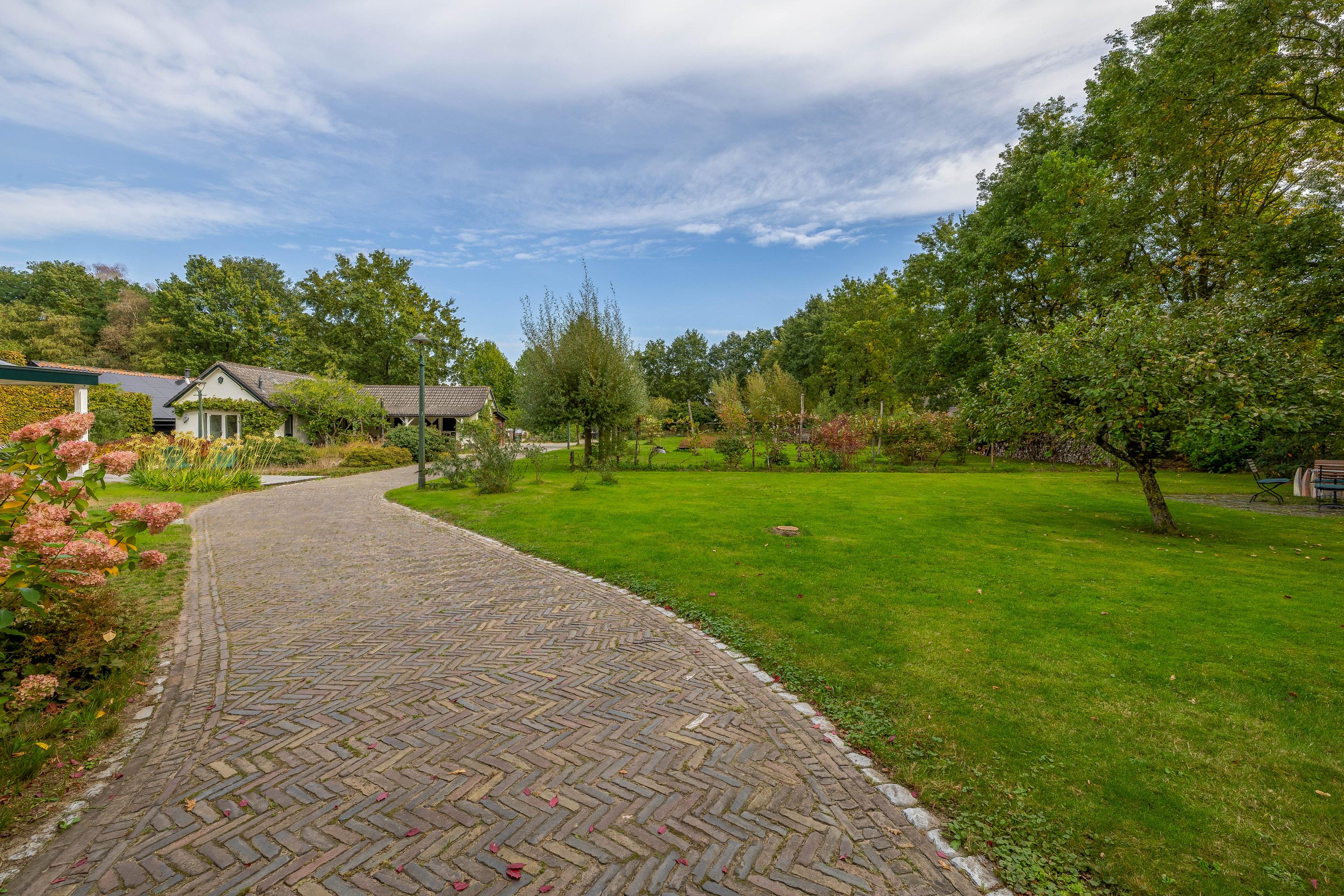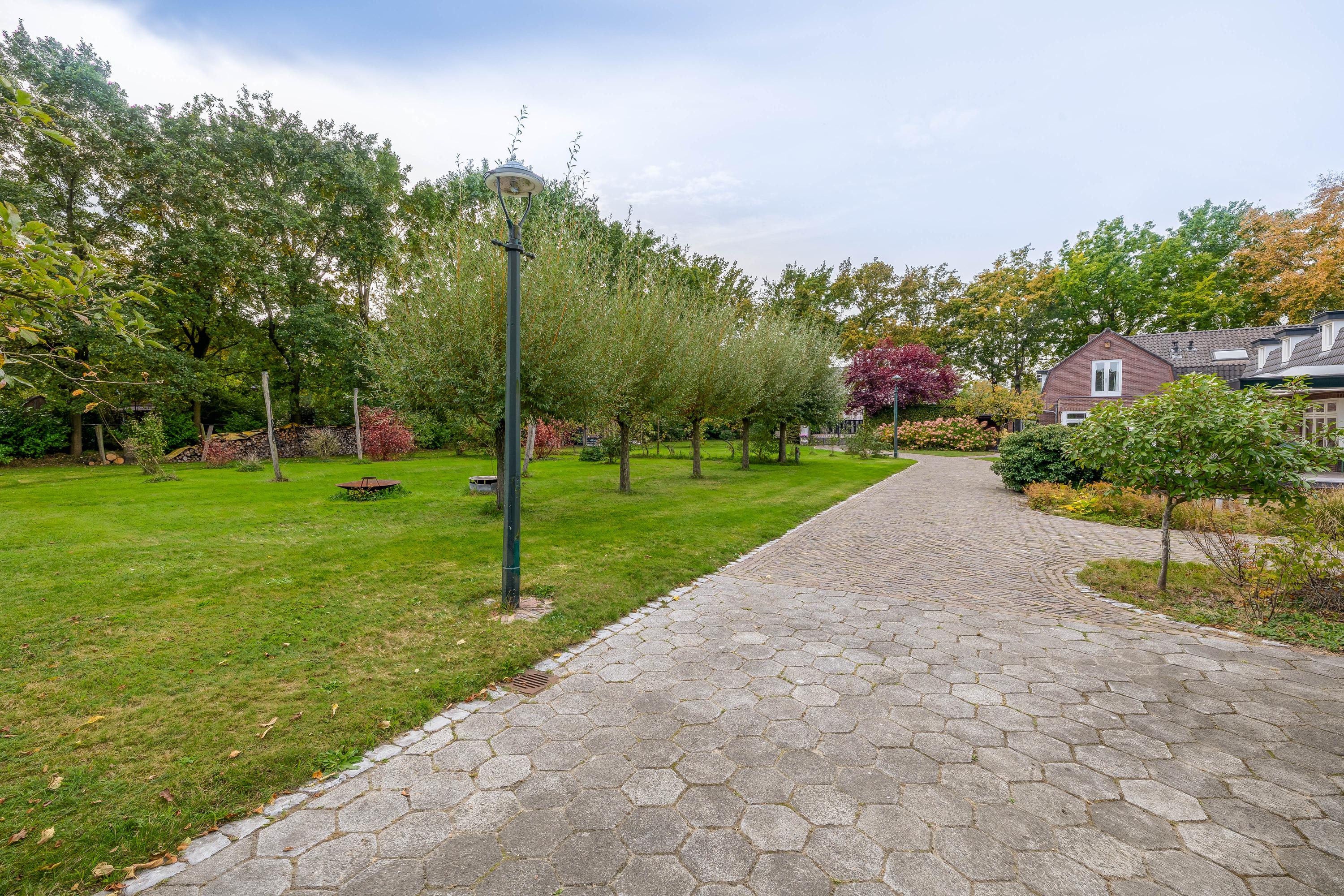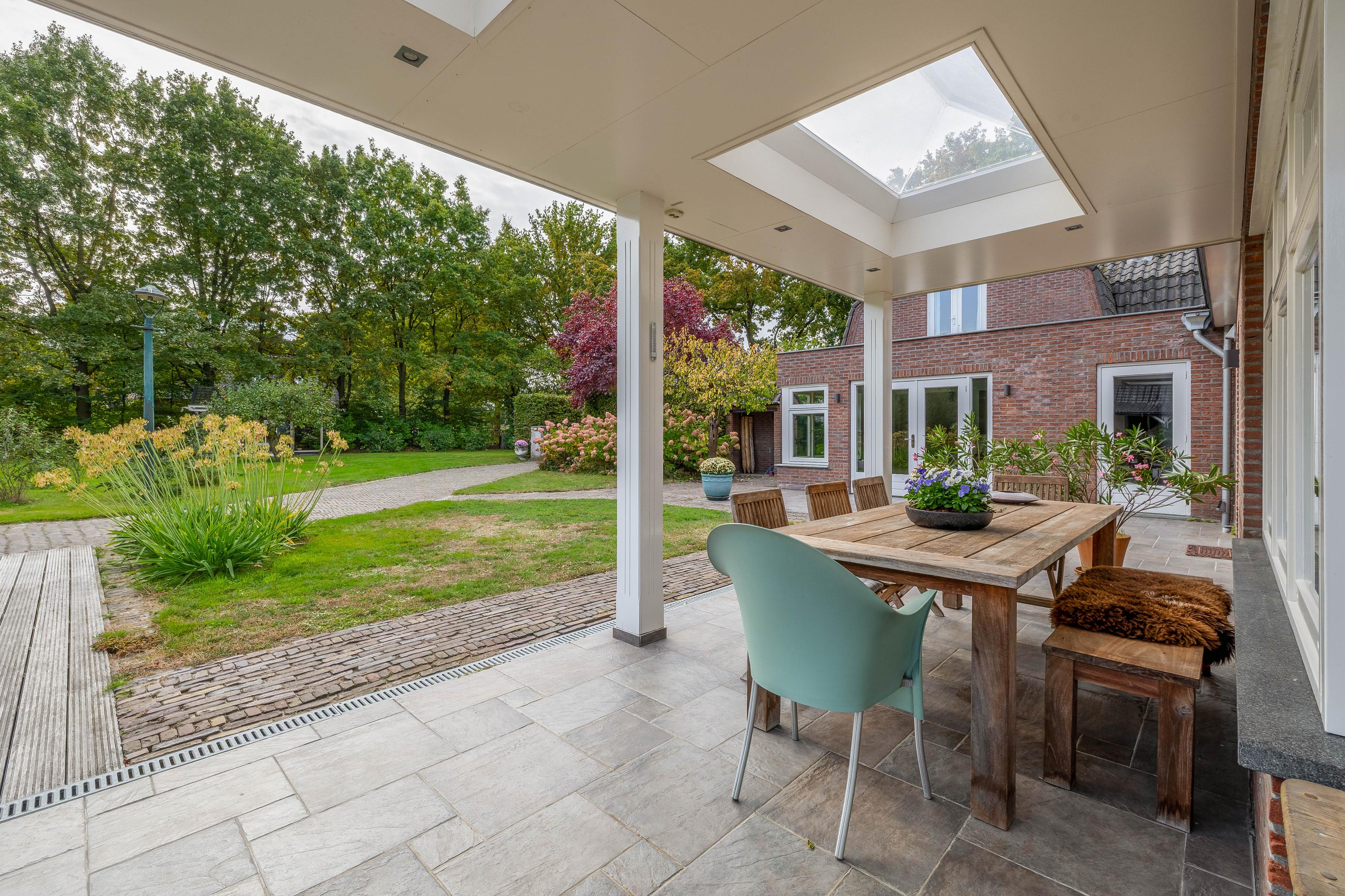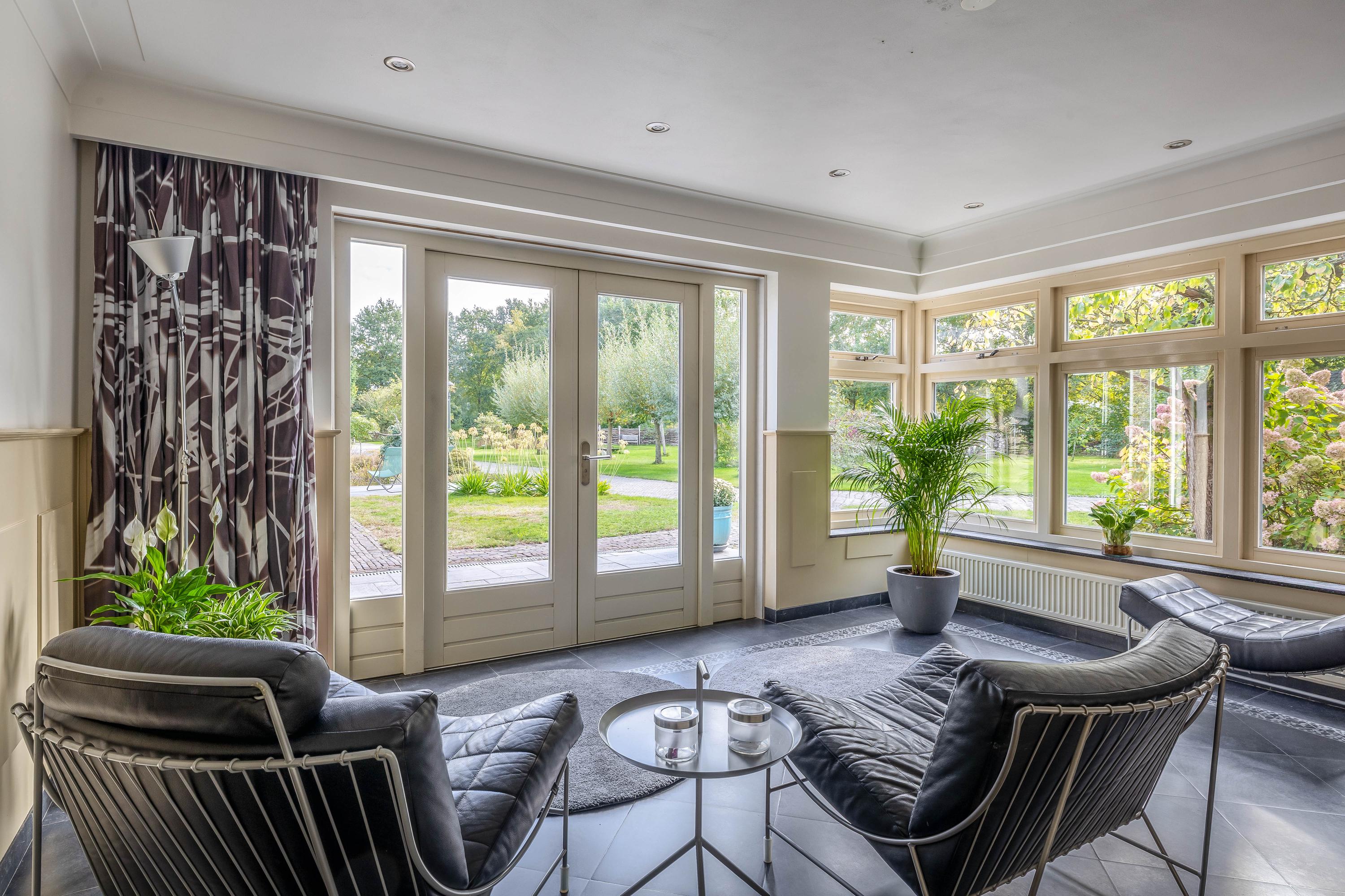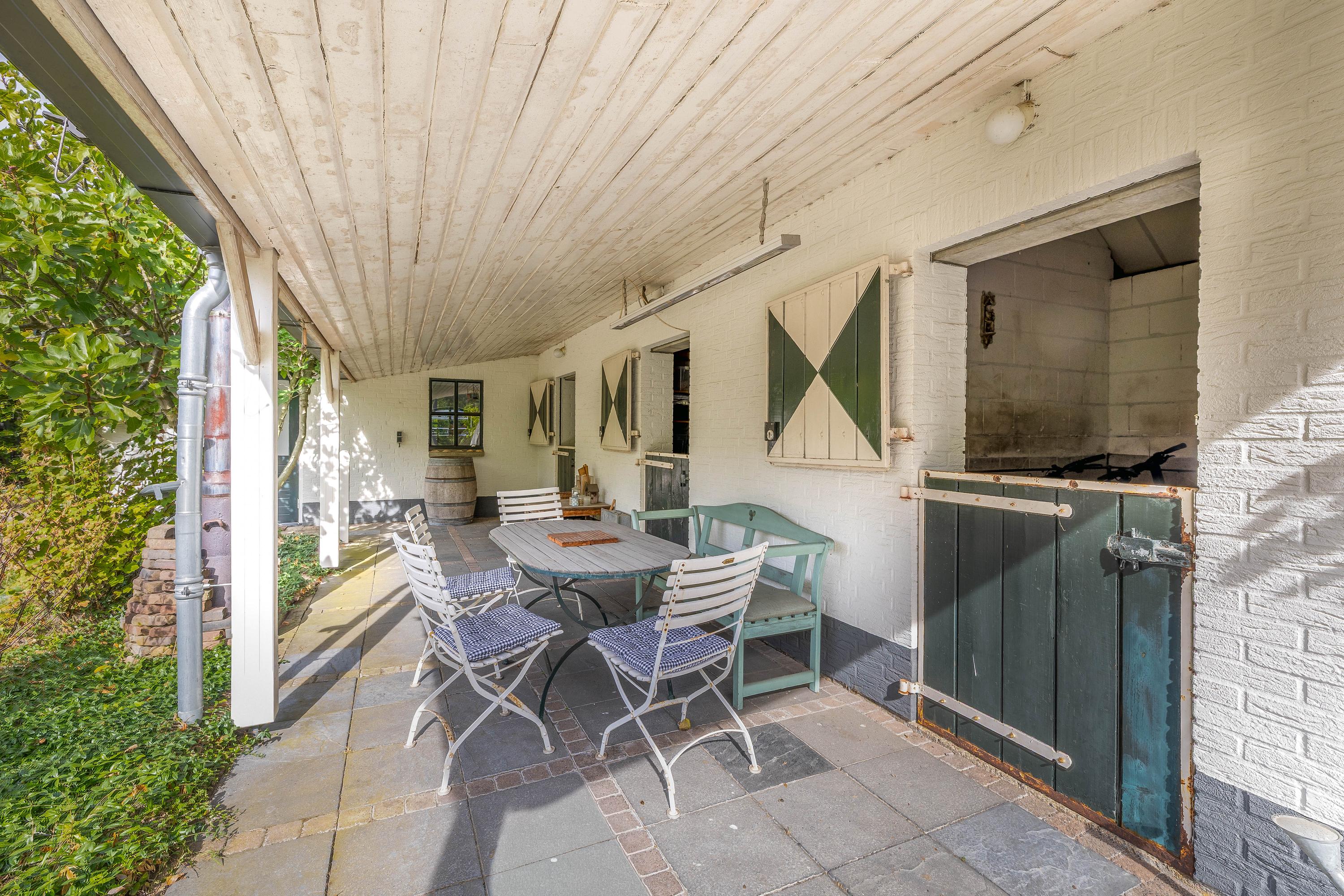 A very spacious, beautifully landscaped garden with a covered terrace at the rear and a charming terrace at the front; perfect for enjoying both the sun and the shade. The park-like grounds are further decorated with baked clinker paths, an elegant beech hedge and an impressive, sloping lawn. The large water feature with a beautiful decking terrace and a natural wadi further down the plot create a special harmony between water, nature and architecture. The garden also offers a variety of fruit and nut trees and raspberry bushes, which attract a rich variety of wildlife and birds. The “writer's cottage” is located at the front of the garden. This unique cottage is constructed of wood with a tiled roof and vinyl flooring. A decking terrace has been laid around the cottage. This charming cottage is suitable for various purposes: a playhouse for children, a workspace or a hobby room. The practical layout, with its own back entrance on both sides of the house, guarantees optimal accessibility and privacy.