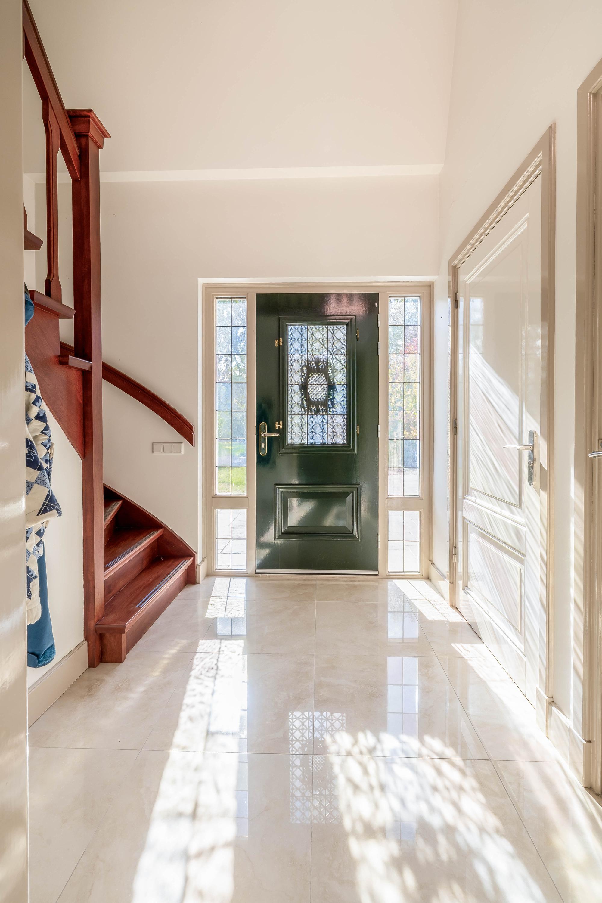 attractive natural stone staircase provides access to the first floor. A characteristic door with a stained glass