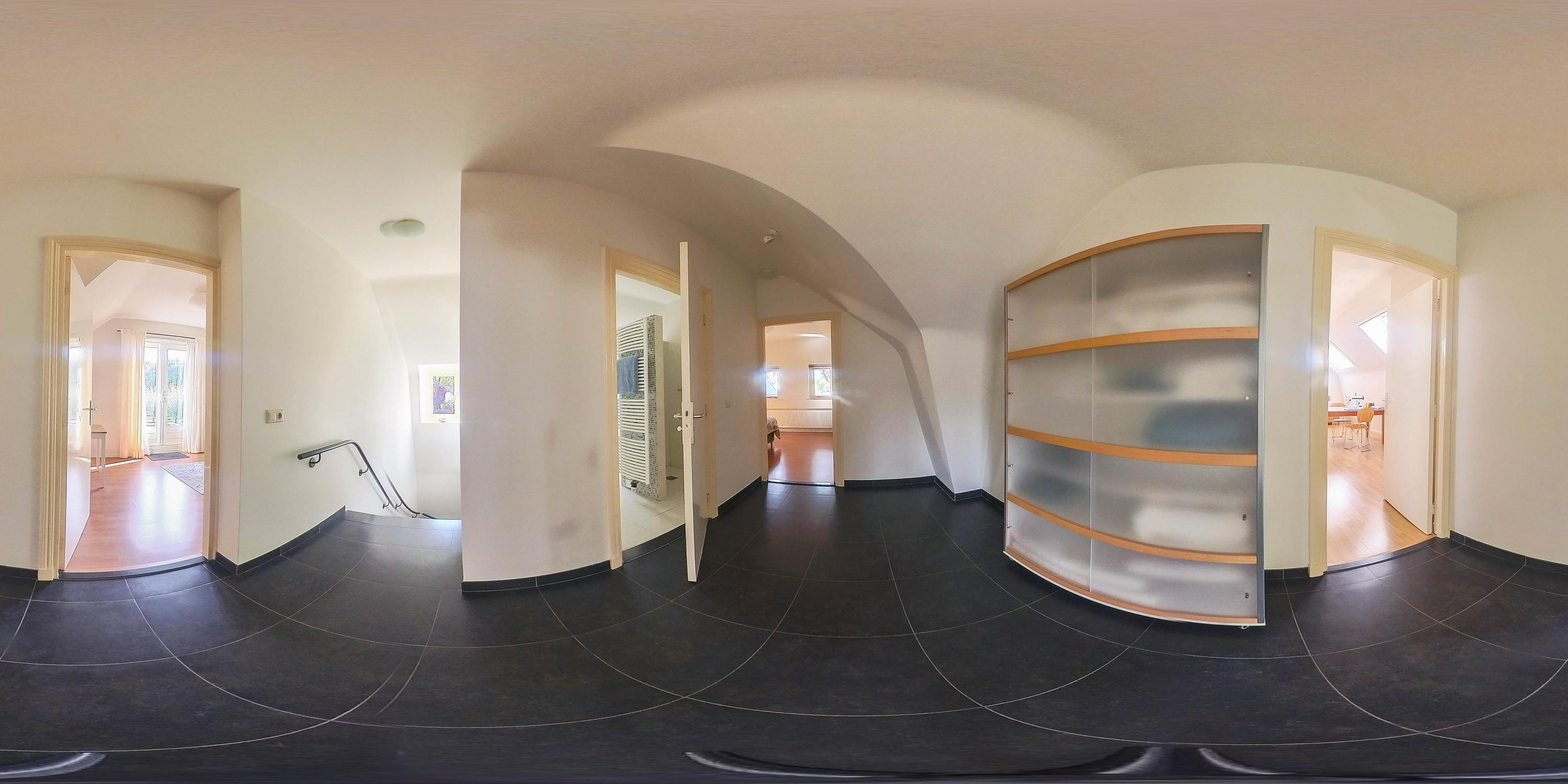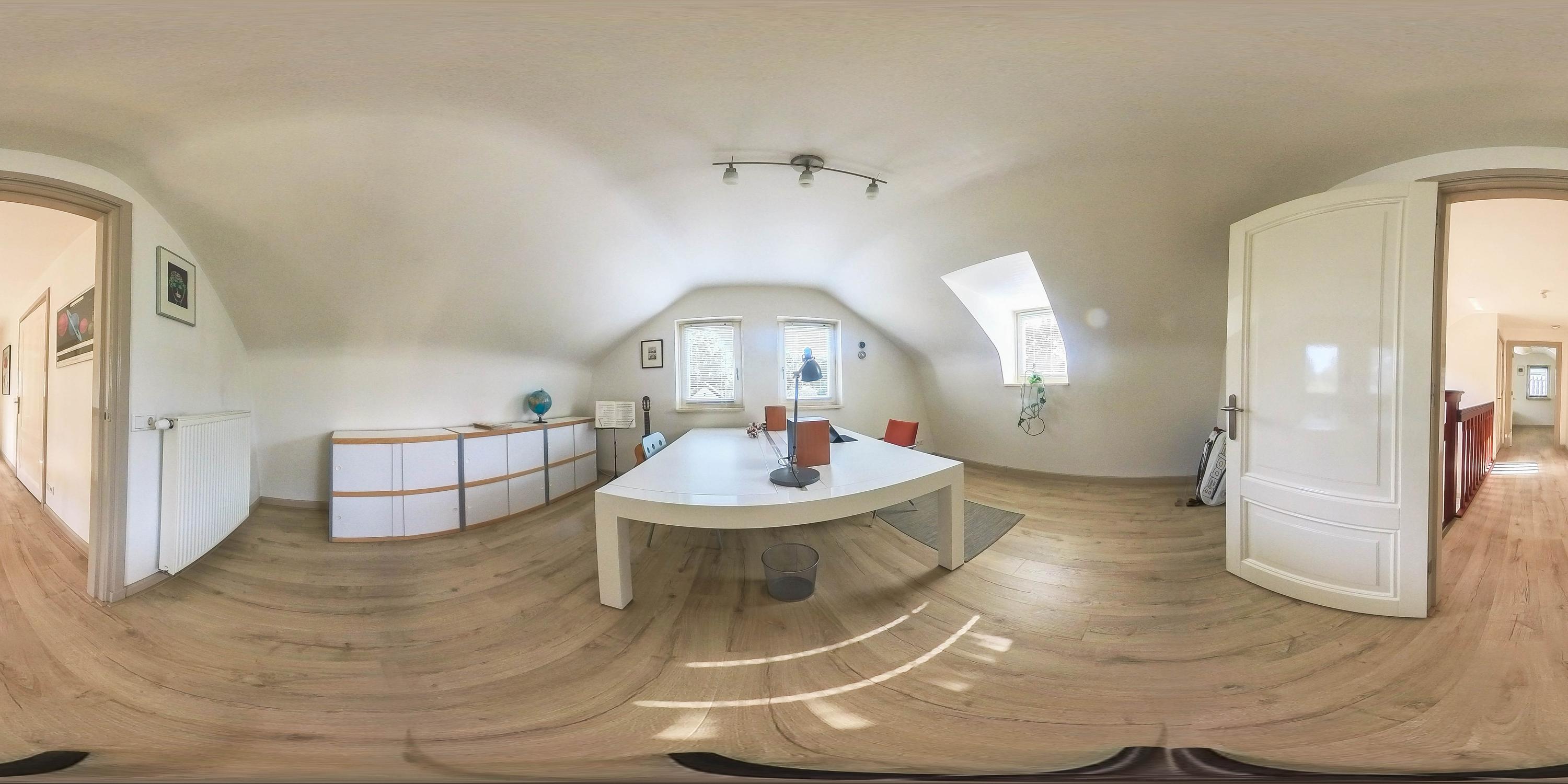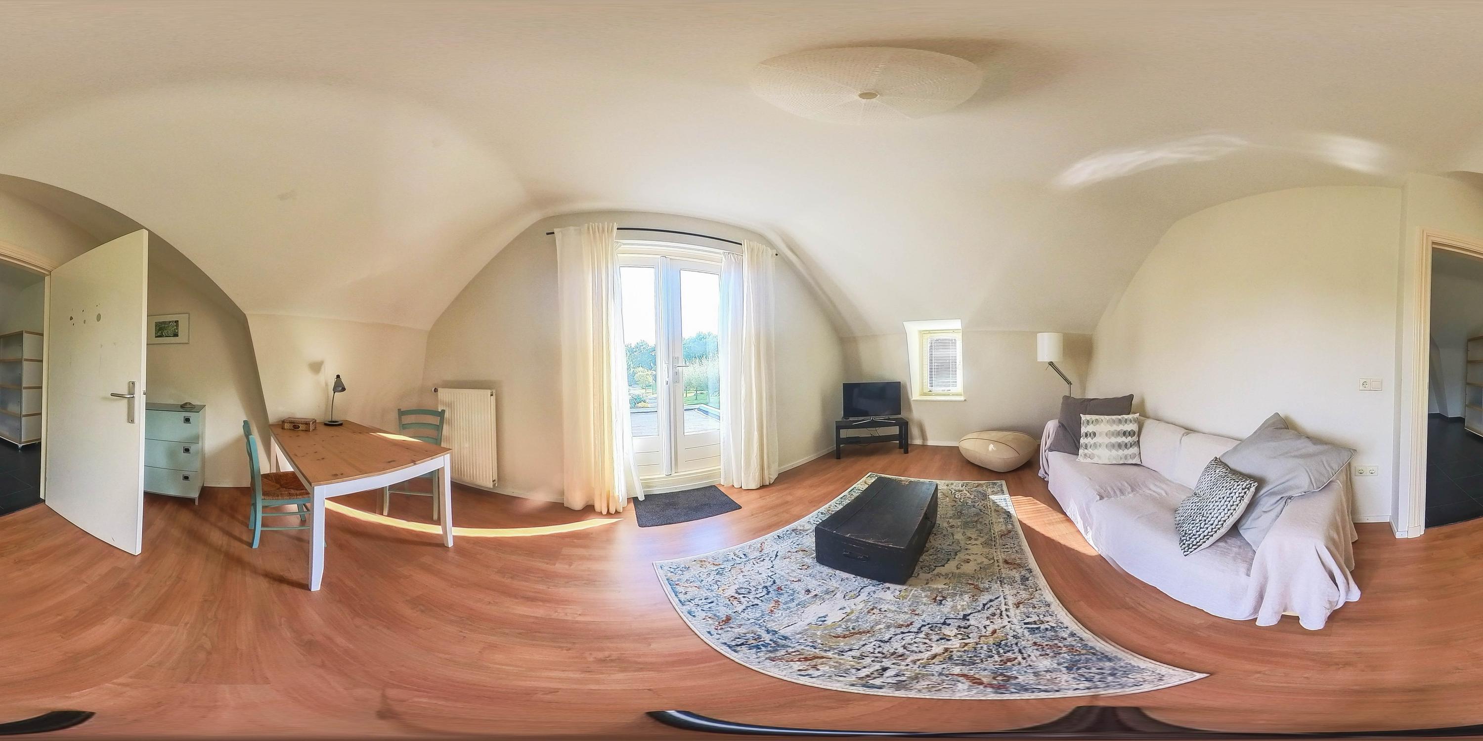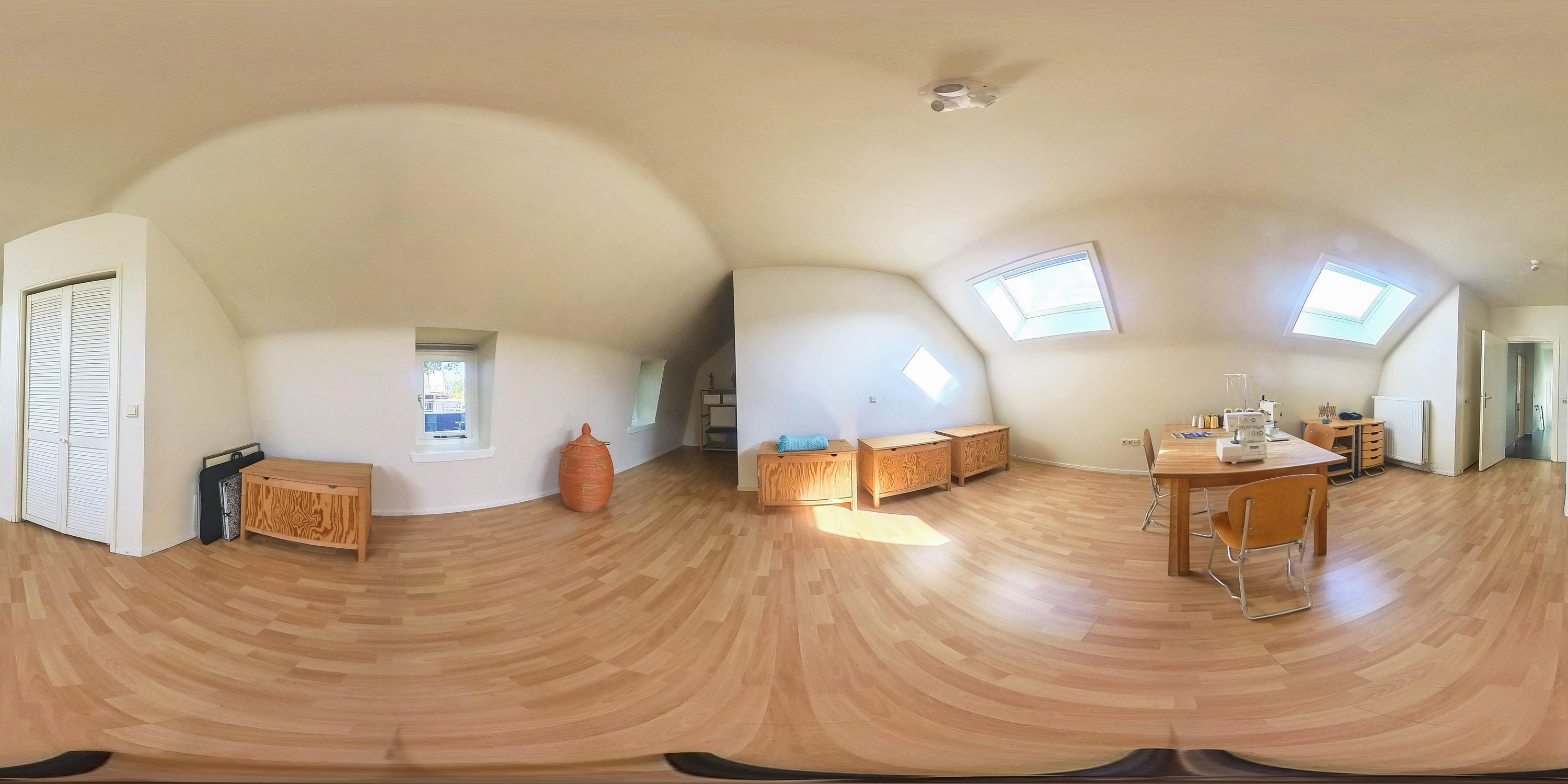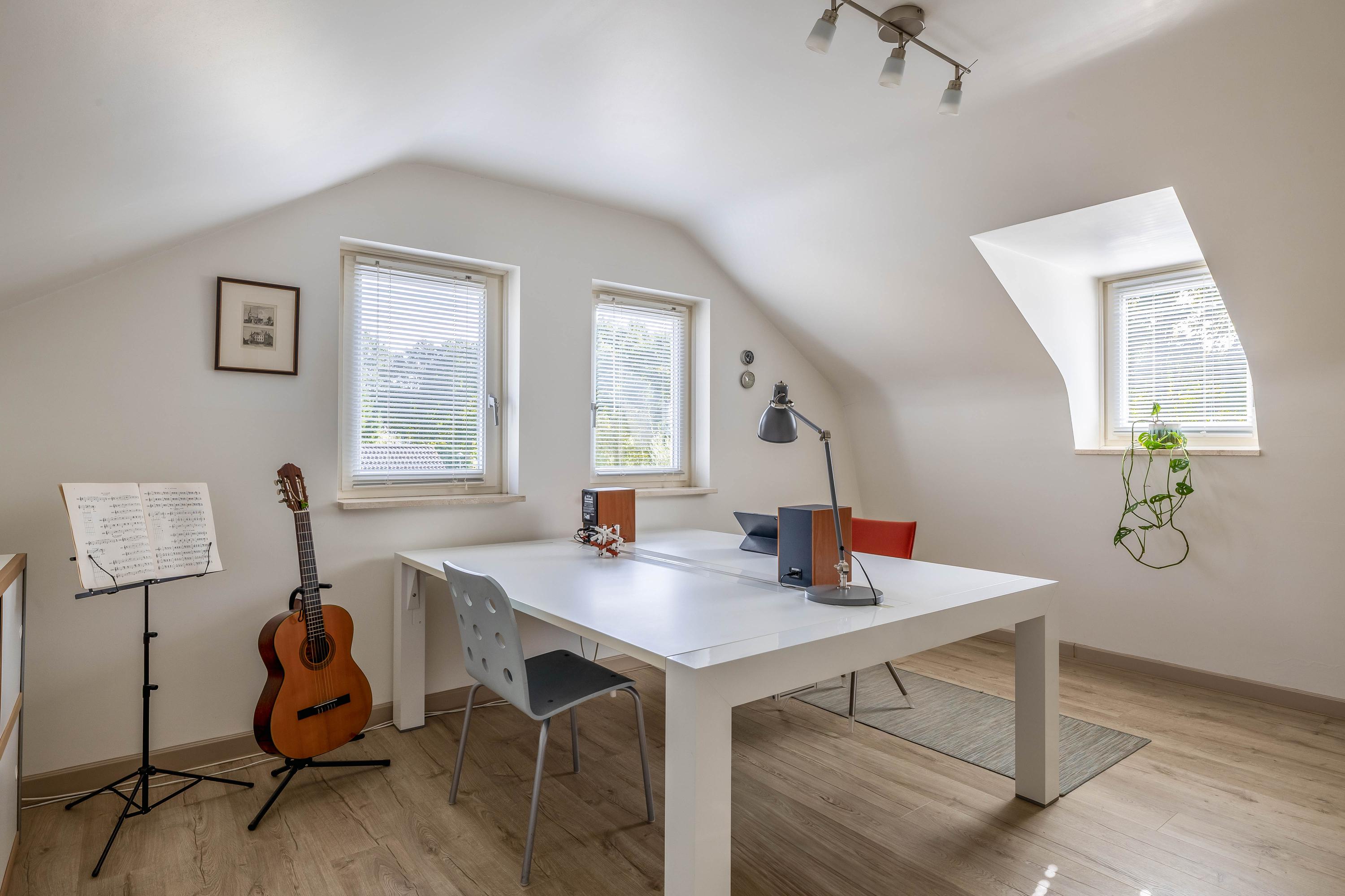 the same finish: laminate flooring, stucco walls and a stucco ceiling. The bedroom on the right has French doors that provide access to the flat roof. From here you have a beautiful view of the garden. The largest bedroom is currently furnished as a hobby room and has a walk-in wardrobe, storage room and a central heating