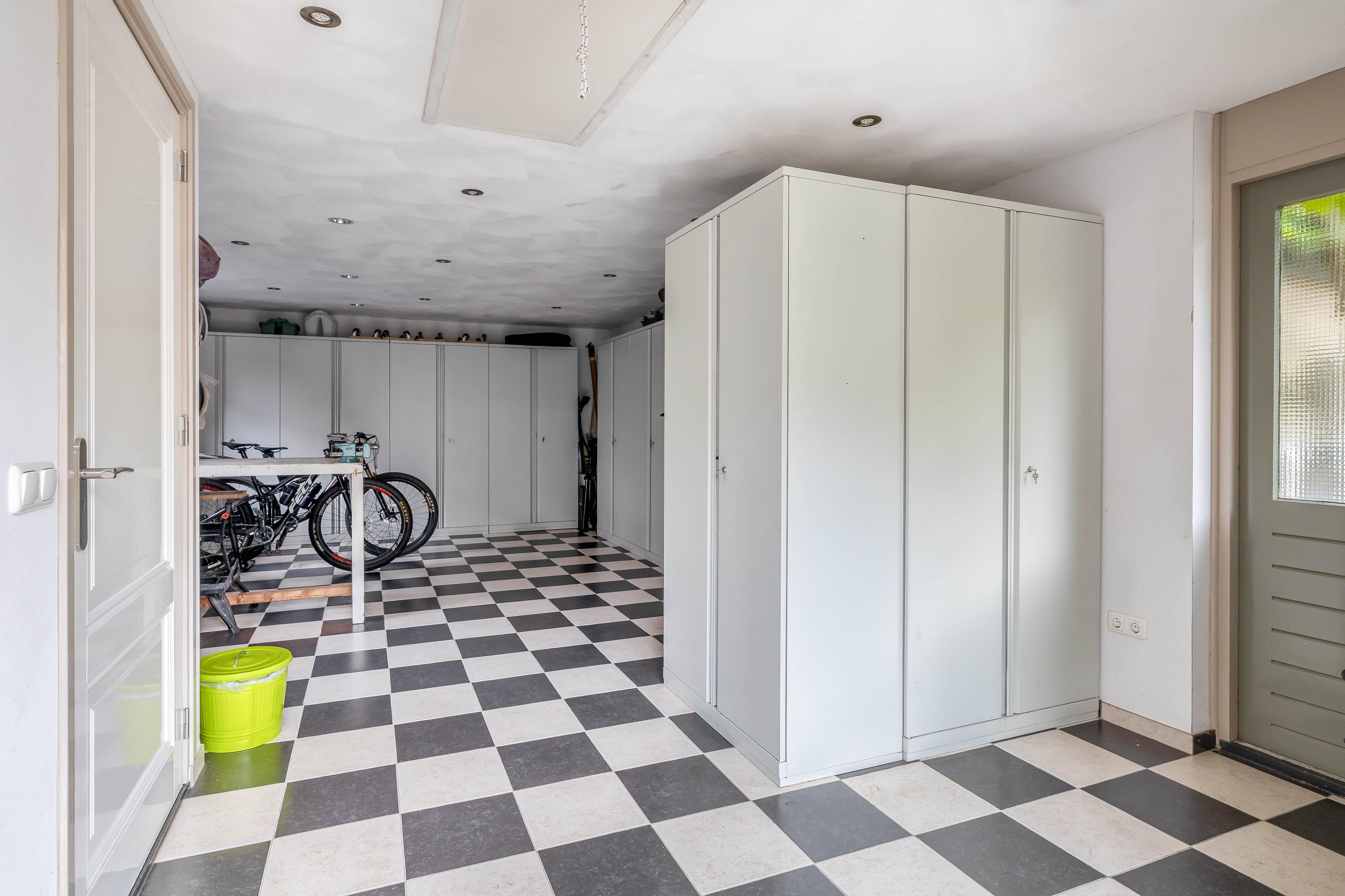 window provides access to the living room. The living room has a marble tiled floor with underfloor heating, stucco walls and a stucco ceiling with decorative mouldings. Thanks to the many windows and a large bay window, the room enjoys plenty of natural light, creating a spacious effect. Adjacent to the living room is a versatile space, ideal for an inspiring workspace or a cosy play area. The space can be closed off with a sliding door with stained glass. The kitchen has a corner layout and is equipped with a 5-burner gas hob, combination microwave/oven, sink, American fridge and dishwasher. Various base and wall cabinets provide storage space. There is enough space to place a dining table. The kitchen has a tiled floor with bis. The walls are partly finished with sleek stucco and partly with wooden panelling. The ceiling has stucco with decorative mouldings. The kitchen is open to the adjoining garden room. Here too, large windows provide a sea of light and a beautiful view of the surrounding garden. A wonderful place to relax! The walls are partly finished with sleek stucco and partly with wooden panelling. The ceiling is also finished with stucco and decorative mouldings. French doors provide access to the garden. There is also access to the utility room from here. The utility room is a practical space, equipped with a sink, a storage cupboard and a fixed cupboard wall with sliding doors. There is also a toilet. A door provides access to the garden. You can also reach the rear of the house from this room.