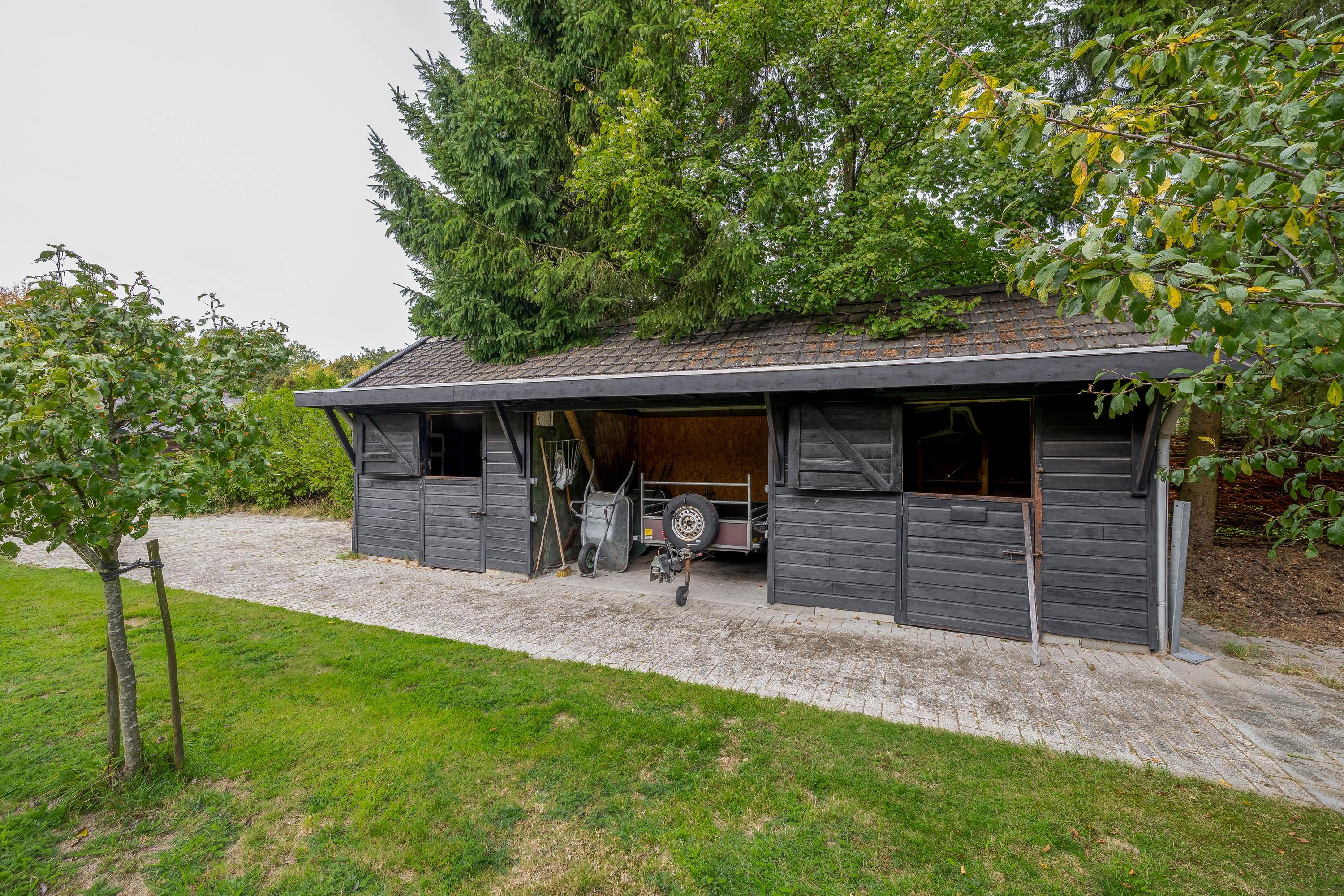 The outbuilding is constructed of brickwork and the roof is insulated and covered with roof tiles. French doors in the front façade provide access from the garden to a pleasant space finished with a tiled floor, stucco walls and a sanded ceiling with recessed lighting. This space is ideal for use as a hobby or chill-out room. In addition, the outbuilding also has its own central heating boiler and shower room, which is equipped with a walk-in shower, toilet and washbasin. A loft ladder provides access to the storage attic. The space is currently used as a hobby room, but is of course also very suitable for various other purposes. On the right-hand side of the building are three former horse stalls. These stalls are equipped with divisible doors with an overhang at the front. The stalls are currently used as storage spaces. One of the stalls houses the inverter for the solar panels. There is a sink. The overhang at the front is spacious and can serve as a covered terrace, a wonderful place to sit. At the rear is a shed with wooden walls and a corrugated iron roof. This