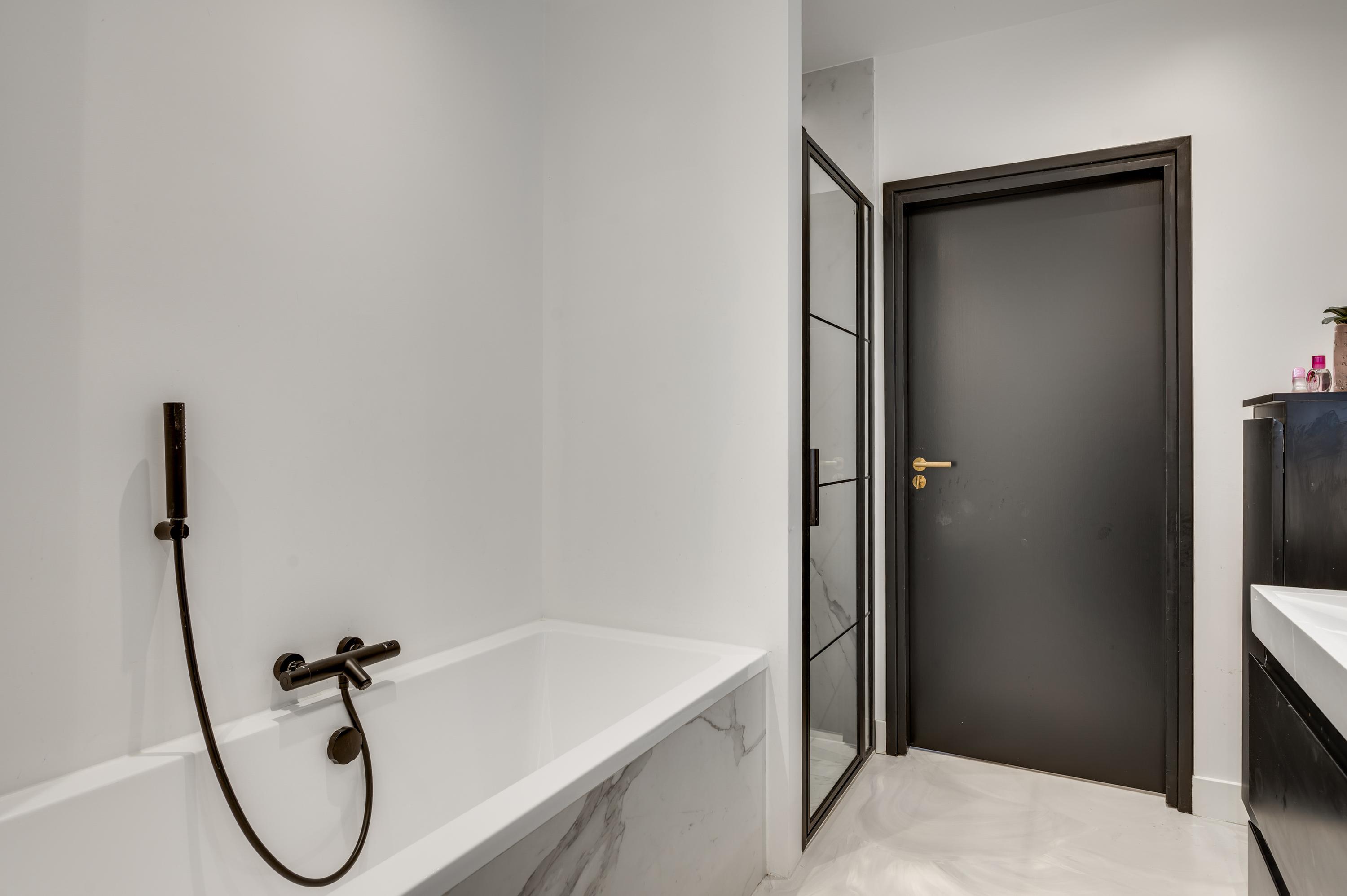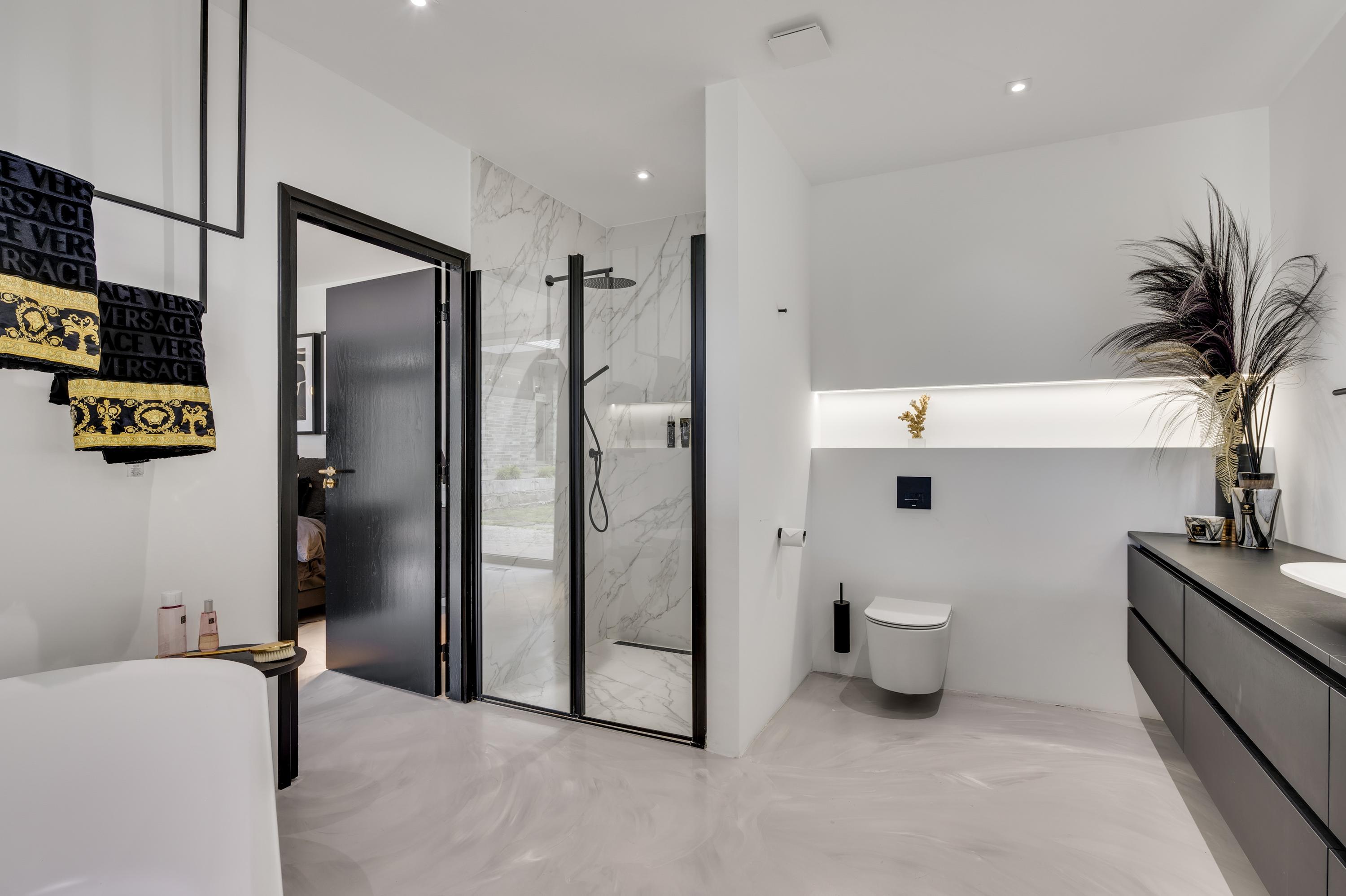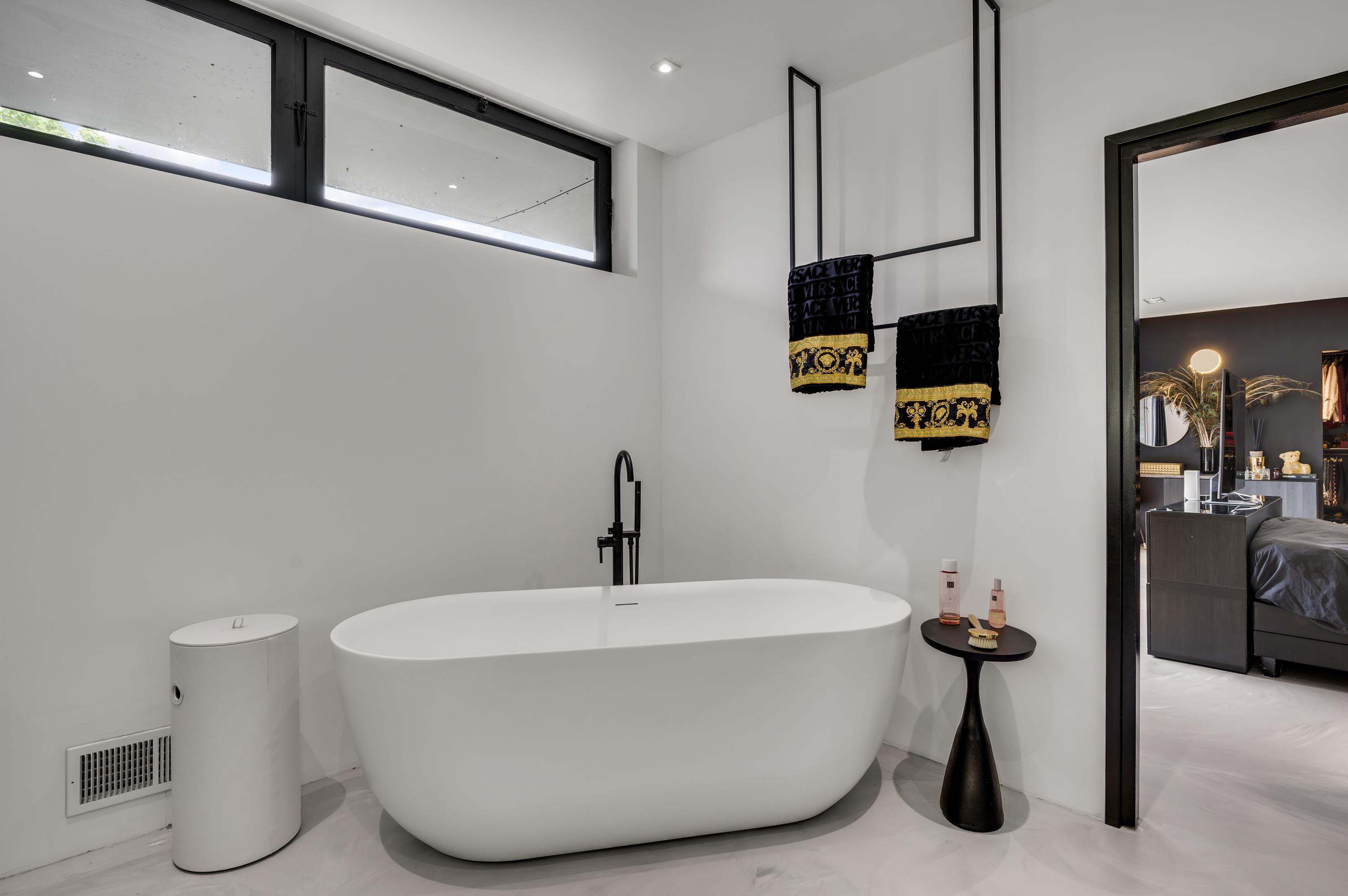 The east wing is fully furnished as sleeping quarters. It contains five bedrooms, including a spacious master bedroom with its own dressing room, luxurious bathroom, and direct access to a covered terrace overlooking the garden. The other four bedrooms share two stylish bathrooms, each equipped with a bathtub, walk-in shower, double sink, and wall-mounted toilet.