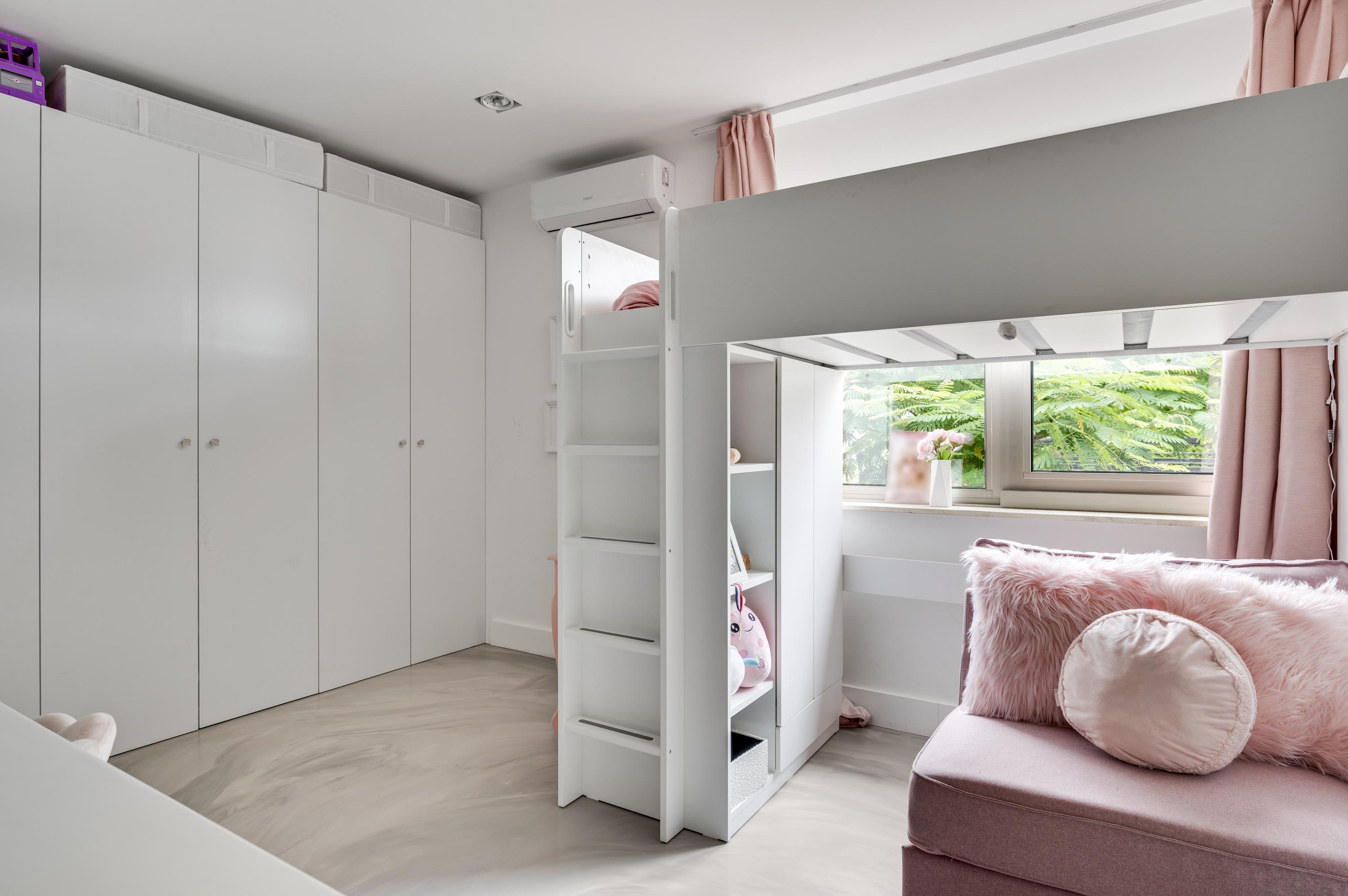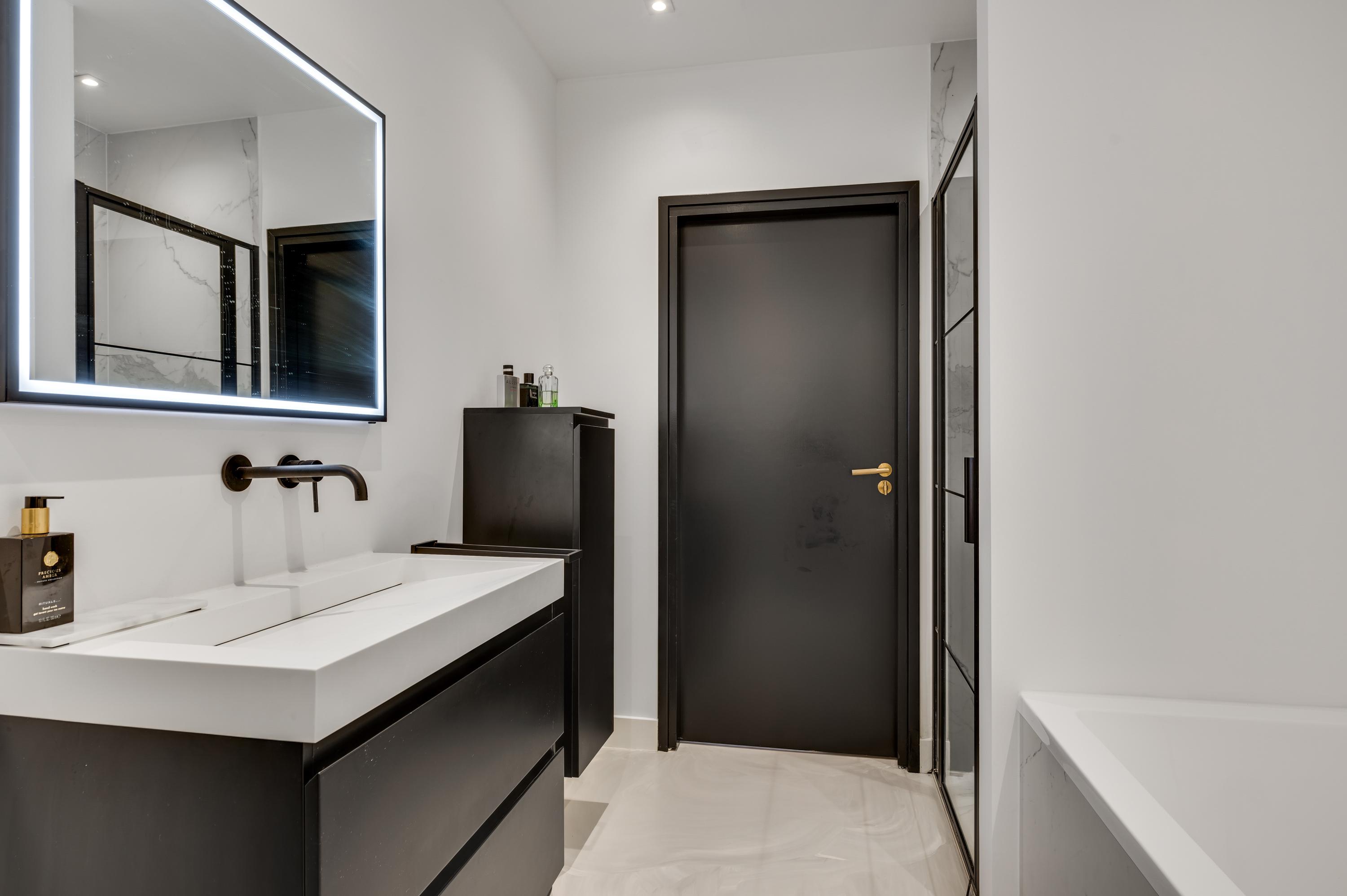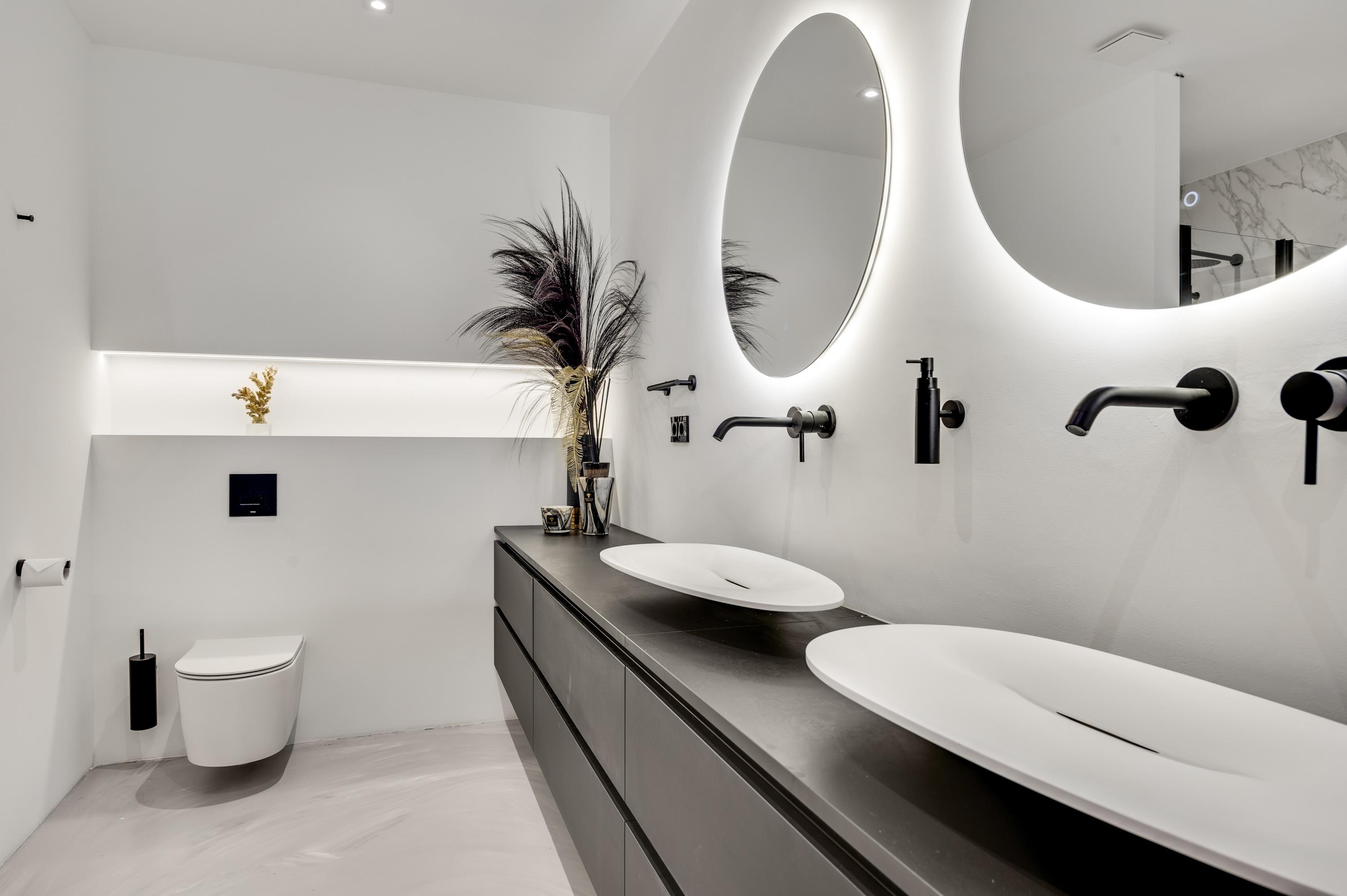 The east wing is fully furnished as sleeping quarters. It contains five bedrooms, including a spacious master bedroom with its own dressing room, luxurious bathroom, and direct access to a covered terrace overlooking the garden. The other four bedrooms share two stylish bathrooms, each equipped with a bathtub, walk-in shower, double sink, and wall-mounted toilet.