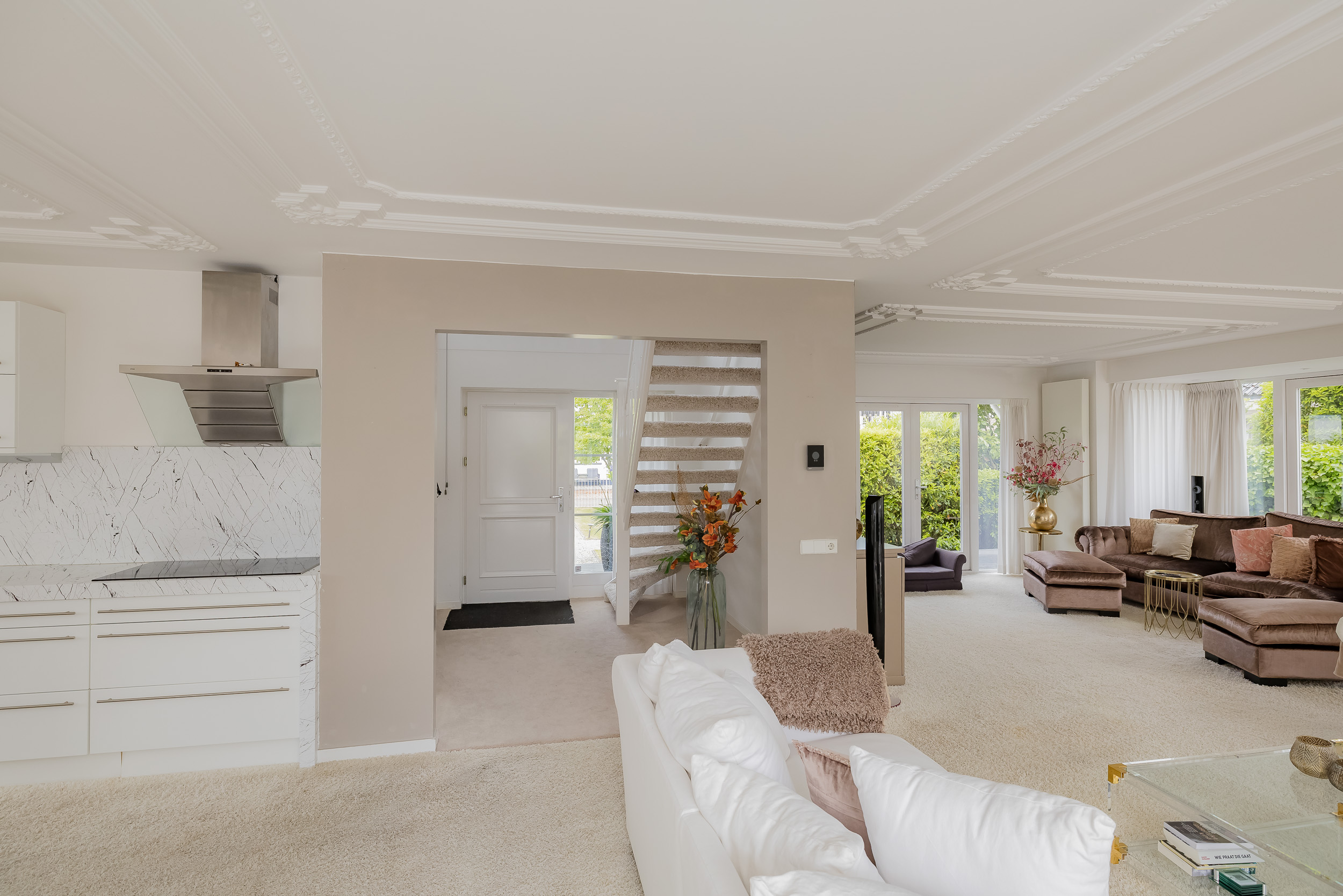 You enter the house through a generous hallway with loft and the staircase upstairs. A checkroom niche with toilet and meter cupboard provide a practical layout. The living room is spacious, bright and cozy and features a large bay window, classic decorative moldings on the ceiling and a cozy gas fireplace. Thanks to three pairs of double doors and a sliding door, the living room is in direct connection with the sunny terrace on the water.