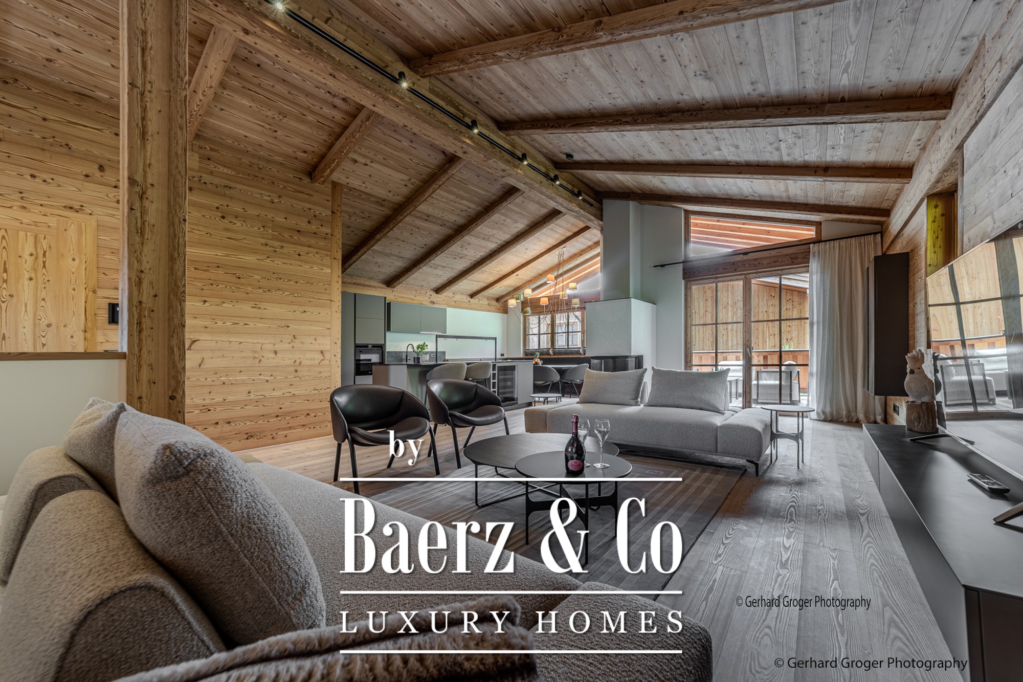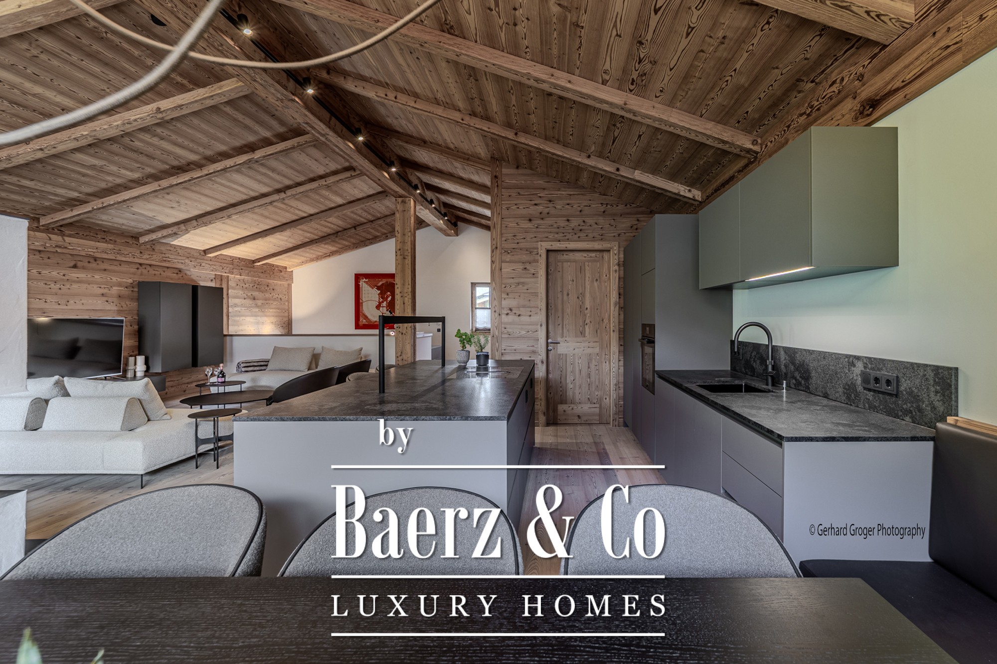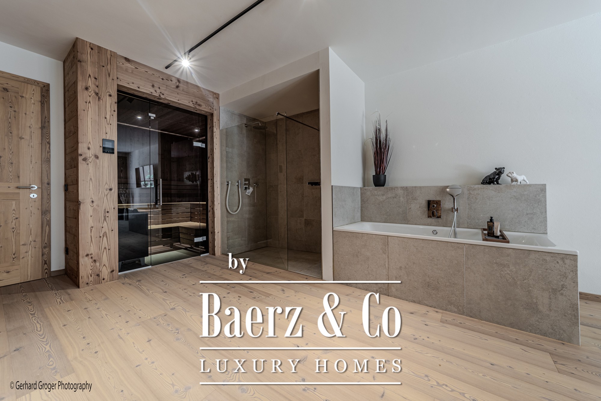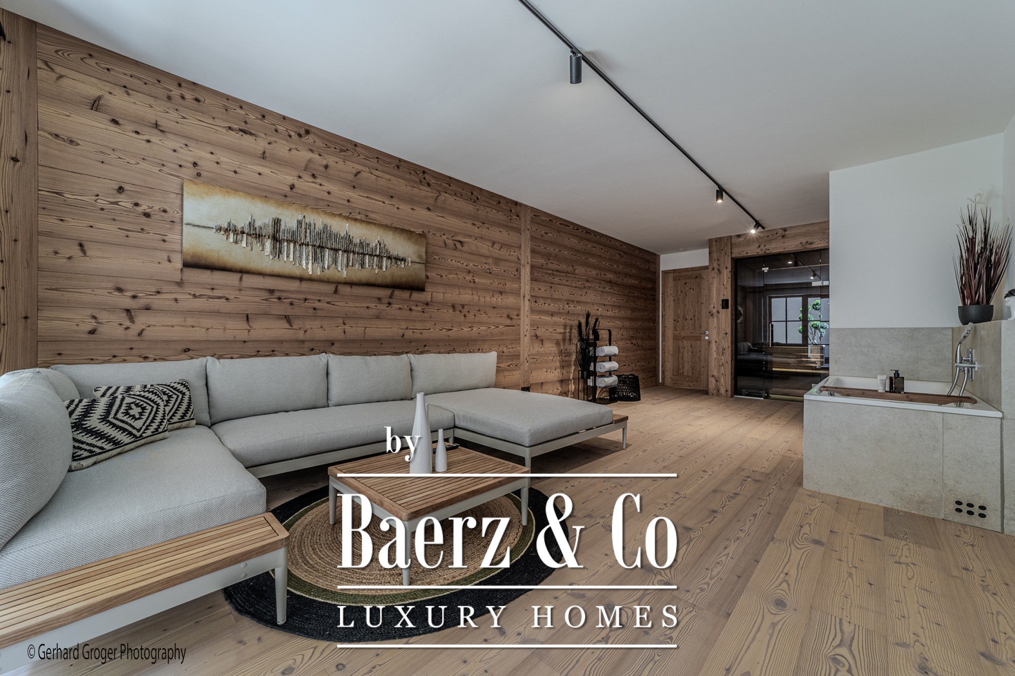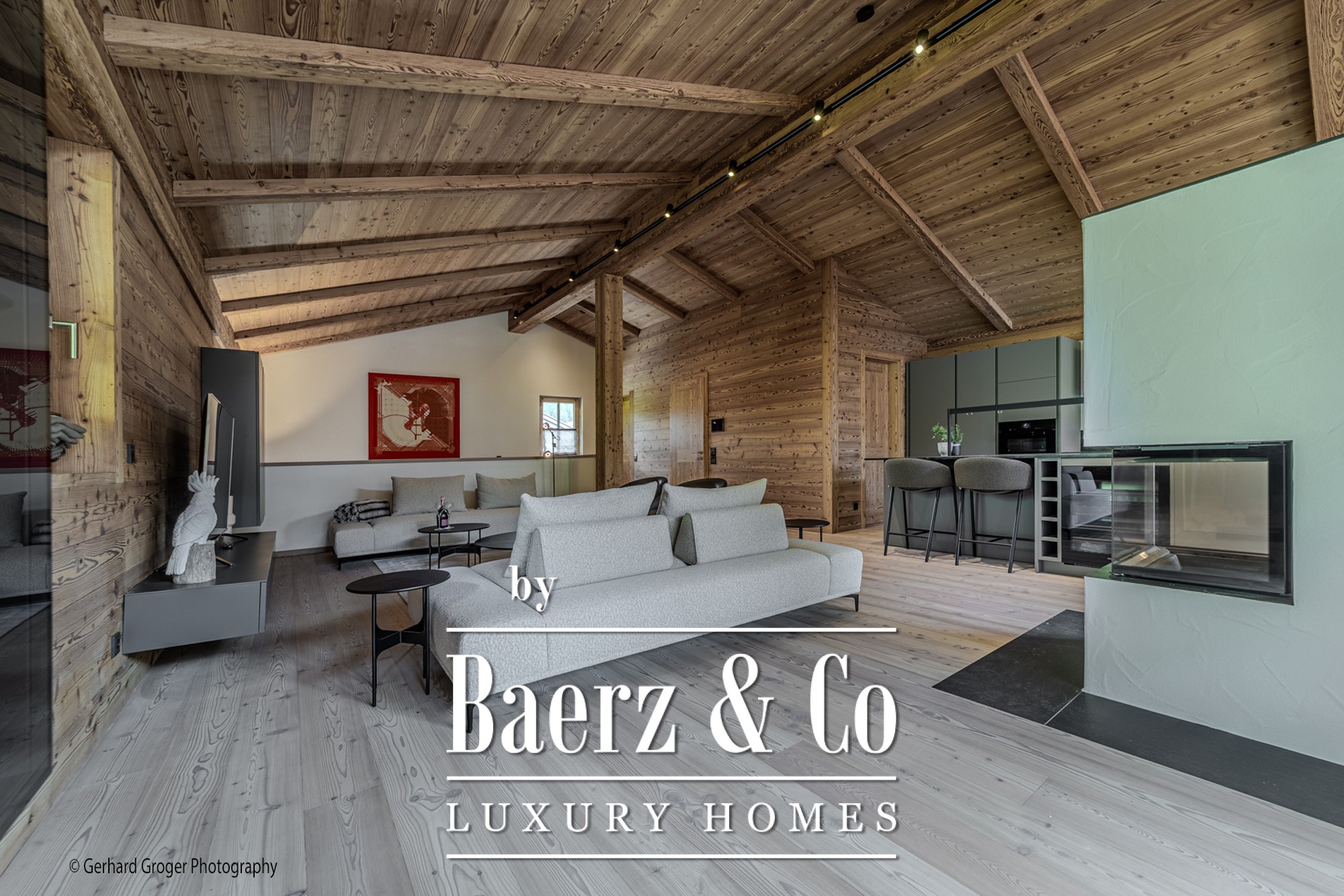 Interiors balance fine larch wood floors with ceramic tiles, underfloor heating, and a high-quality fitted kitchen. Thoughtful amenities, such as a lift, controlled ventilation, a BUS system, underground parking, and ample storage, elevate daily living. The property is a short walk from the heart of Kirchberg and the KitzSki area, blending proximity to vibrant village life with the tranquillity of a mountain setting.