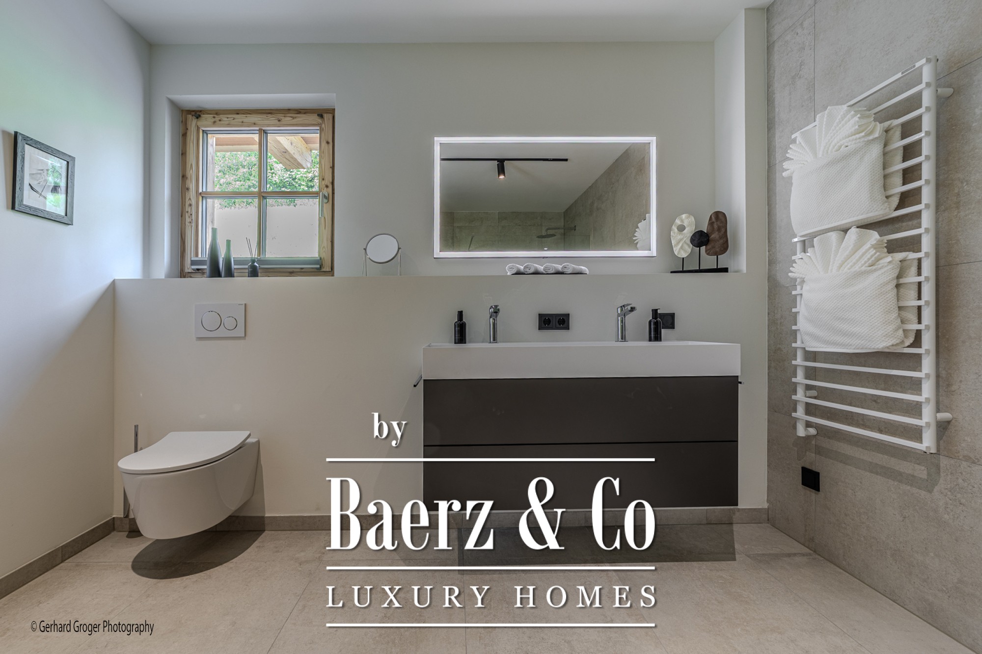 On the basement level, residents will find a secluded bedroom with en-suite bath and an elegant wellness retreat, including a sauna. Two additional bedrooms with private baths are arranged on the ground floor, ensuring comfort for both family and guests. The upper floor offers a light-filled living and dining area, enhanced by an open fireplace and exposed roof trusses, leading out to expansive terraces that frame the alpine panorama.