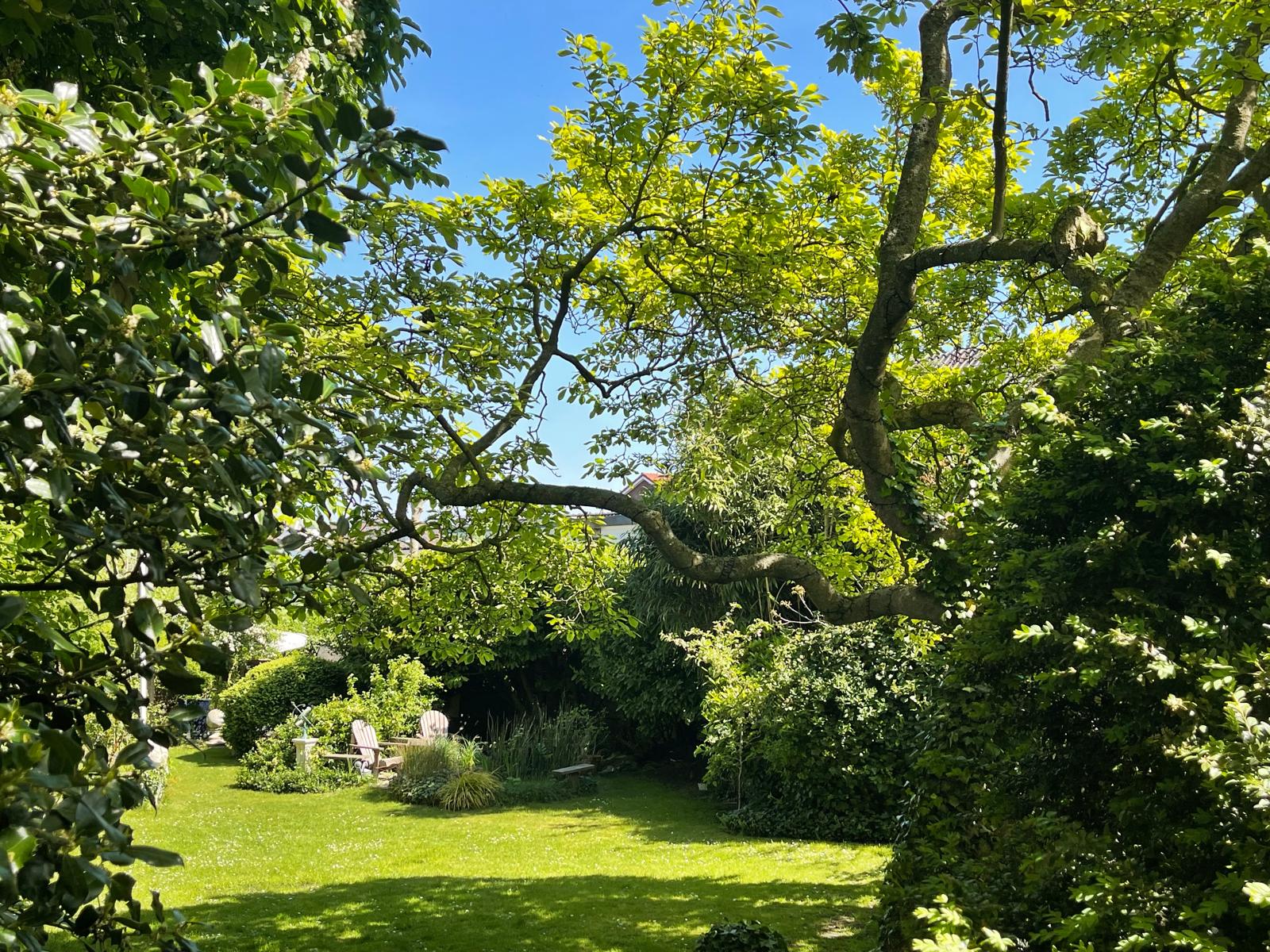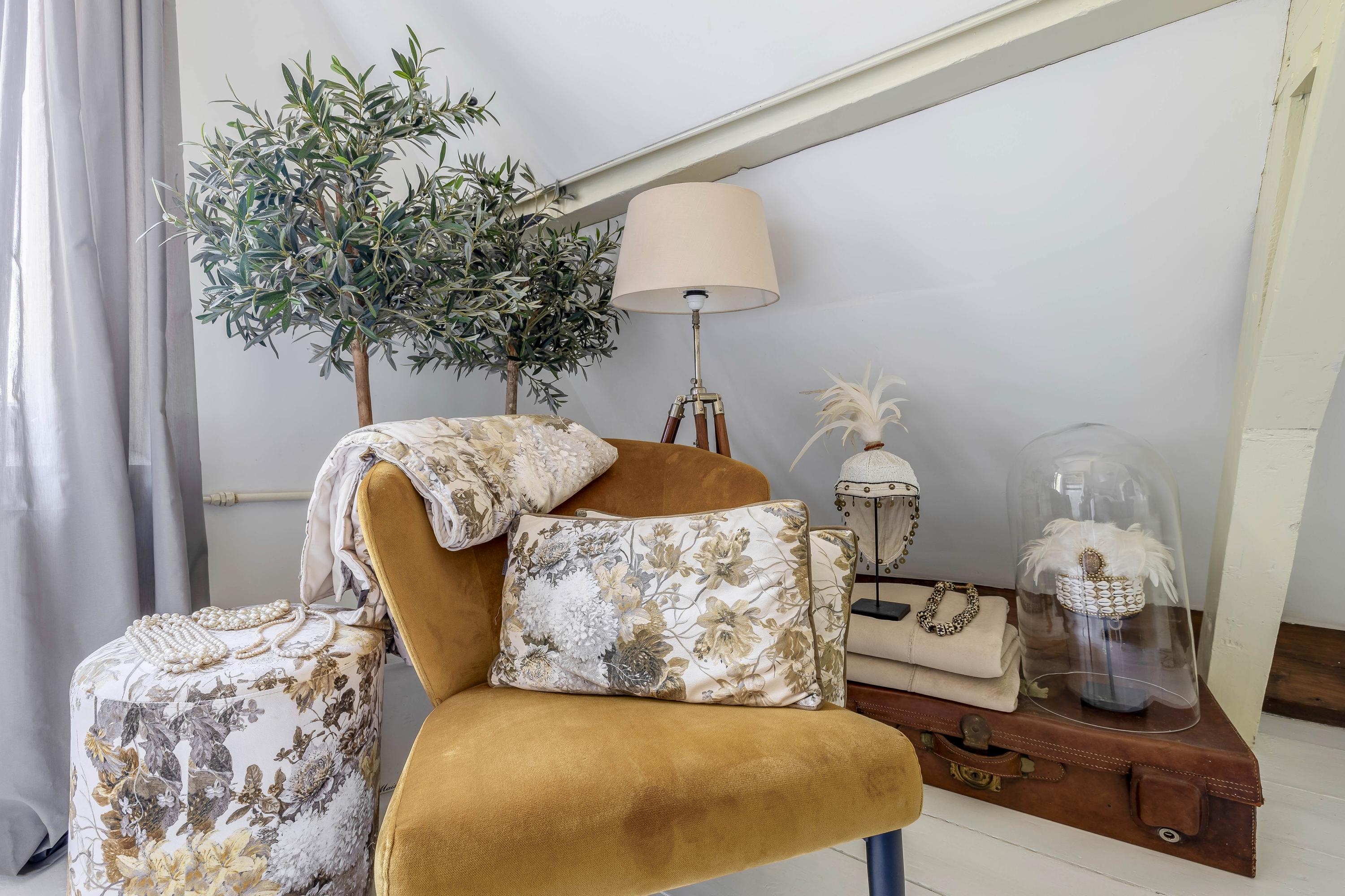 At dike level, you’ll find the charming living room with fireplace and ceiling mural, a dining room connected to the stunning conservatory via sliding doors, a bedroom, and a bathroom with an antique bathtub.