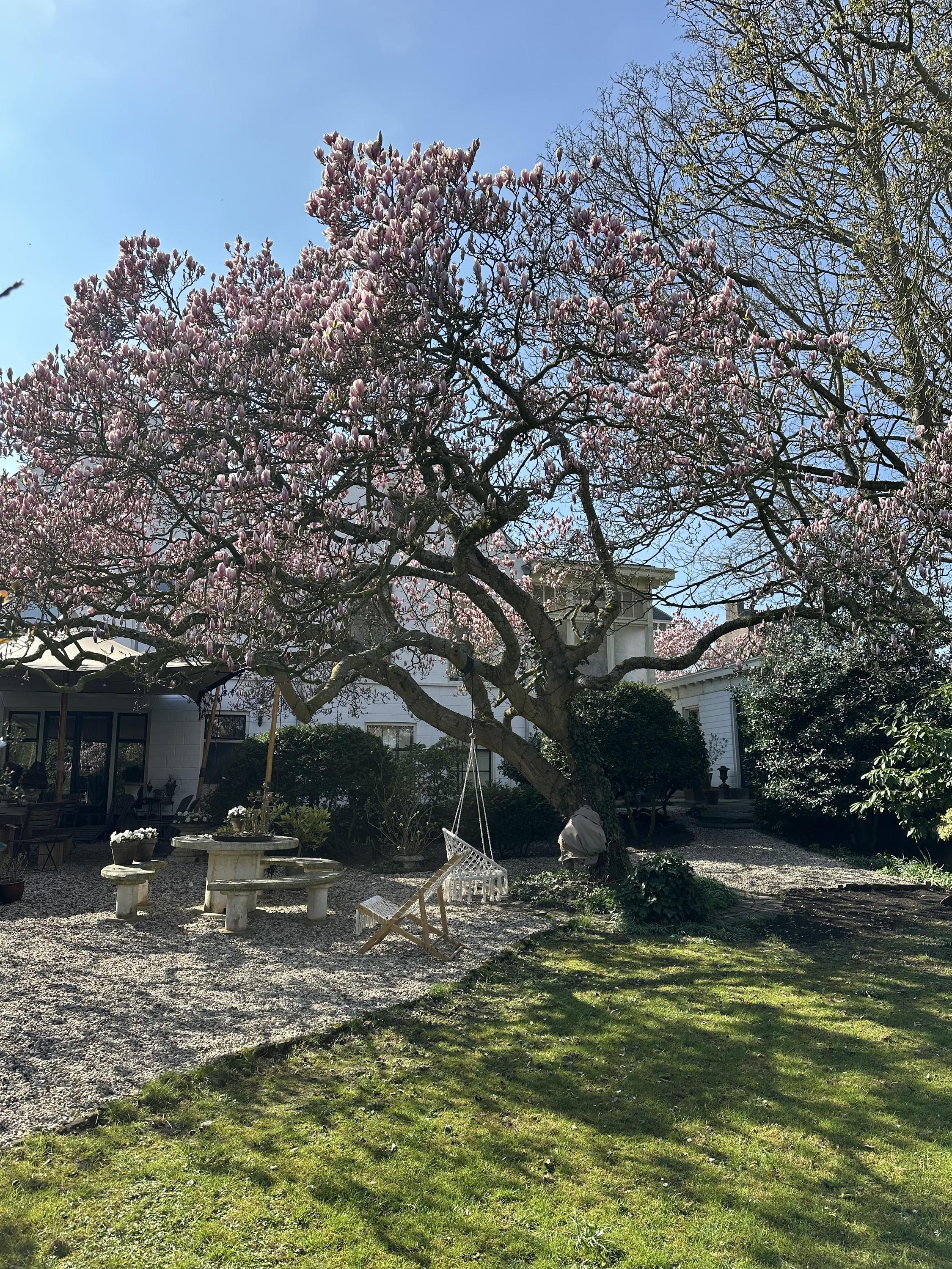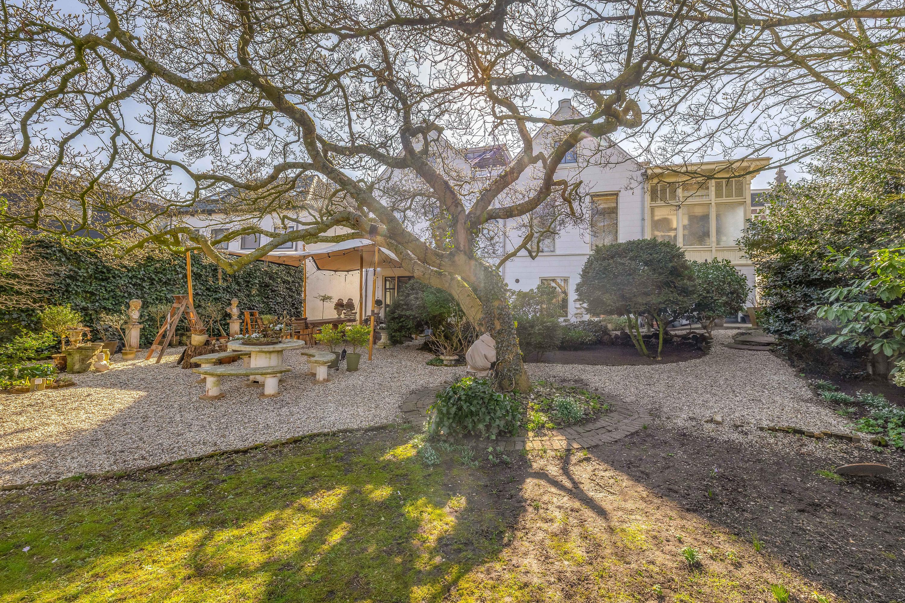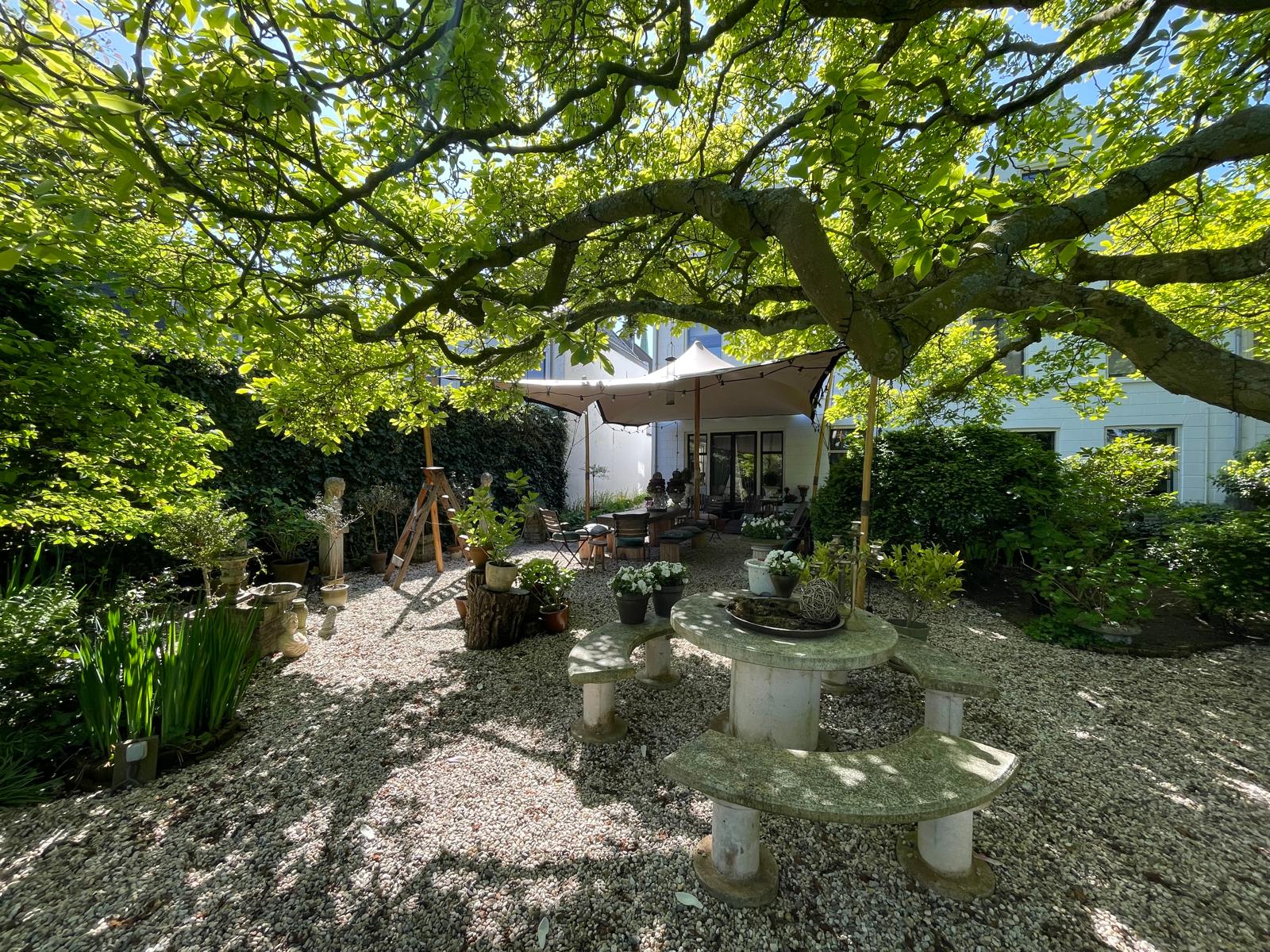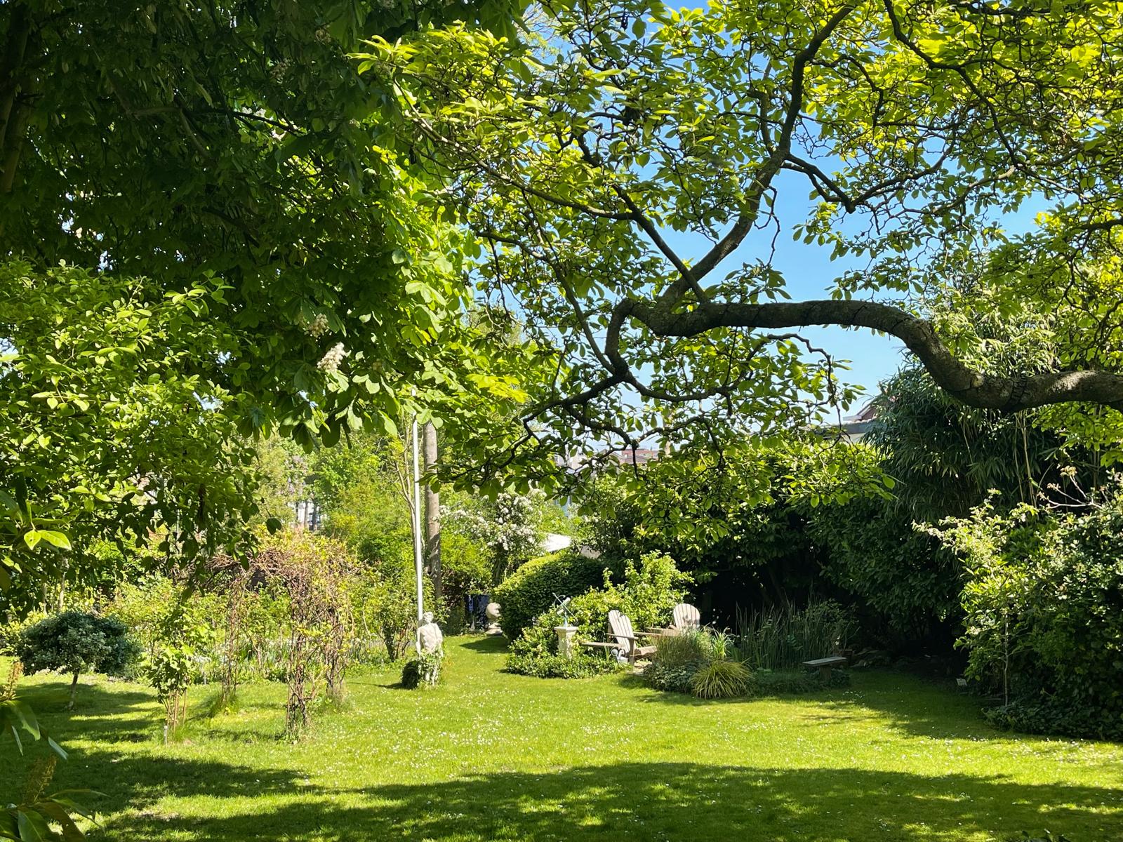 Characterful chestnut trees, winding gravel paths, a pond, and several terraces create a unique experience.