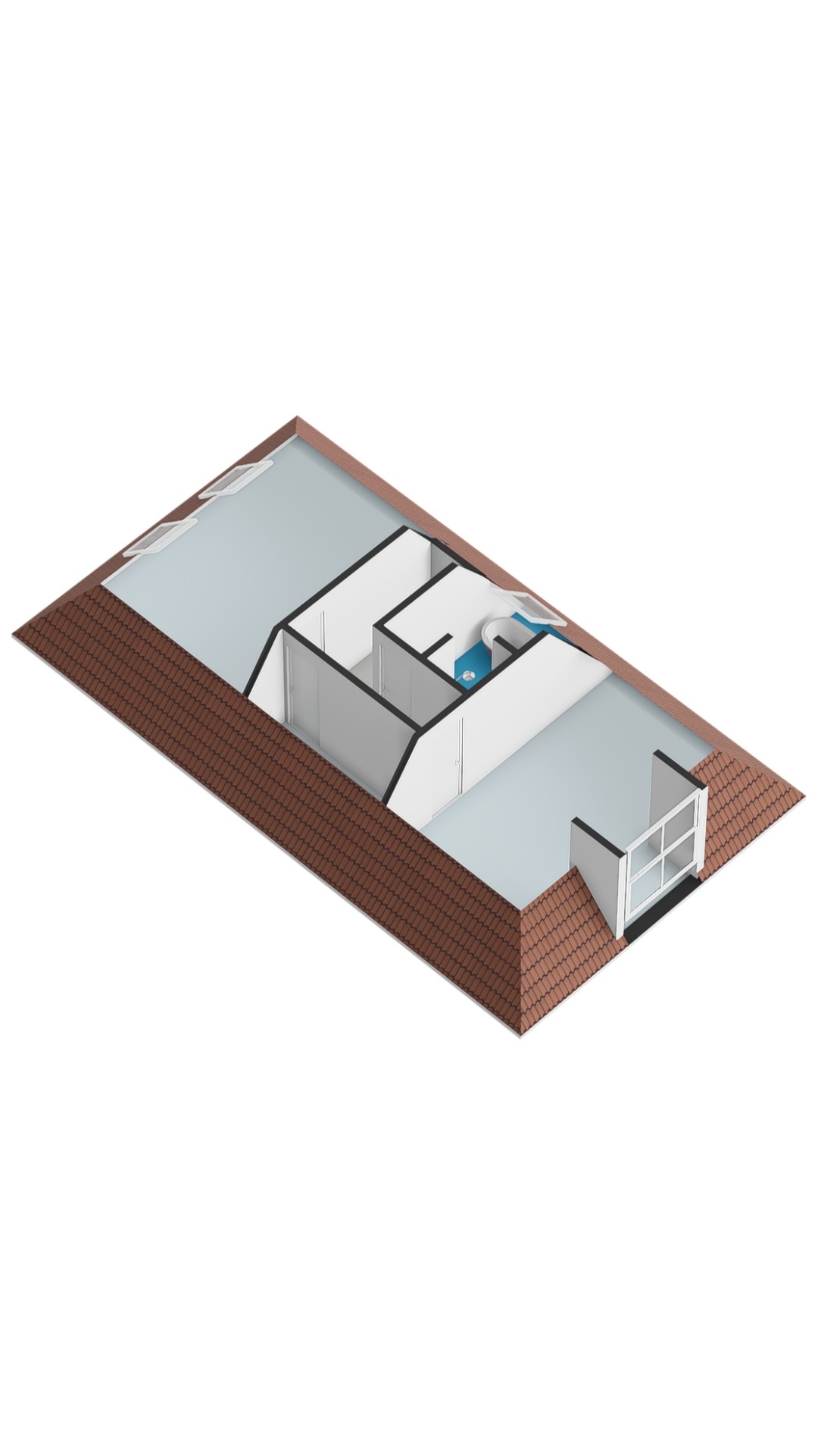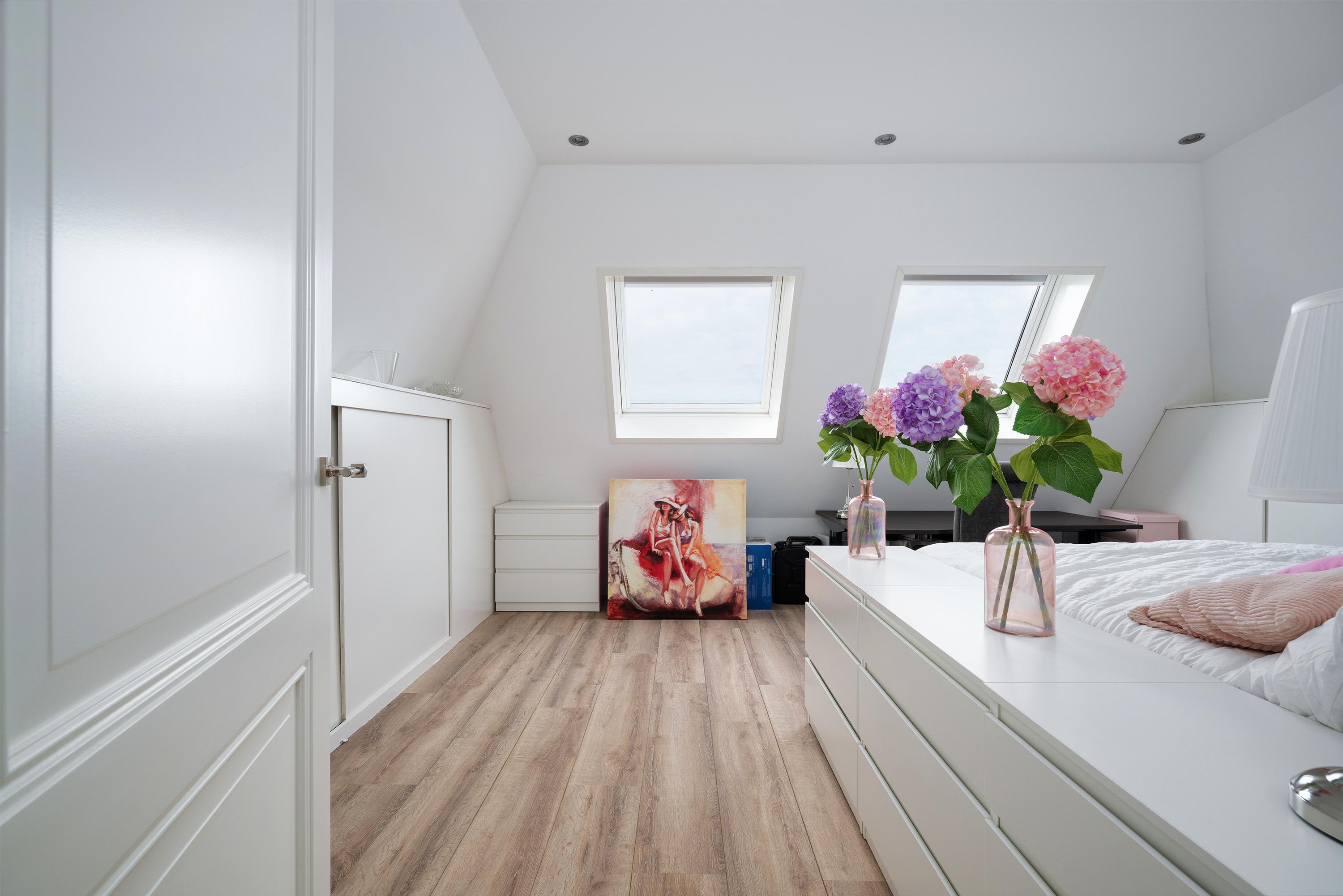 Via the fixed staircase, you reach the second floor. Here you will find two more bedrooms, both with natural light via dormers/roof windows.