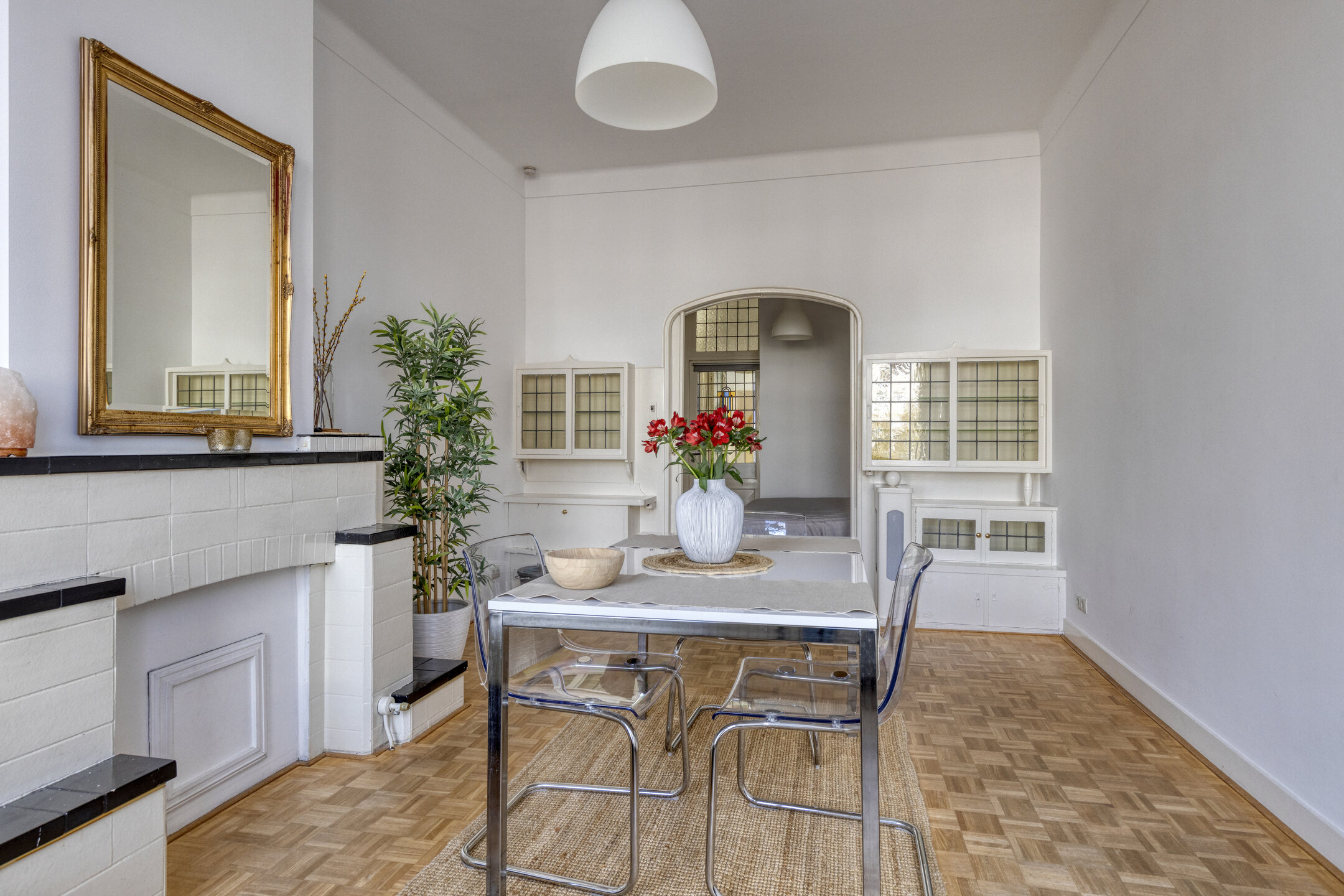 The layout is playful and spacious, spread over several levels. A private entrance at street level leads to the basement, which offers practical space and storage. The living floors contain the kitchen, several bedrooms, and bathrooms, connected by hallways and landings that create a pleasant flow throughout the home. On the top floor, there is a bedroom with direct access to the roof terrace, a wonderful spot offering privacy and views of the historic buildings. There is also a mezzanine that is ideal as a workspace, studio, or additional living space.