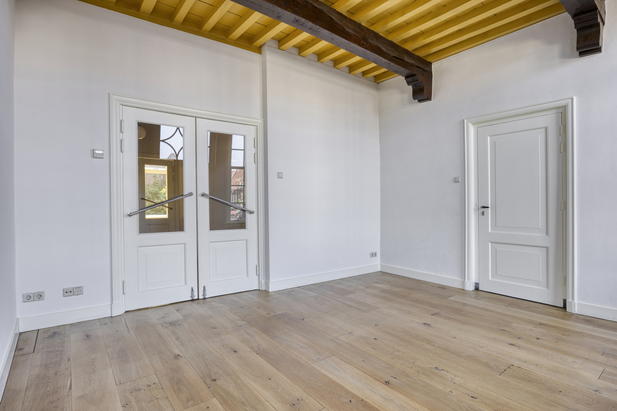Overloop met trap naar de 2e etage. Voorkamer met hoge balkenplafonds en prachtig uitzicht over het Galgewater. Achterkamer met openslaande deuren naar het dakterras.