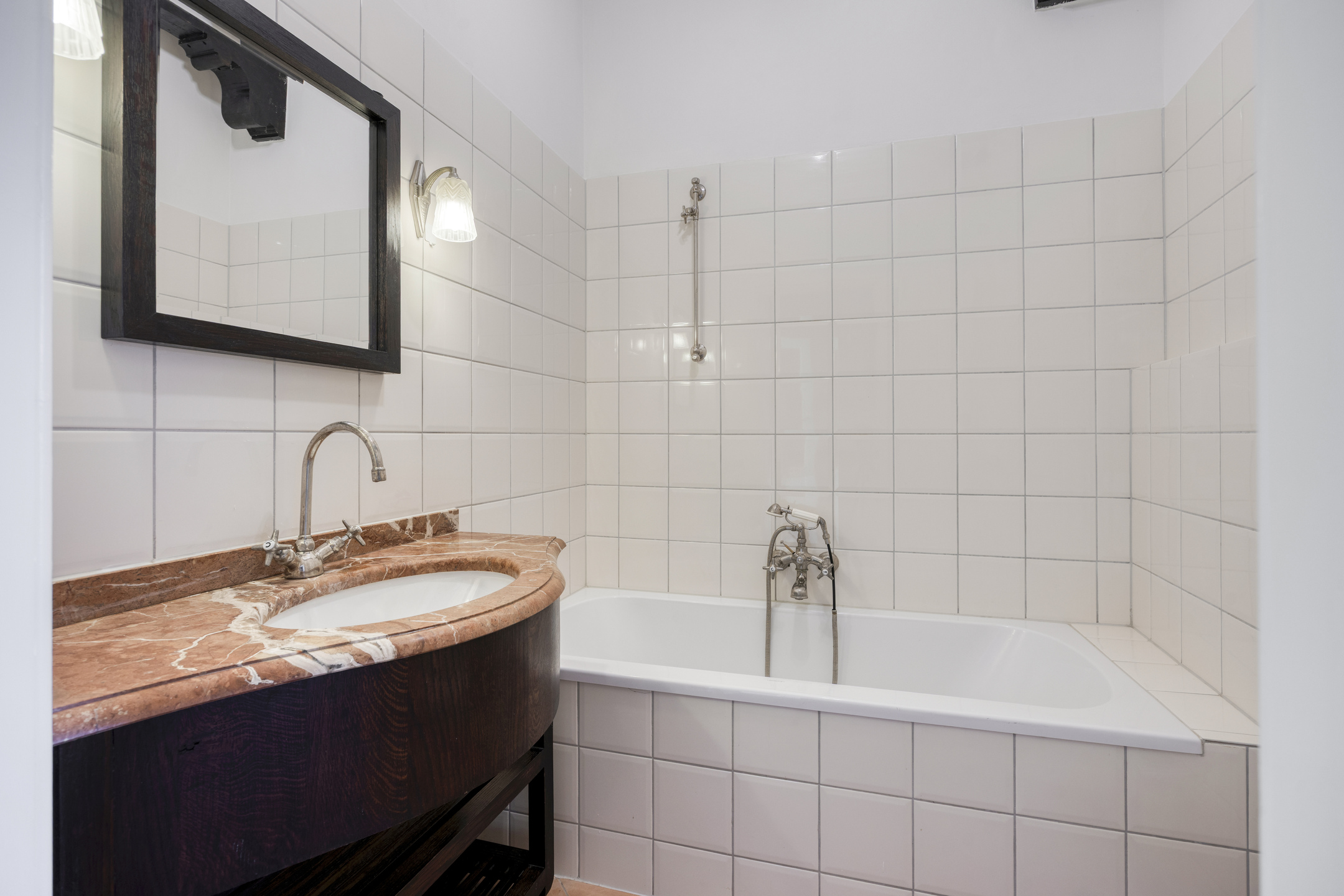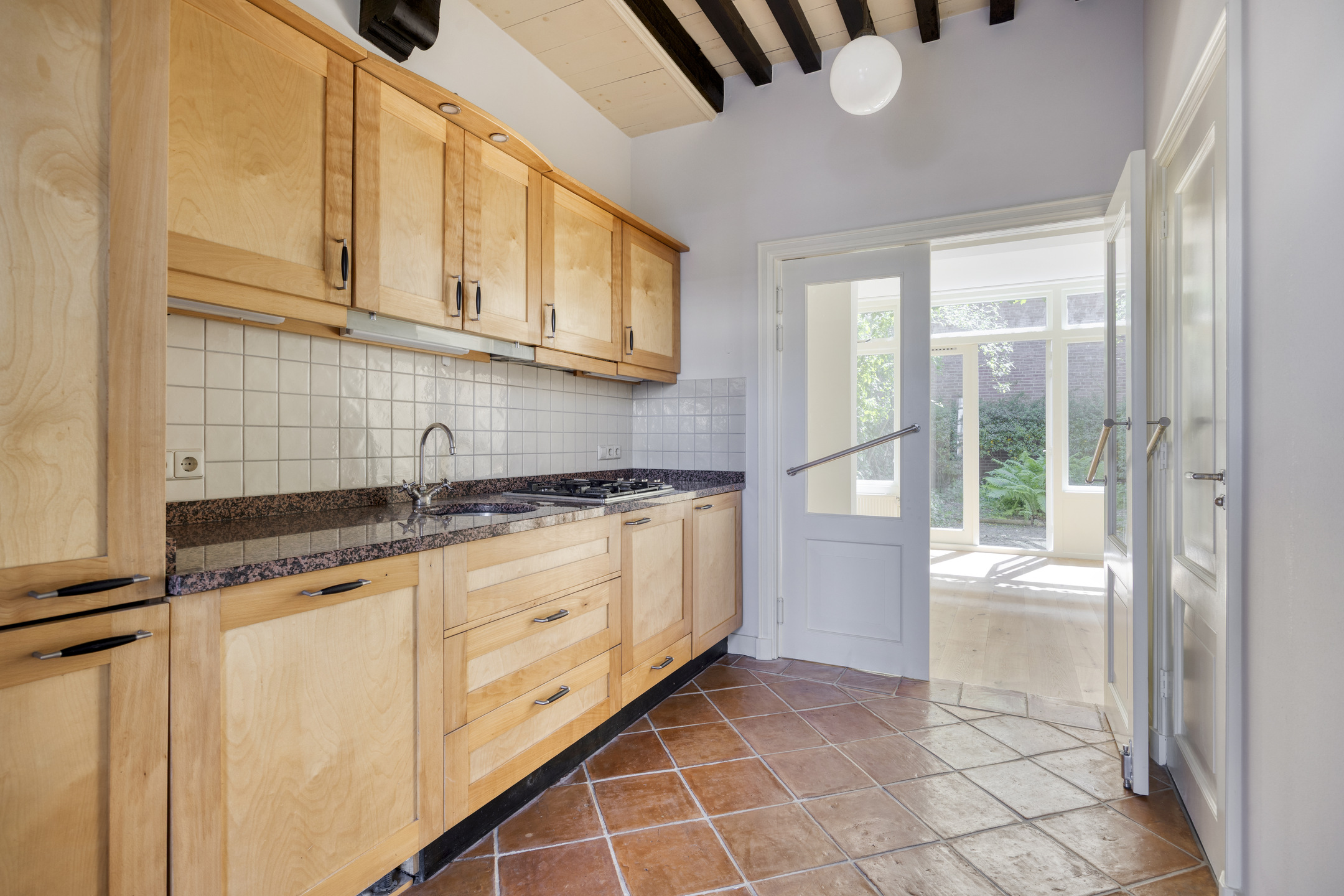 Kamer voorzijde met authentieke details en tuinkamer met openslaande deuren en binnendoor naar nr. 11. Keuken met inbouwapparatuur en badkamer met ligbad. wastafel en wc.