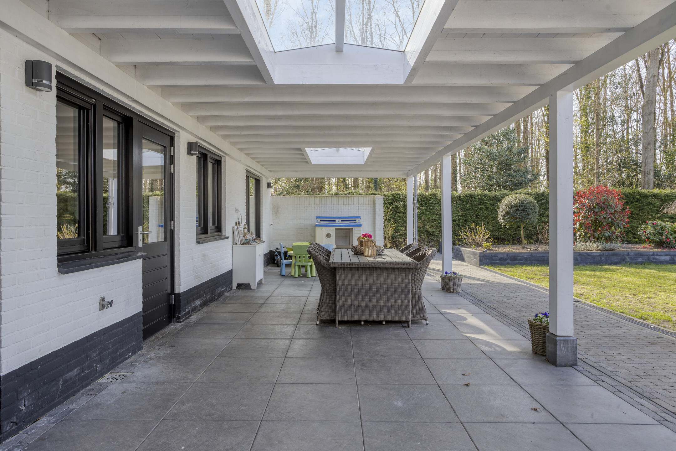 The absolute eye-catcher is the fully insulated outbuilding, finished to a very high standard and offering a wealth of possibilities. With a footprint (including veranda) of approximately 124 m², it is divided into several practical and luxurious spaces.
