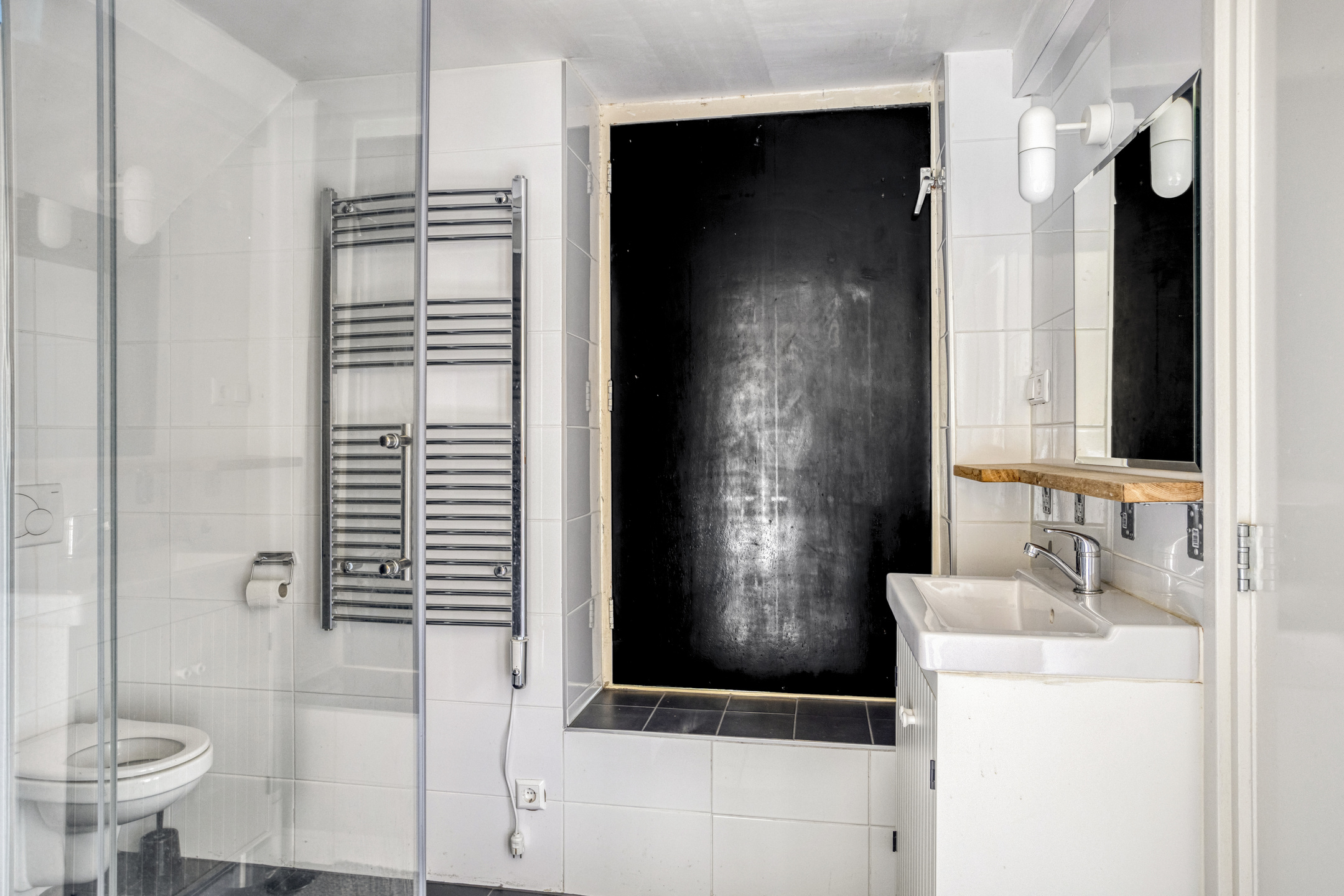 royale badkamer voorzien van een 2-persoonsligbad, inloopdouche, infraroodpaneel, badkamermeubel met dubbele wastafel, elektrische designradiator, dakkapel en vloerverwarming;