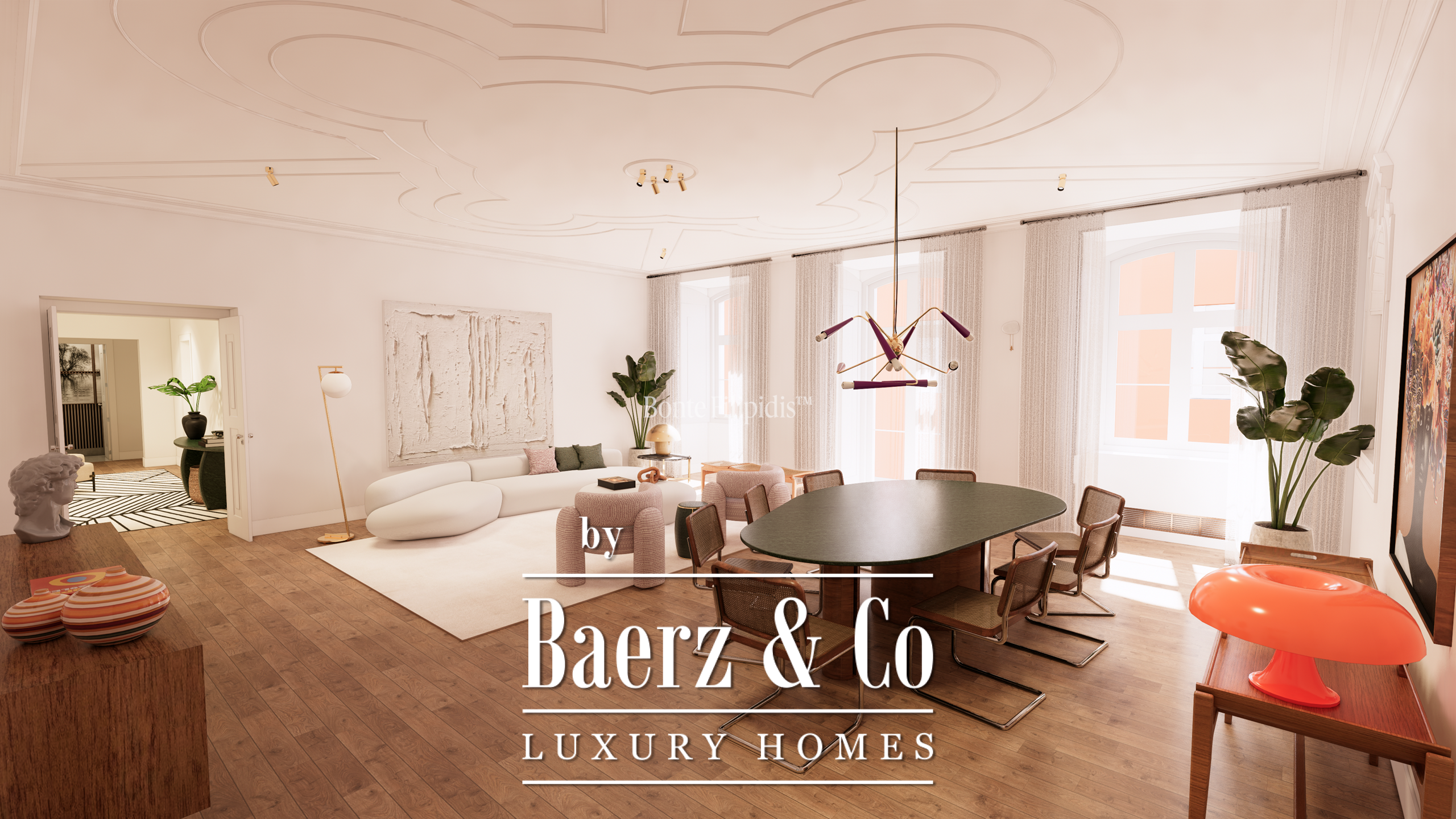 Apartment Estrela places you two hundred meters from the Tagus River, positioned at the crossroads of Lapa and Santos, within the meticulously restored Palácio de Schindler. This apartment with 221 m² of living space invites a refined Lisbon lifestyle, its three bedrooms offering quiet sanctuary amidst city life. The interiors are poised between heritage and modernity, with solid wood floors grounding airy, open rooms and marble-finished bathrooms enhancing a subtle sense of luxury. Air conditioning and central heating carry comfort from season to season.