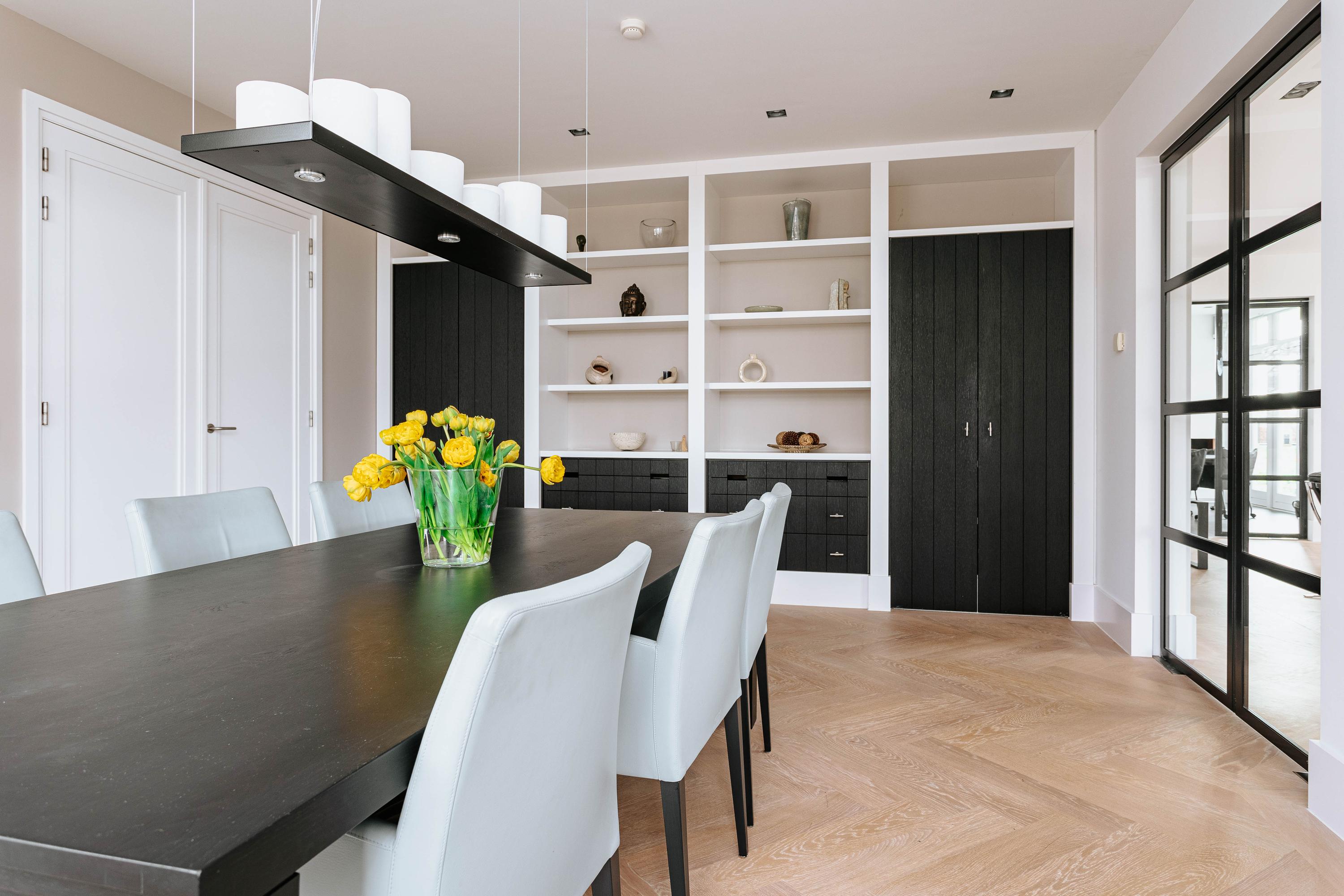 At the front of the house is the large luxury kitchen, equipped with a sink island and luxury built-in appliances, a gas fireplace, and French doors to the terrace. The large, cozy living room also has a gas fireplace, French doors to the terrace, and access to the kitchen and the spacious, cozy dining room through steel revolving doors. Hidden behind a door in the hall is the luxurious trio of bedroom, dressing room, and bathroom. This spacious master bedroom with gas fireplace overlooks and has access to the garden. There is also a separate toilet.